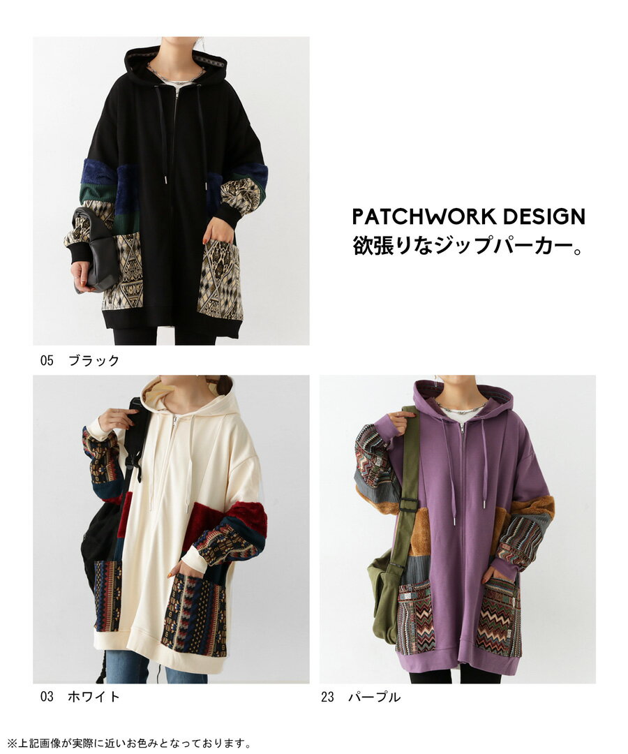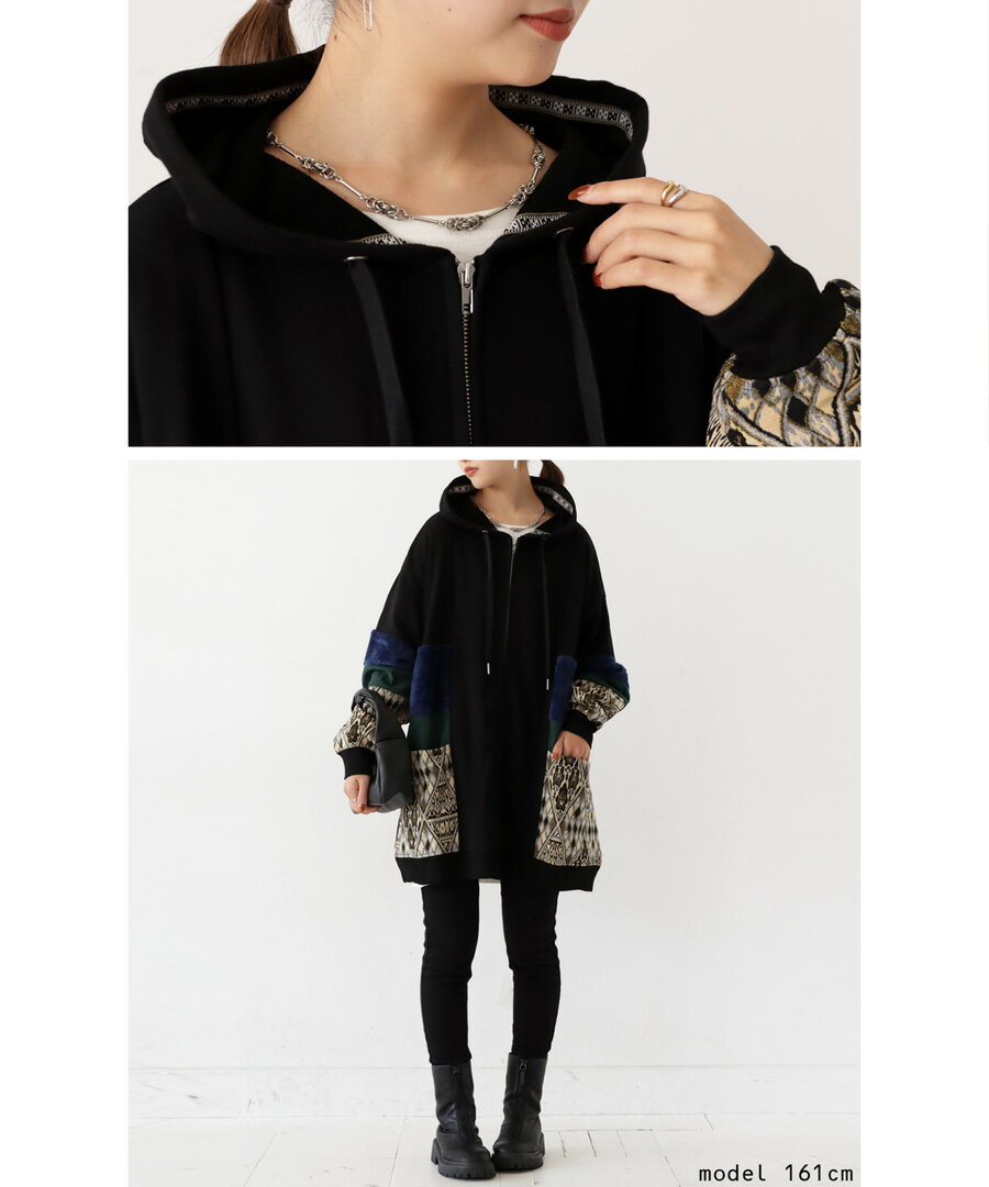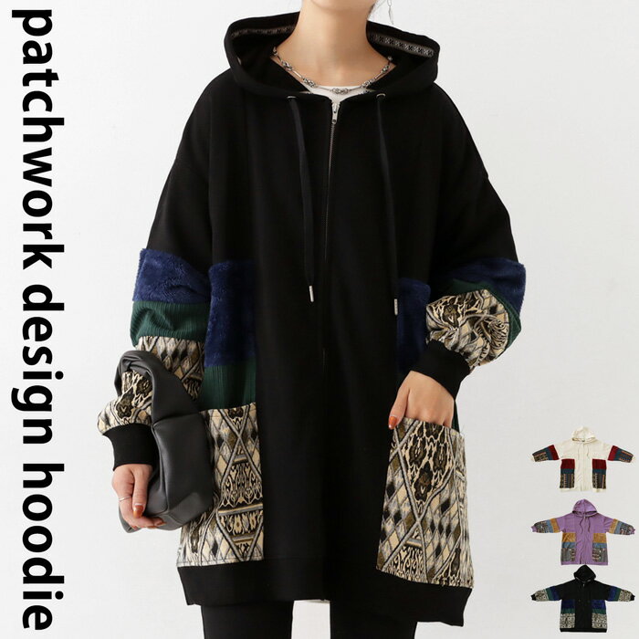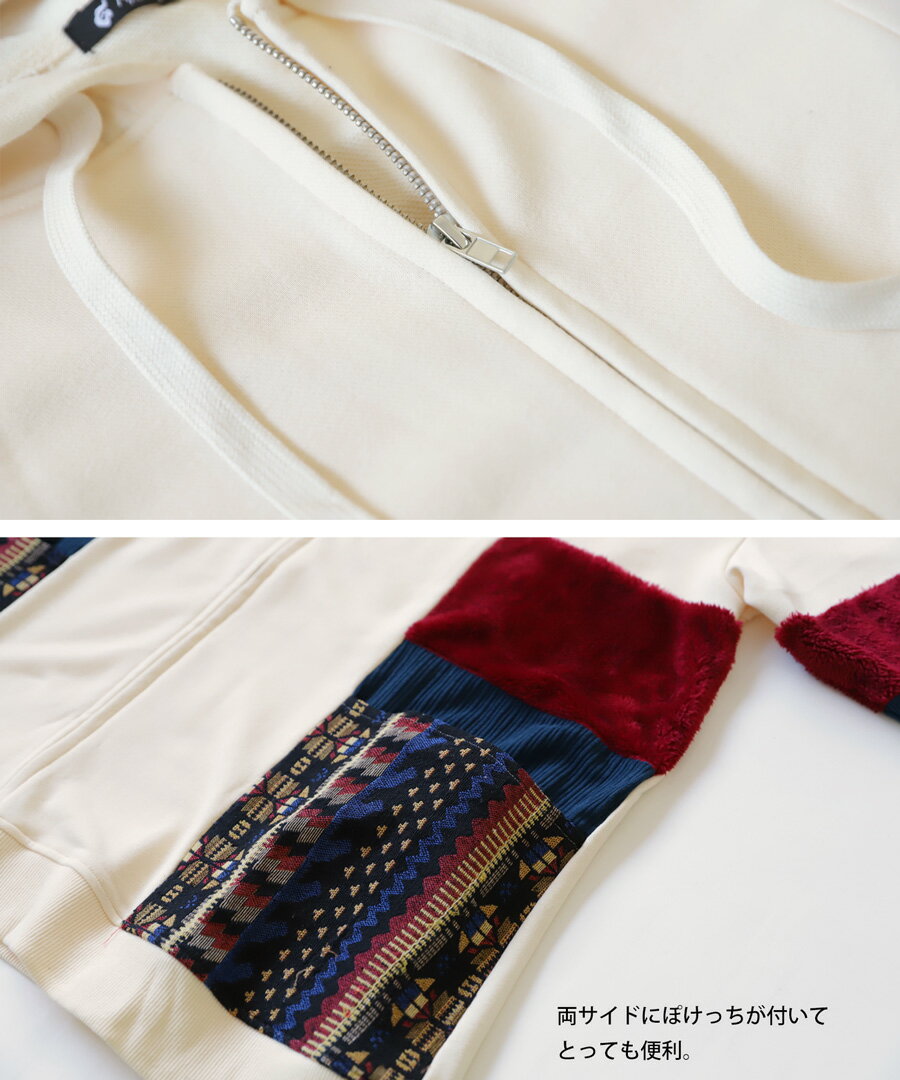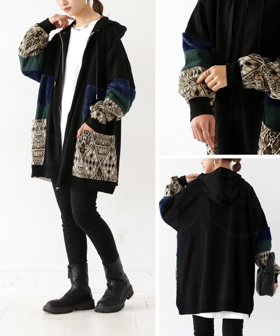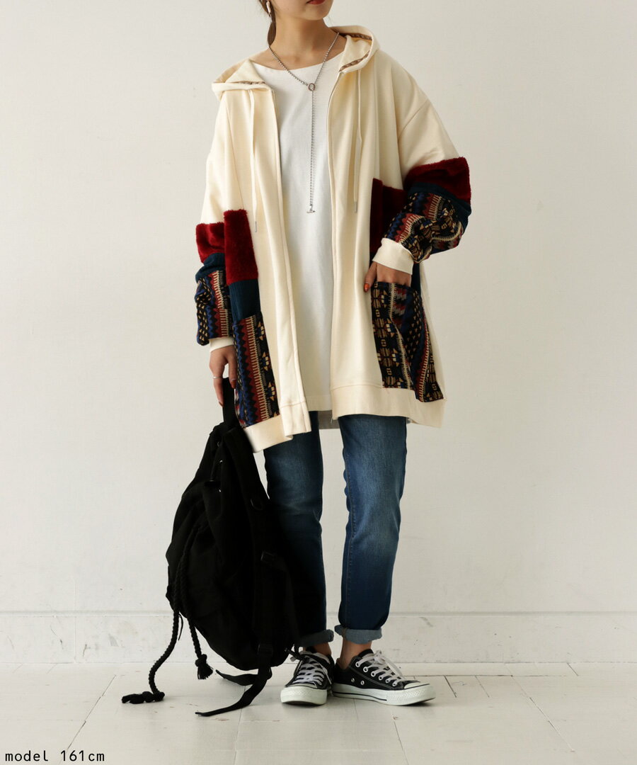 トップス アウター 異素材 パーカー パッチワーク コーデュロイ ネイティブ柄 前後差 ラウンドヘム スリット 秋冬 ボリューム ゆったり ナチュラル カジュアル レトロ ヴィンテージ 大人 レディース おしゃれ 誕生日 プレゼント AminaCollection
