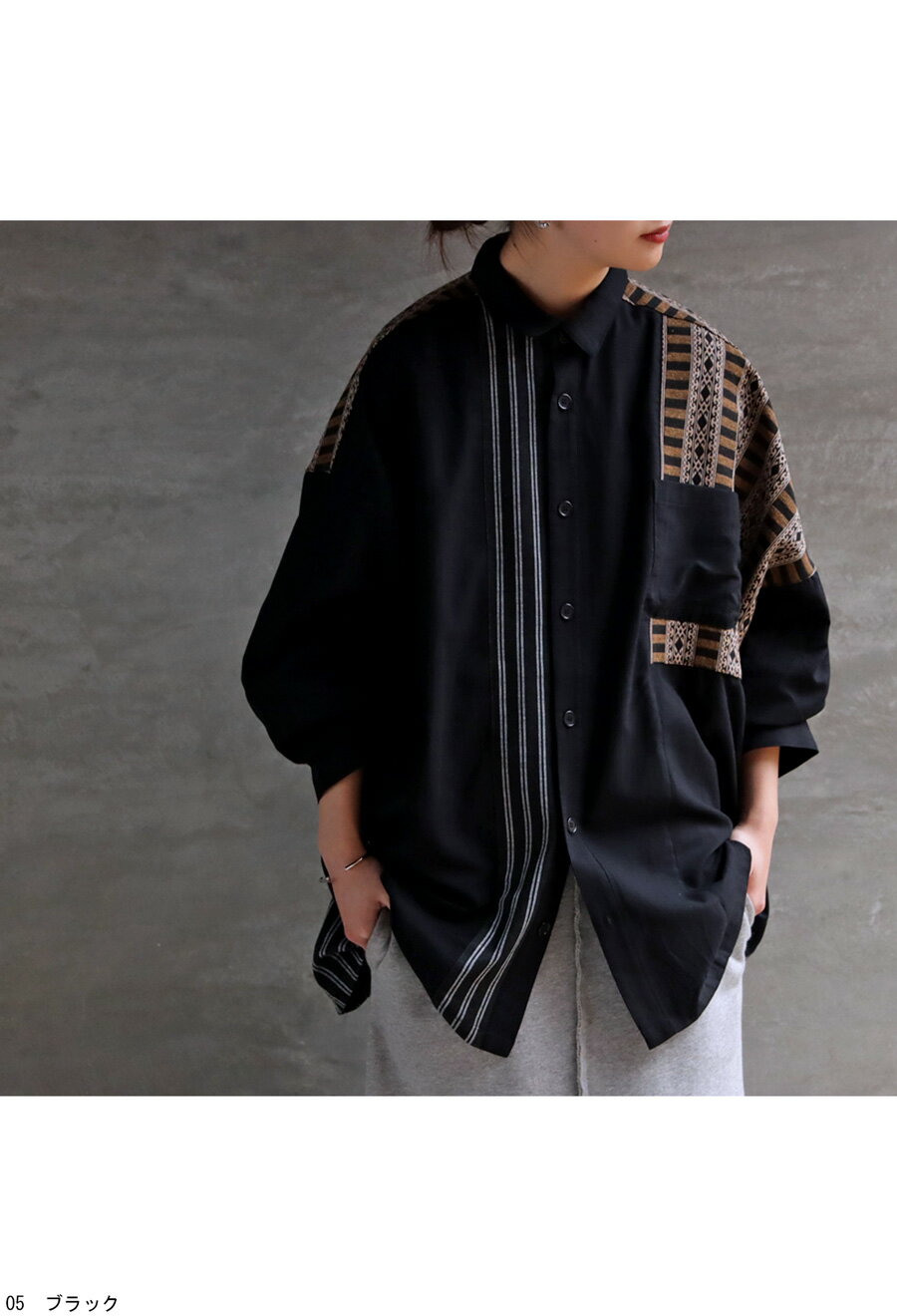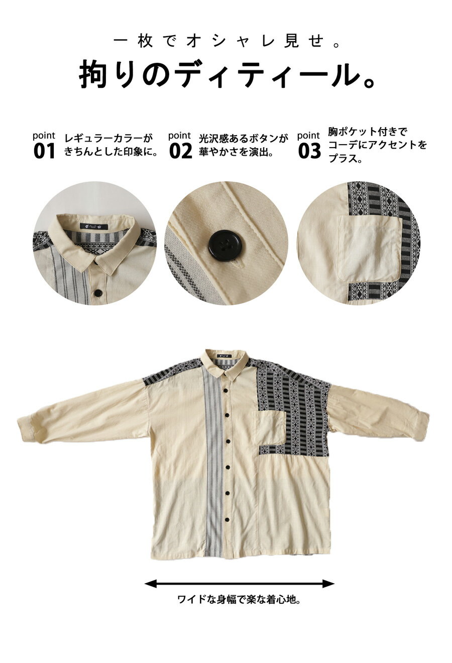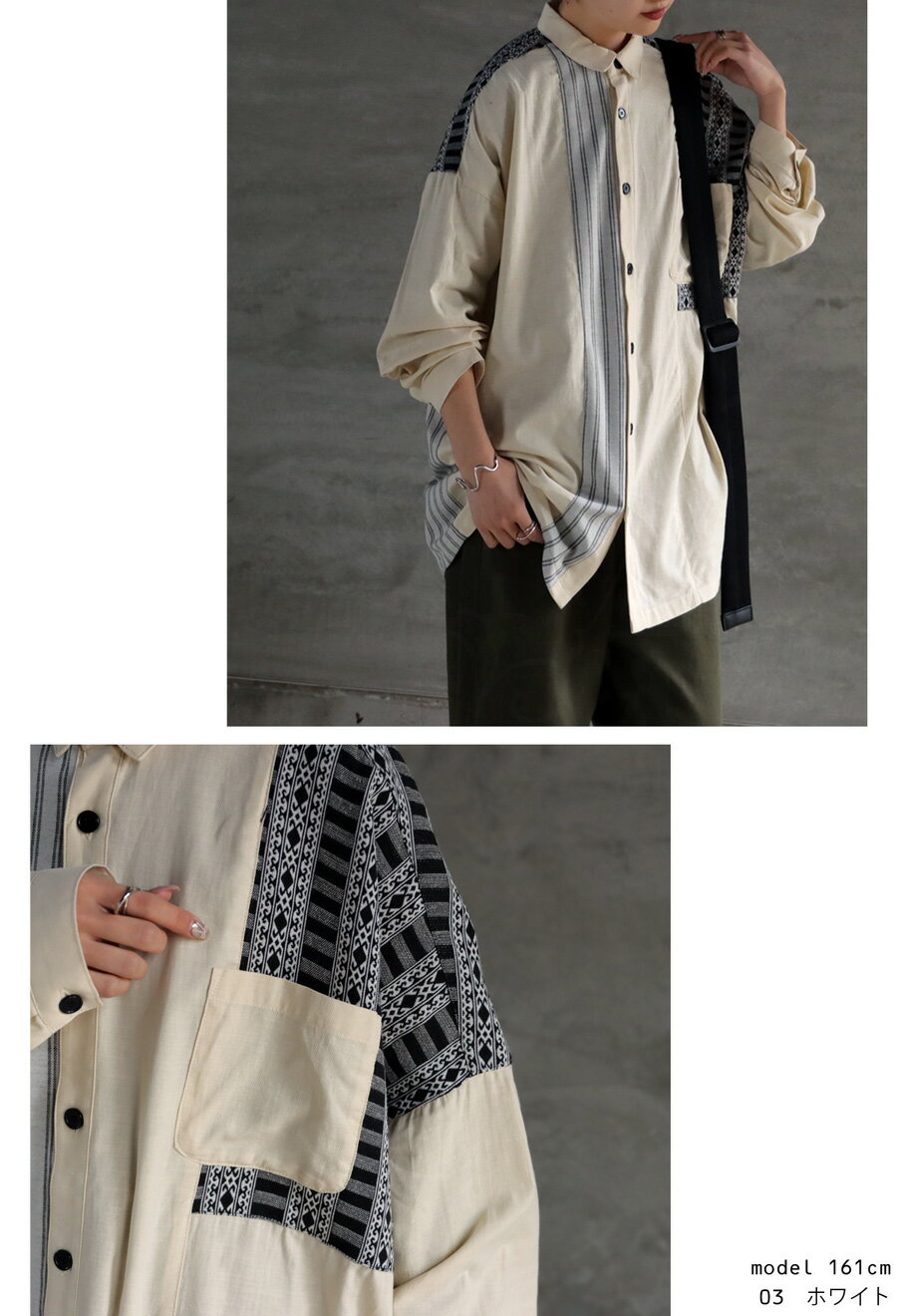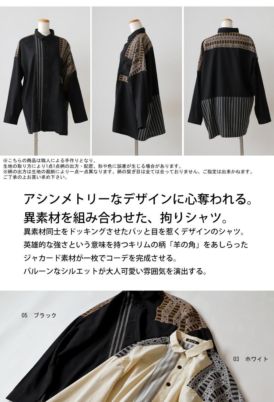 トップス シャツ 羽織り 異素材 パッチワーク 綿100% コットン バルーン キリム柄 ジャガード アシメトリー ボリューム ワイド ゆったり ナチュラル カジュアル レトロ ヴィンテージ 大人 レディース おしゃれ 誕生日 プレゼント AminaCollection