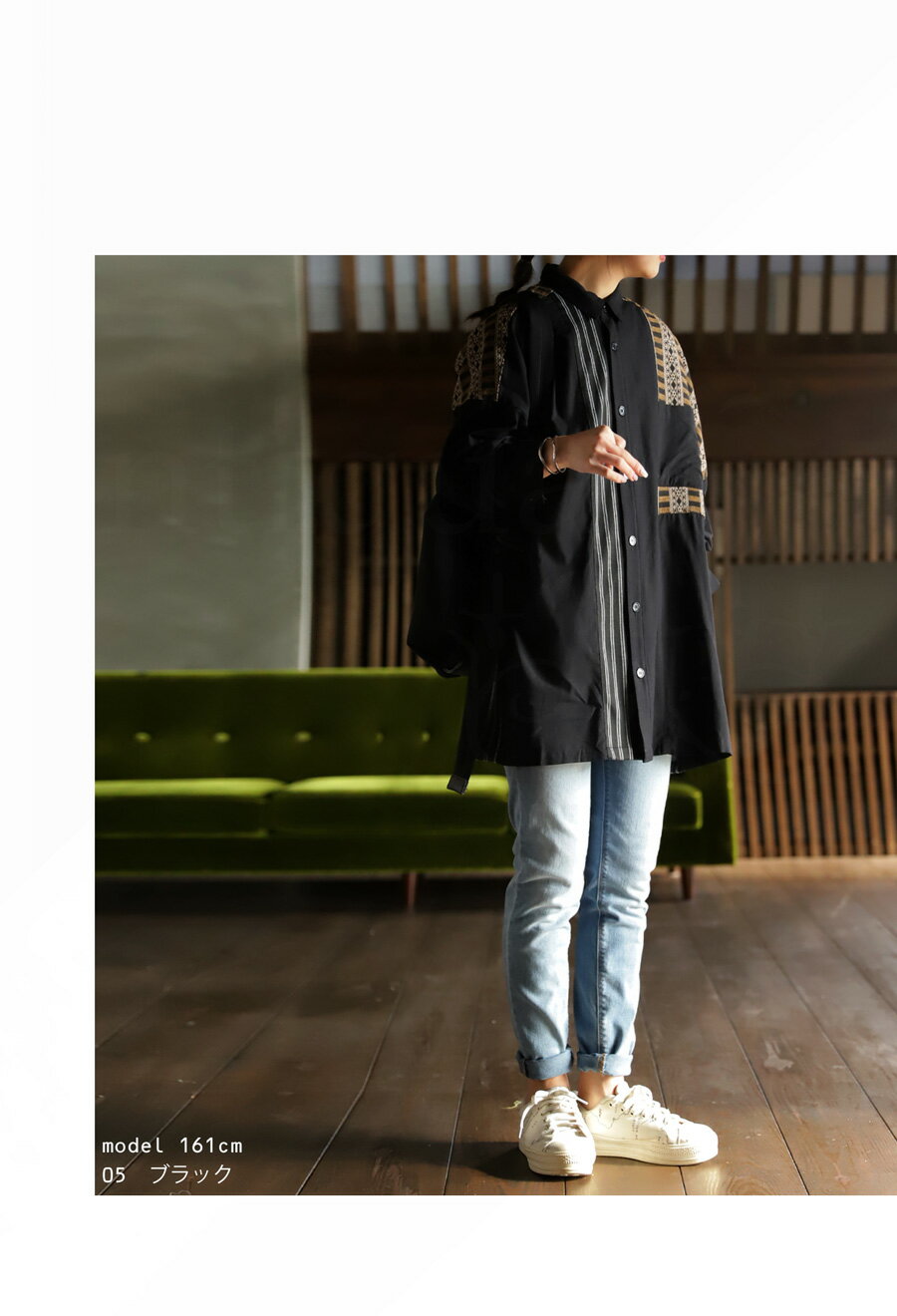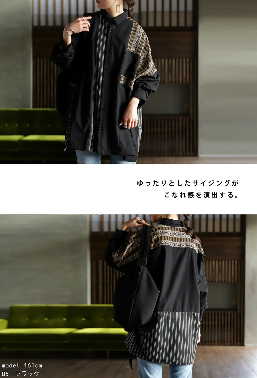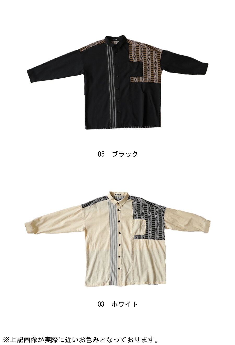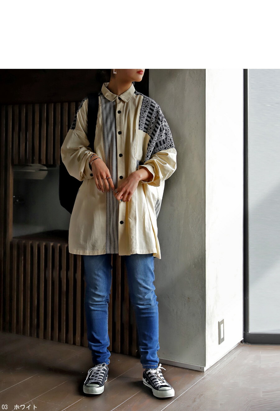 トップス シャツ 羽織り 異素材 パッチワーク 綿100% コットン バルーン キリム柄 ジャガード アシメトリー ボリューム ワイド ゆったり ナチュラル カジュアル レトロ ヴィンテージ 大人 レディース おしゃれ 誕生日 プレゼント AminaCollection