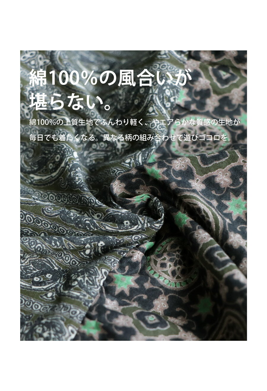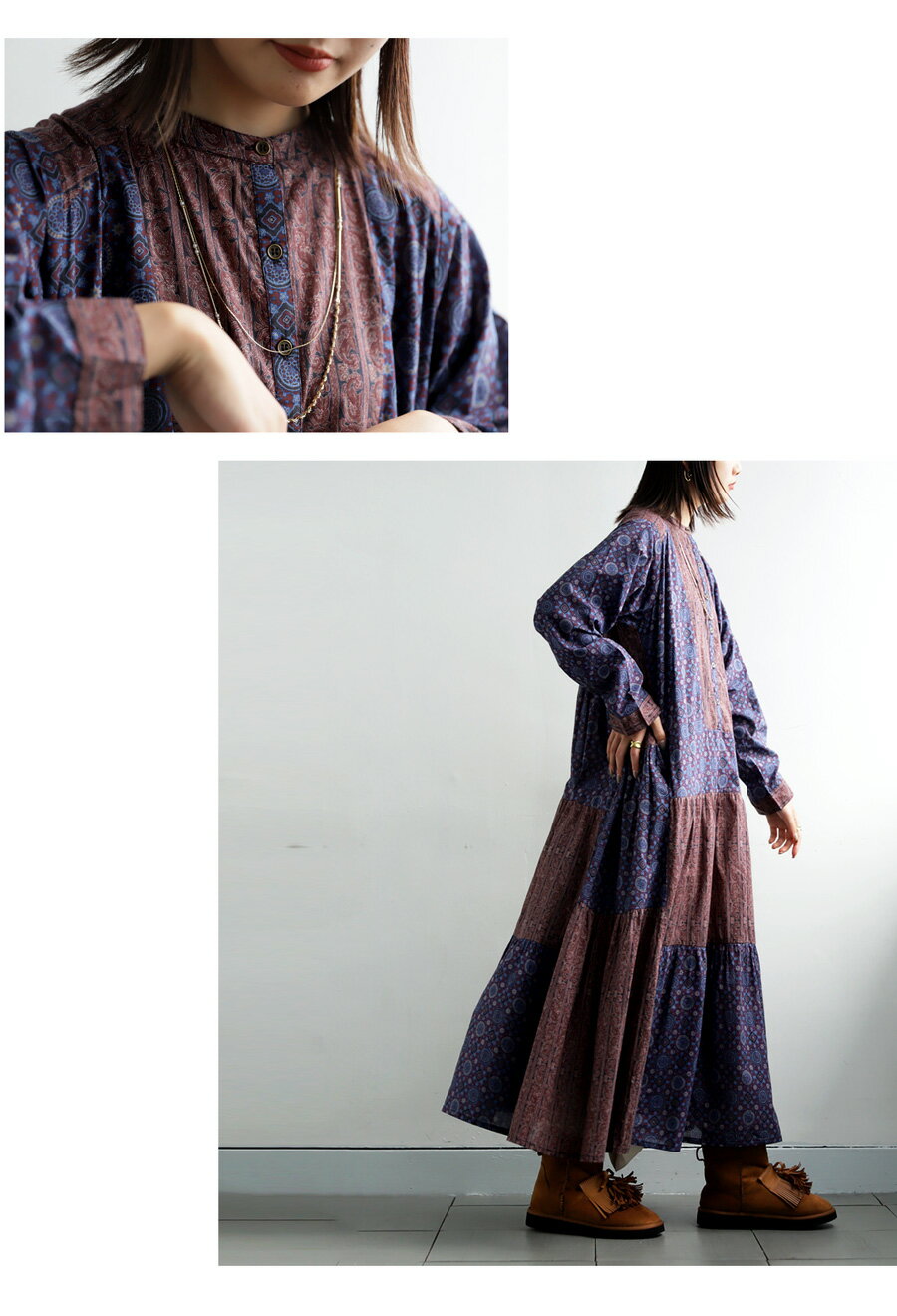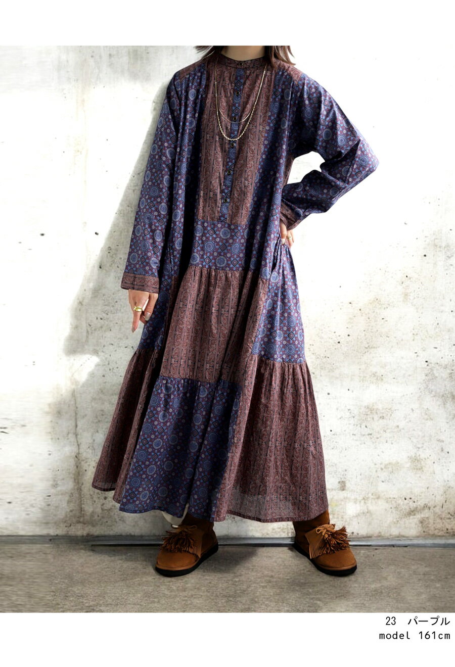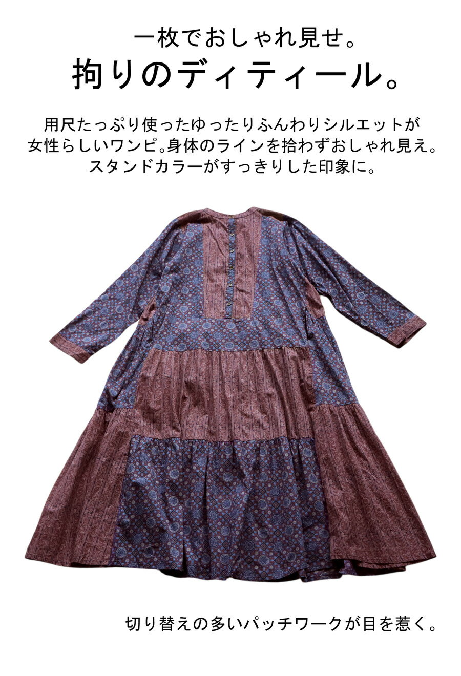 トップス ワンピース ワンピ 長袖 ロング ロングワンピ レーヨン 綿100% コットン ペイズリー柄 アジュラック柄 総柄 ギャザー パッチワーク ゆったり ナチュラル カジュアル レトロ 大人 レディース おしゃれ 誕生日 プレゼント AminaCollection