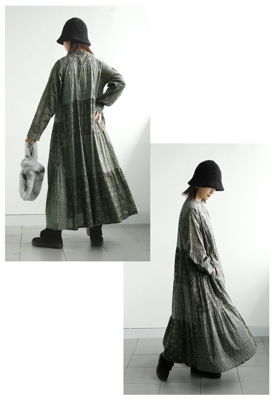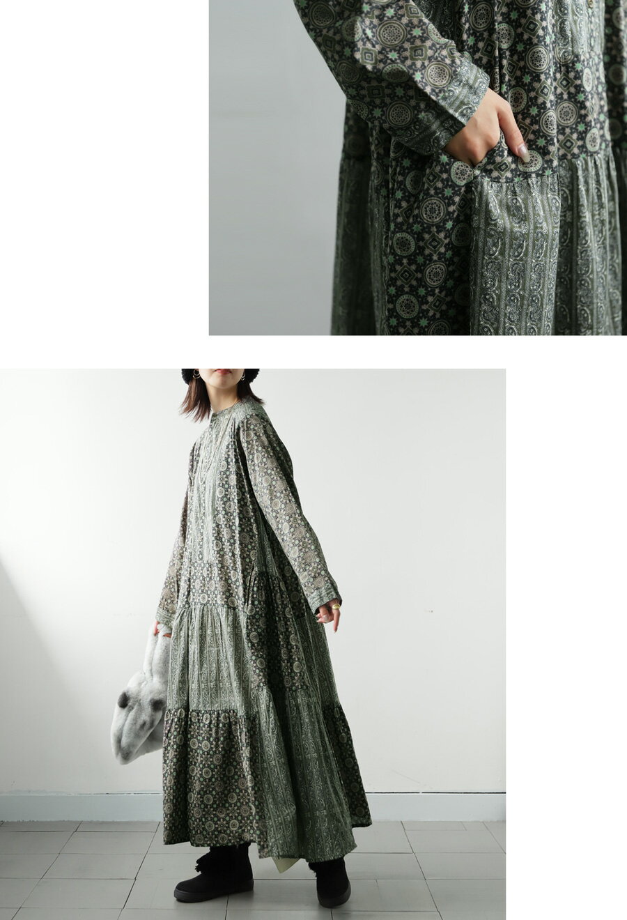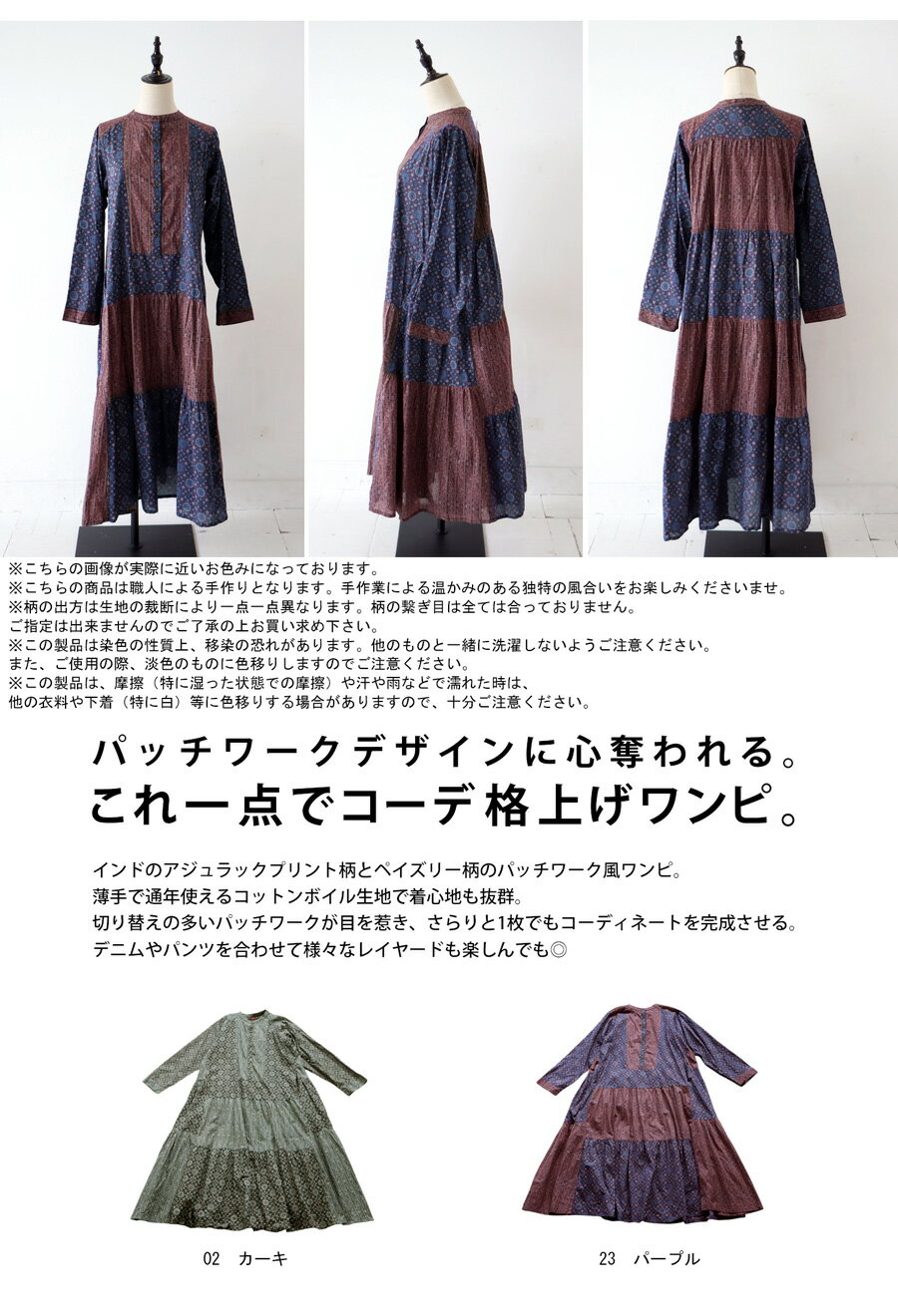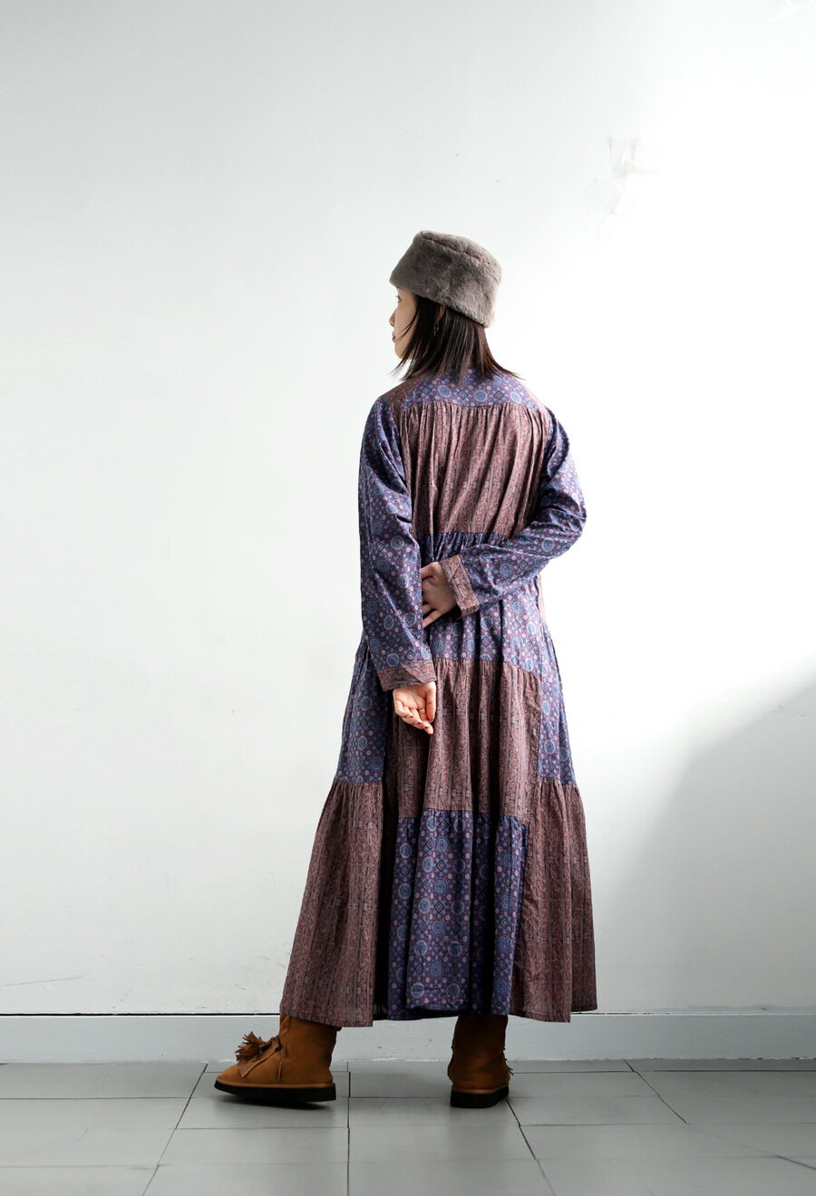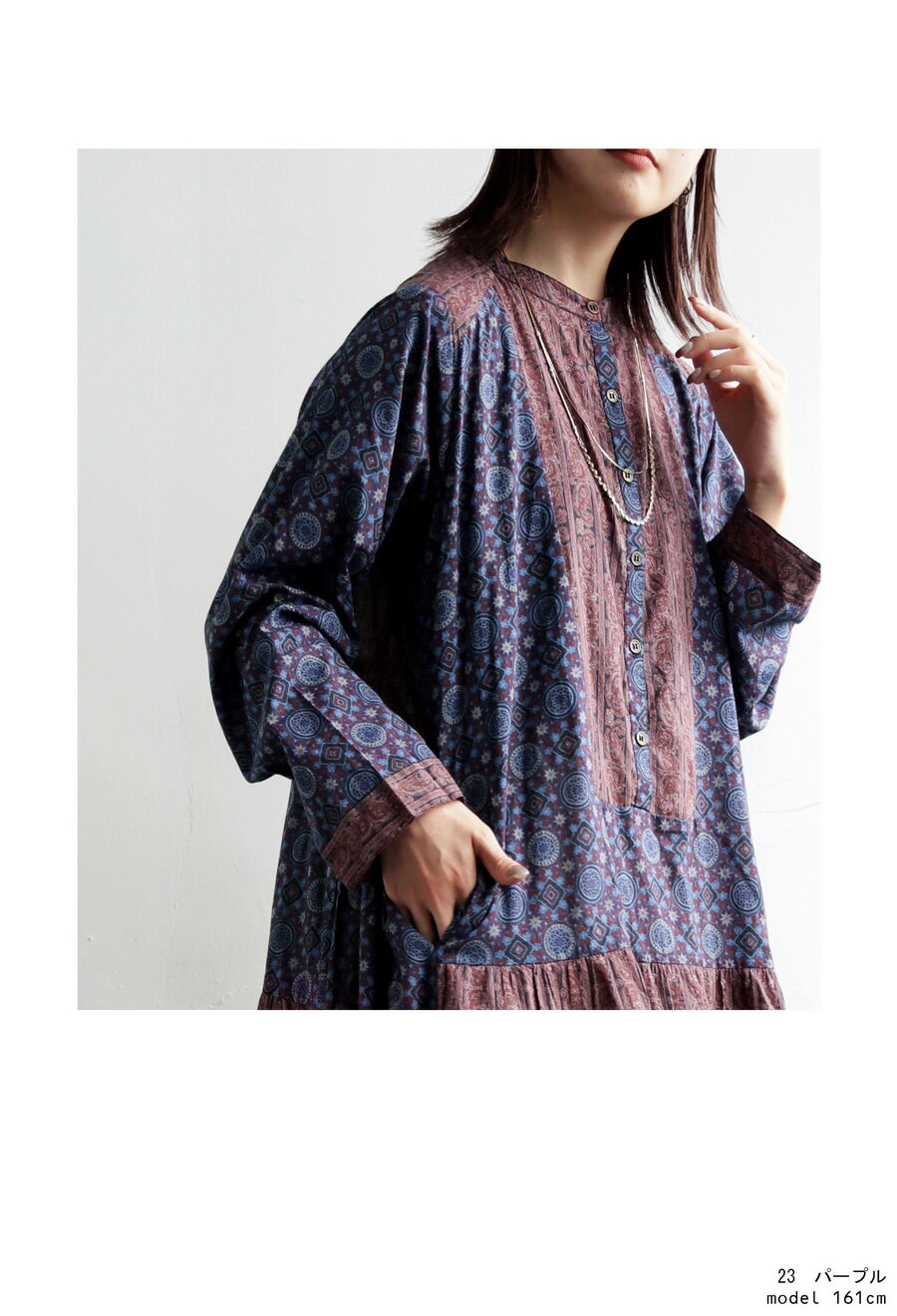 トップス ワンピース ワンピ 長袖 ロング ロングワンピ レーヨン 綿100% コットン ペイズリー柄 アジュラック柄 総柄 ギャザー パッチワーク ゆったり ナチュラル カジュアル レトロ 大人 レディース おしゃれ 誕生日 プレゼント AminaCollection
