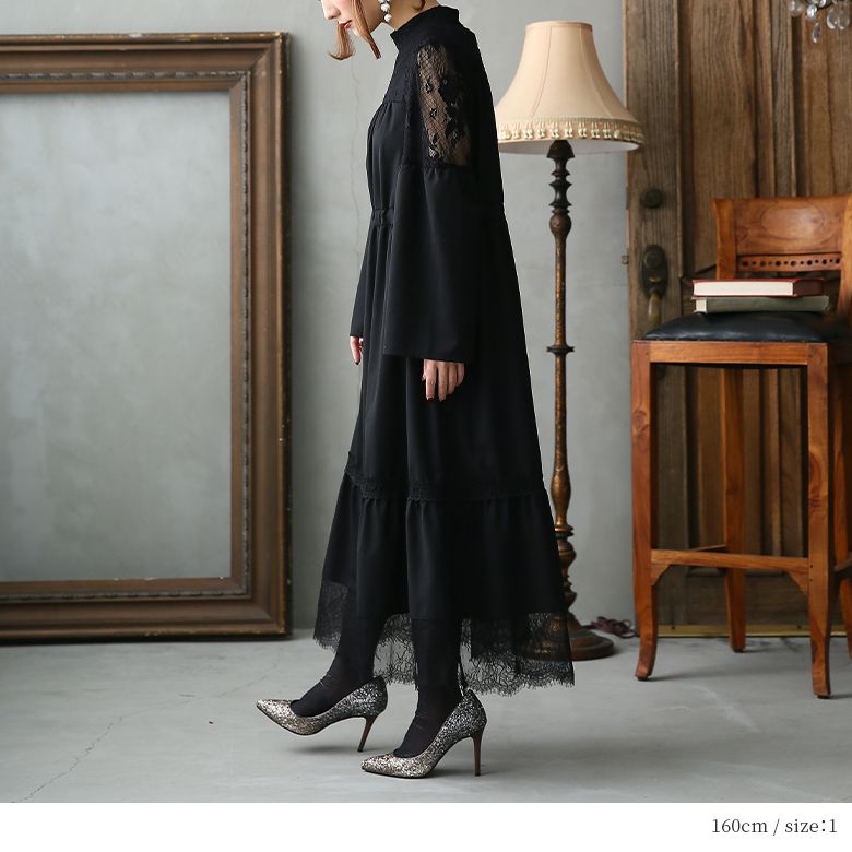 【送料無料】ワンピース ロング レディース フォーマル パーティードレス オケージョンワンピース 長袖 レース ハイネック スタンドネック ティアード 袖レース フレアスリーブ 袖コンシャス 花柄レース 無地 オシャレウォーカー【メール便不可】【20】