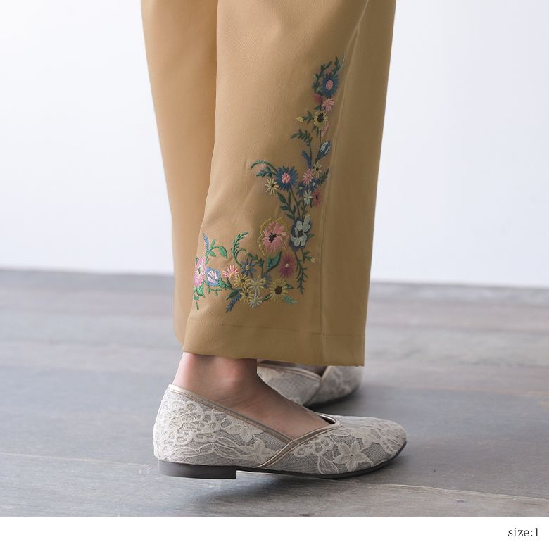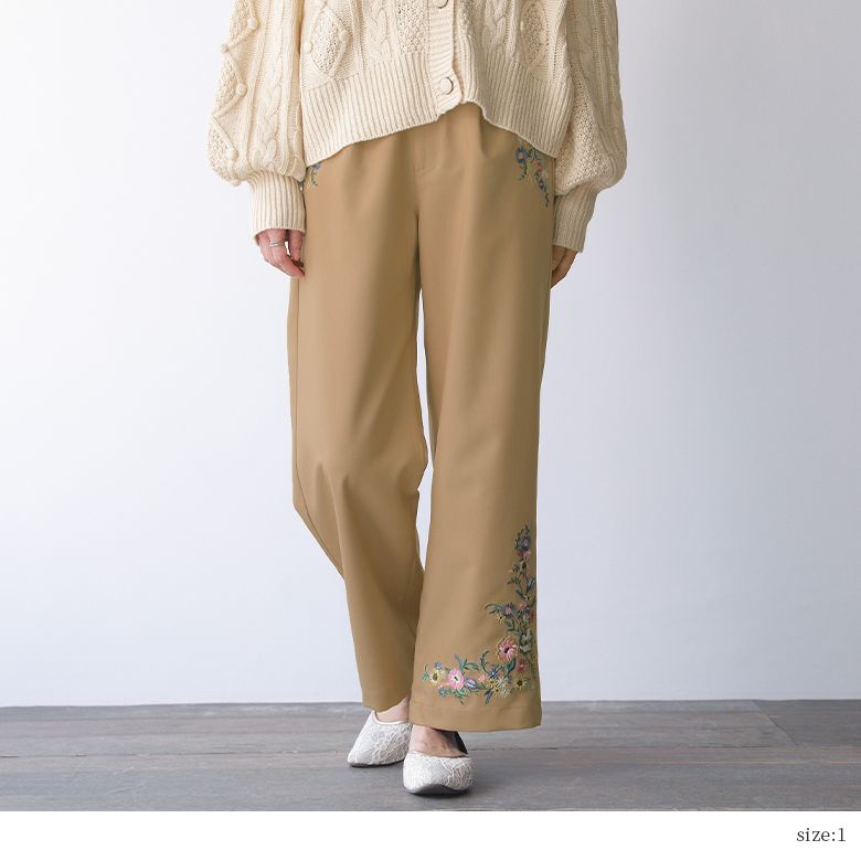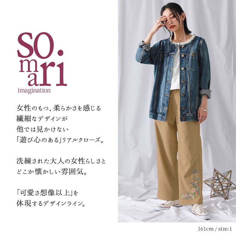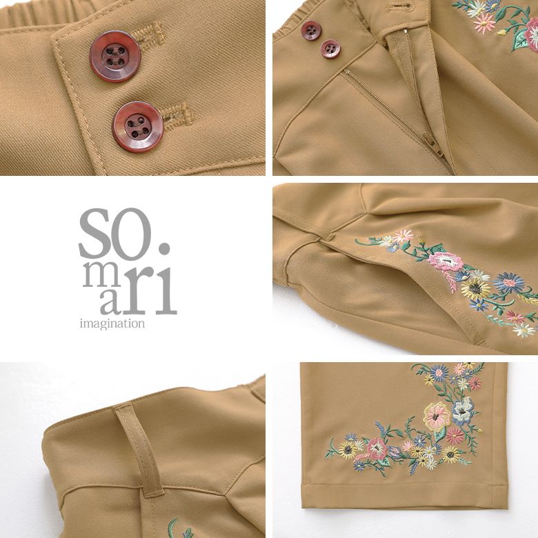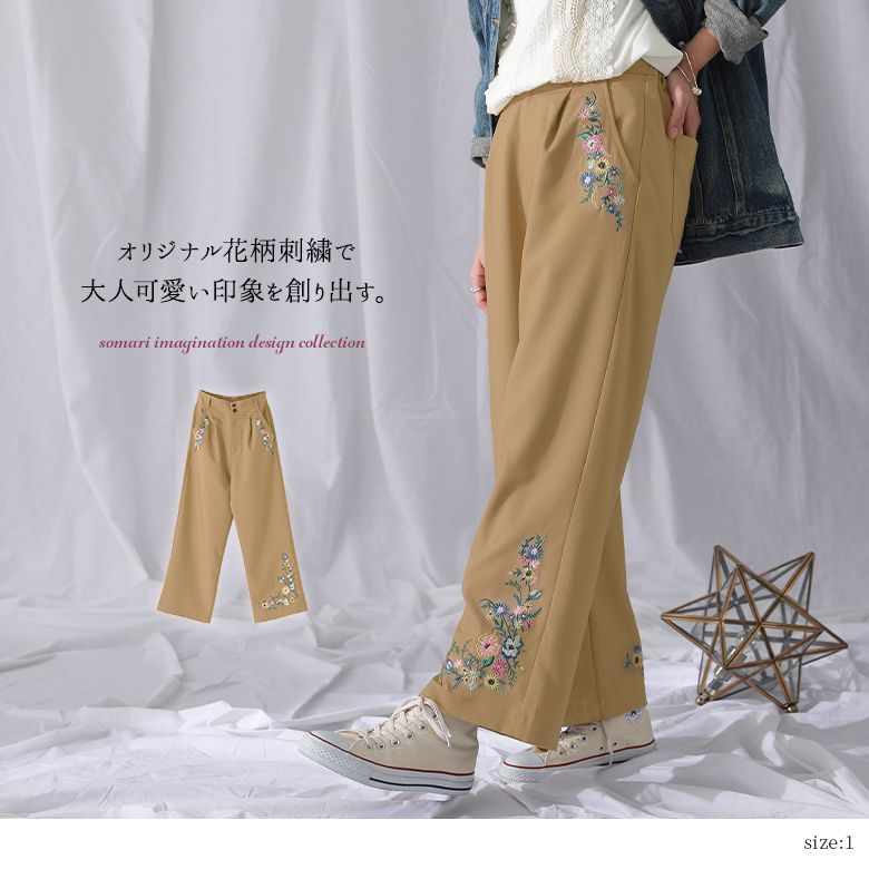 【50%OFF】『花柄刺繍ストレートワイドパンツ』[somari imagination ロング パンツ レディース ボトムス ストレート ワイド タックパンツ フラワー 刺繍 ツイル生地 ウエストゴム]◇【メール便不可】【20】