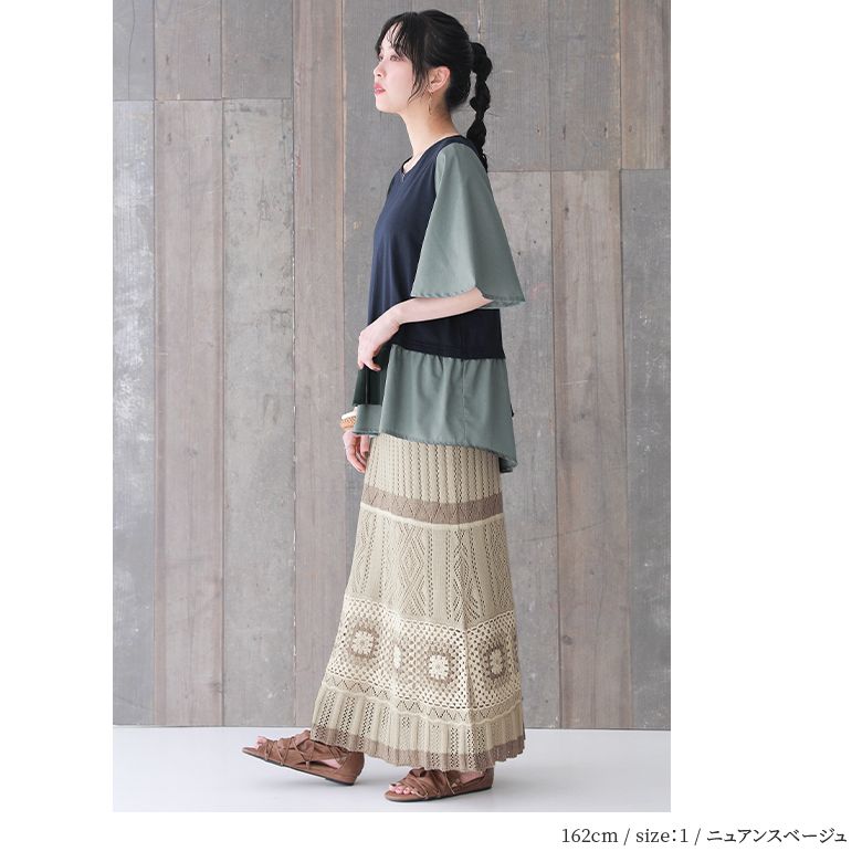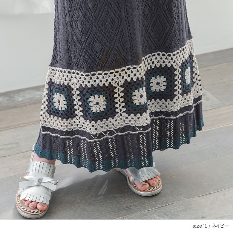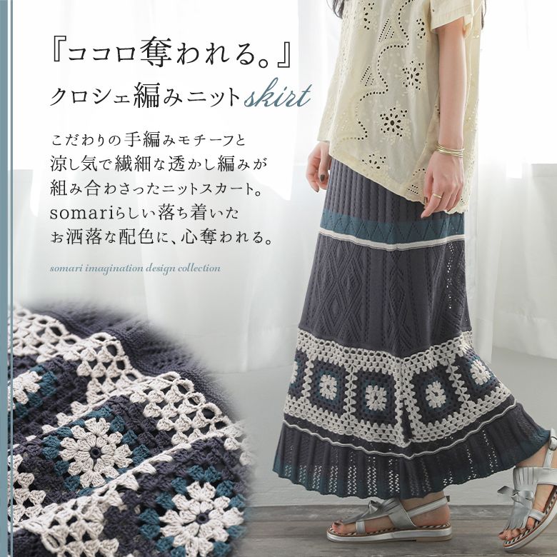 【全品送料無料】【30%OFF】『クロシェ編みニットスカート』[somari imagination ニット スカート レディース ロング Aライン 編み柄 透かし編み 透け感 綿混 配色 切替 ニュアンス]◇【メール便不可】【20】