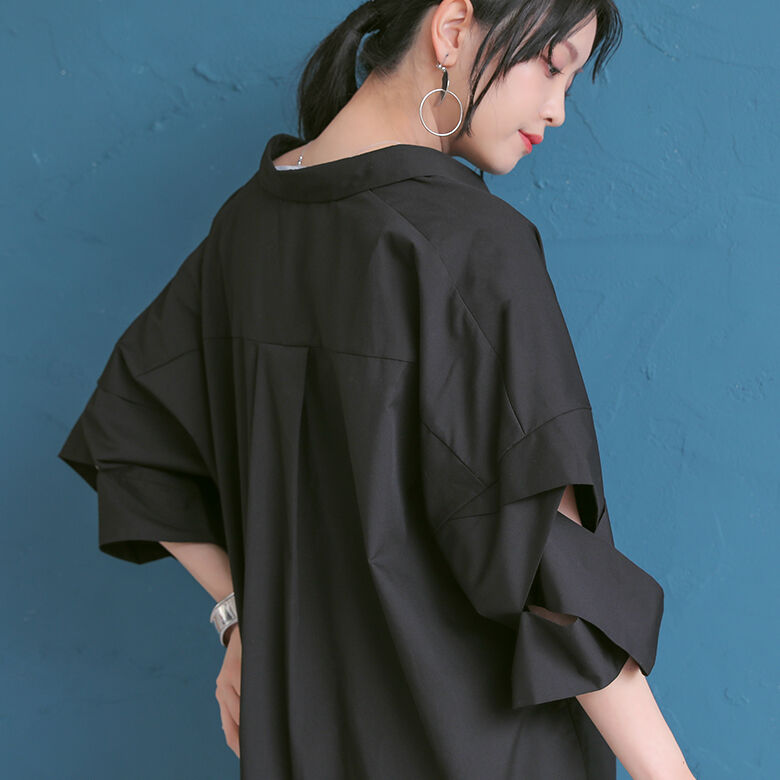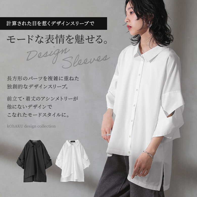『デザインスリーブアシメシャツ』[kOhAKU シャツ ブラウス 春夏 レディース トップス 半袖 五分袖 七分袖 無地 アシンメトリー 袖コンシャス スリット カッティング カットアウト モード]※メール便可※【5】