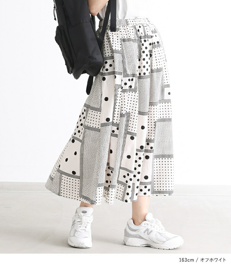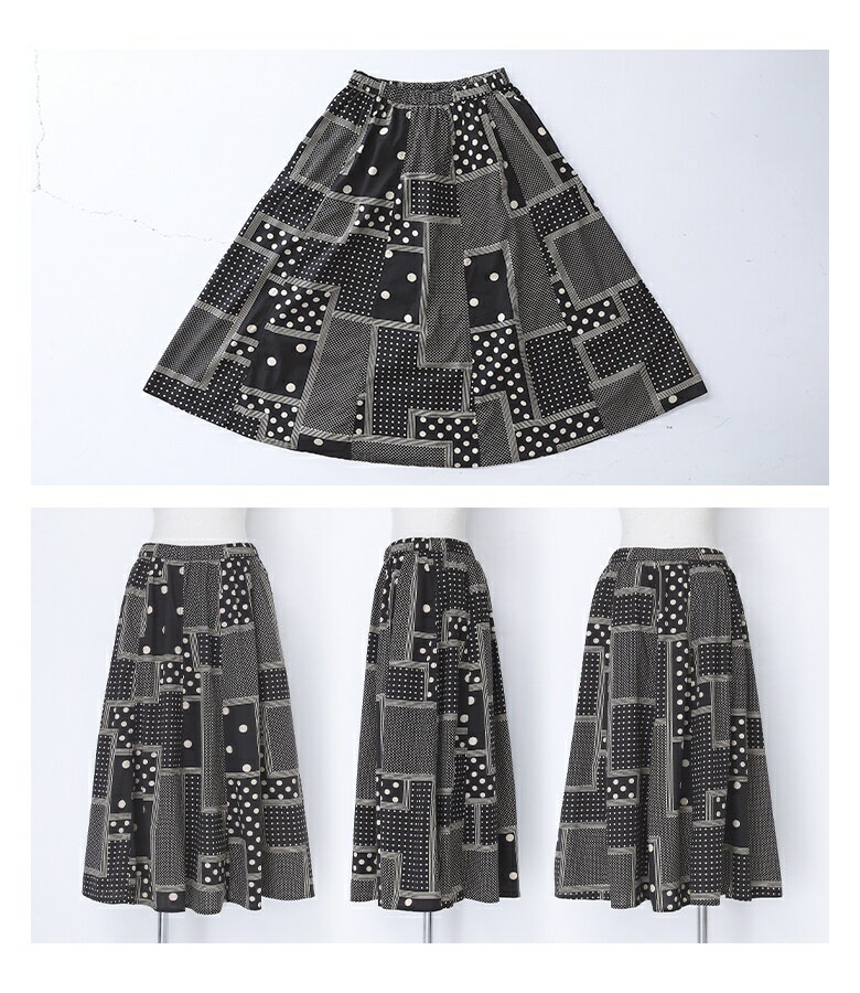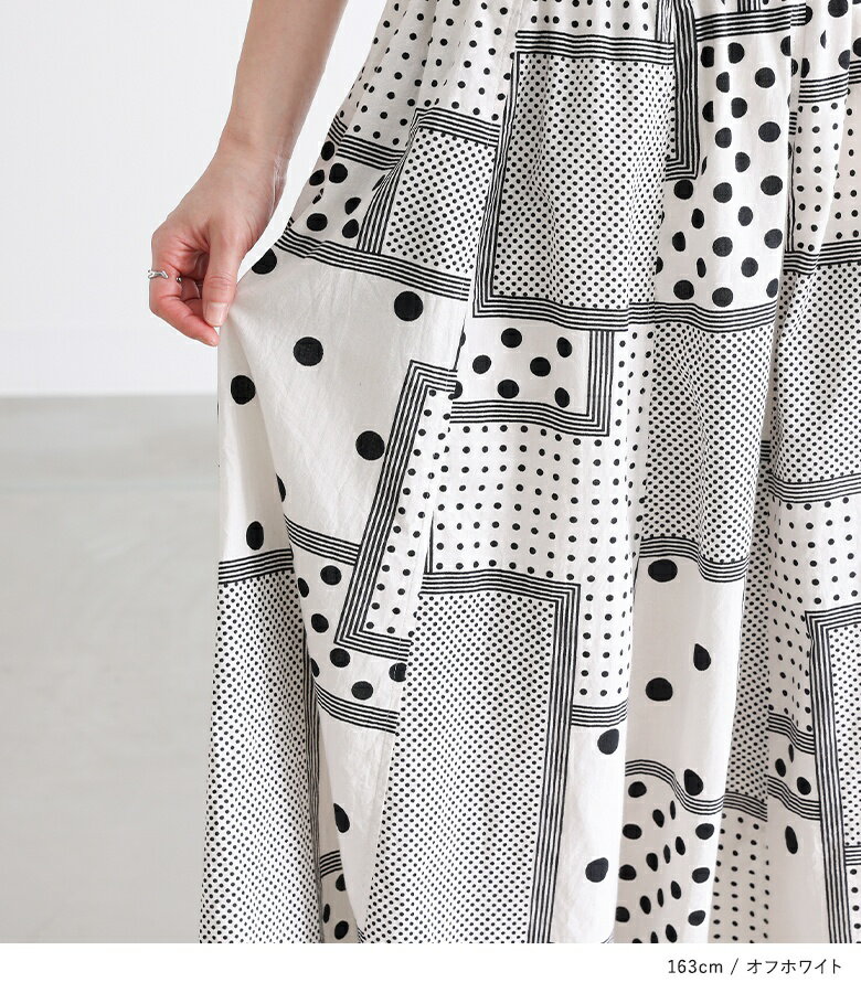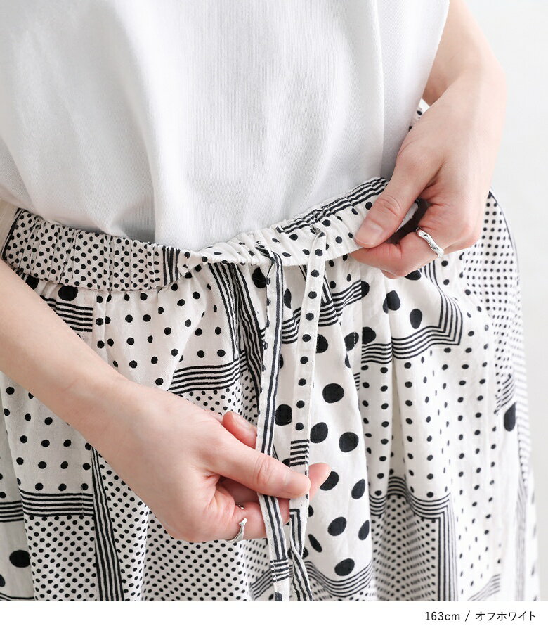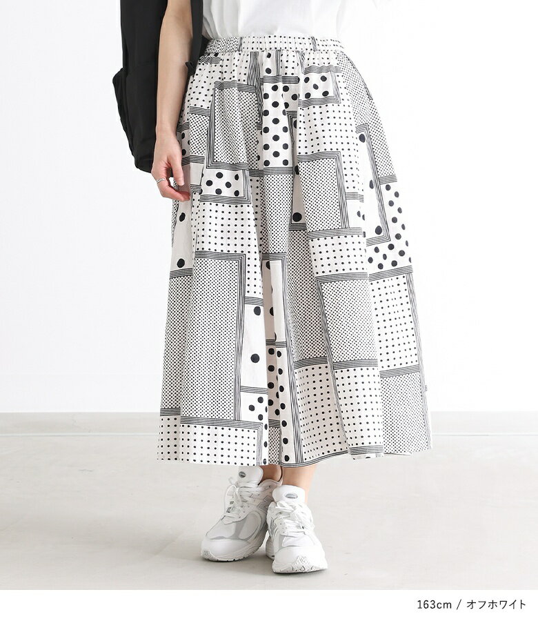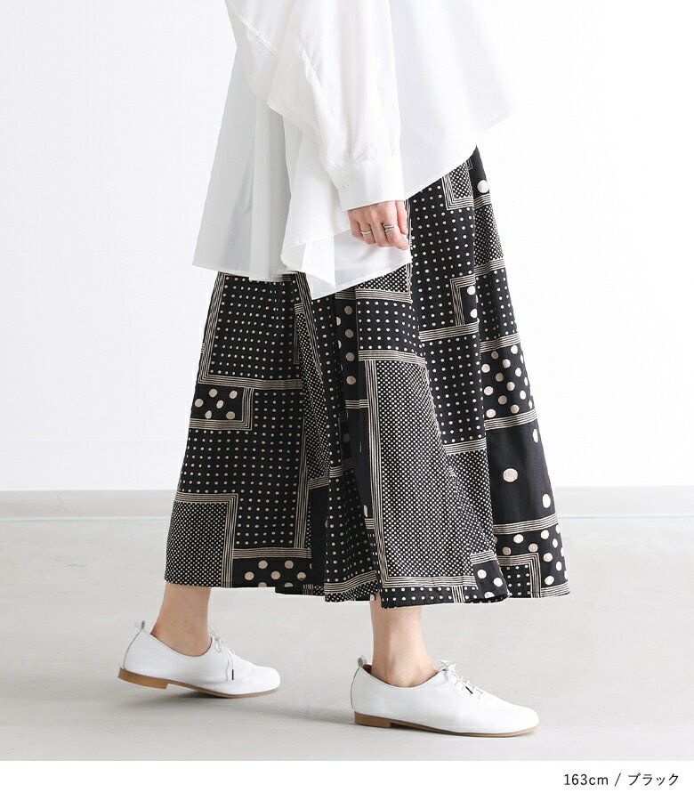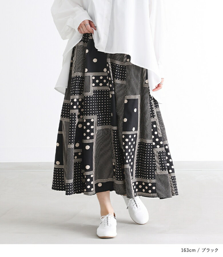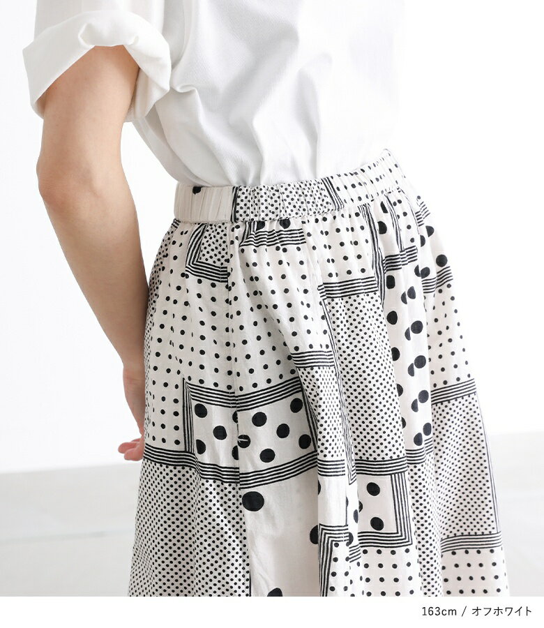 【送料無料】『変形ドットプリントフレアスカート』[スカート ロングスカート ロング丈 ボトムス レディース 春 フレア フレアスカート コットン100% 綿100% ウエストゴム]【メール便不可】【20】