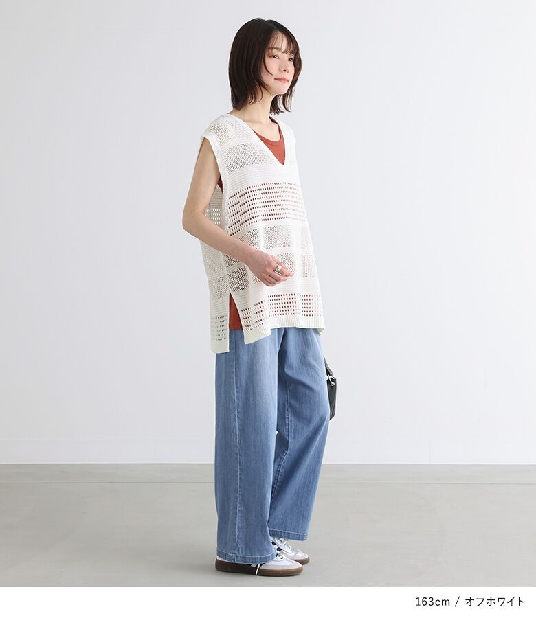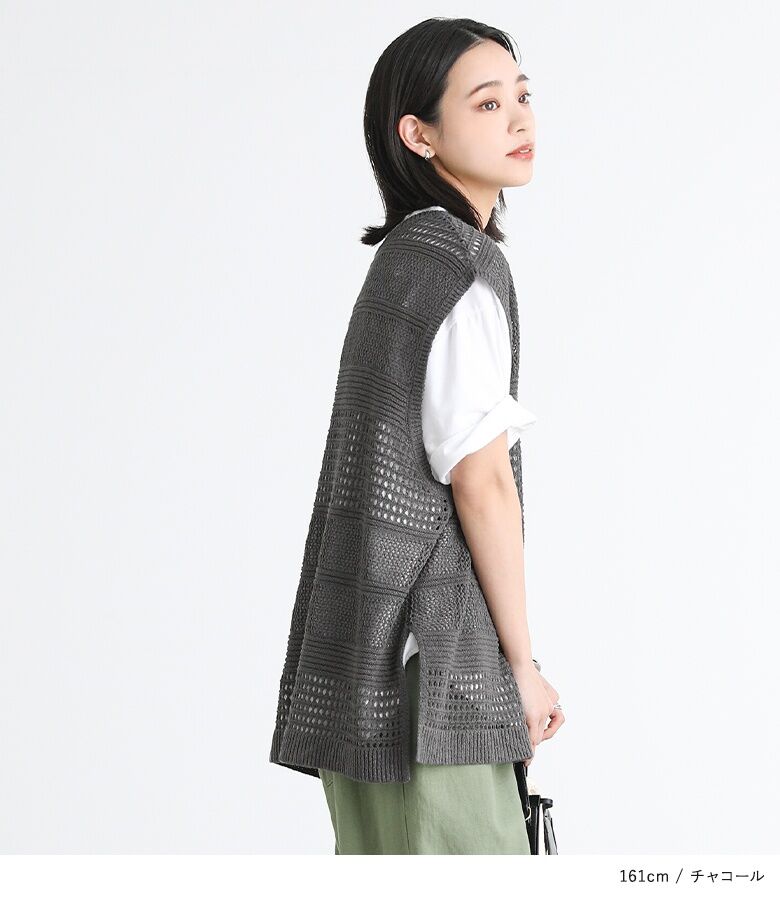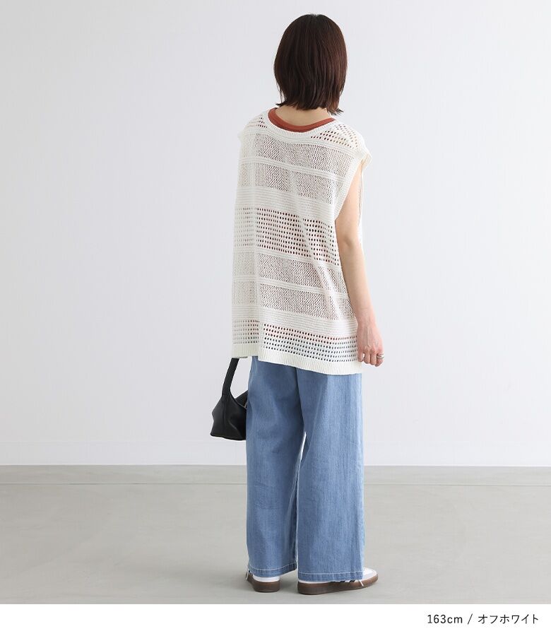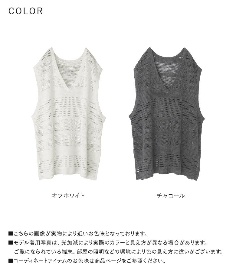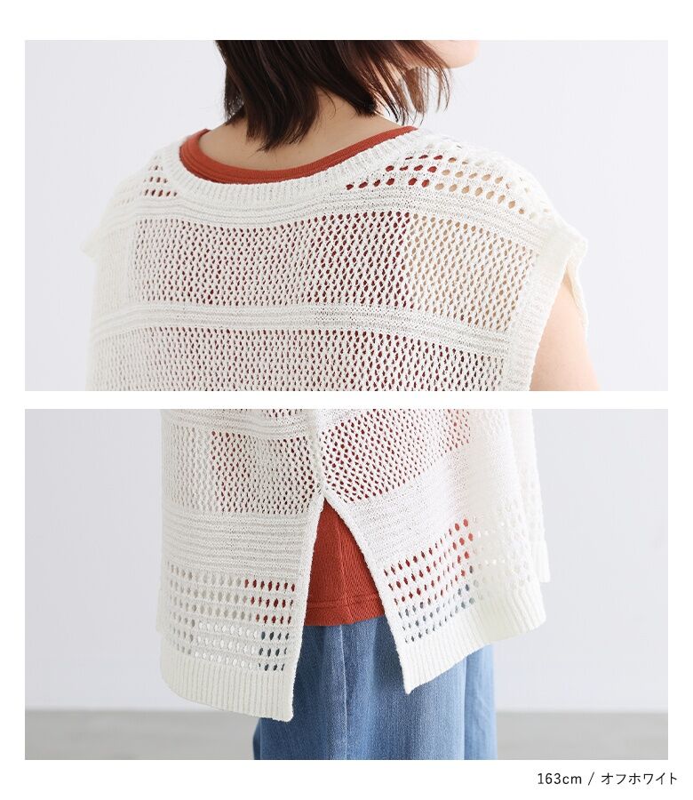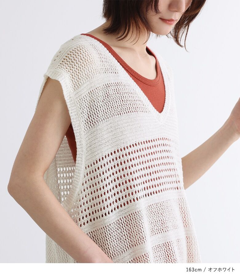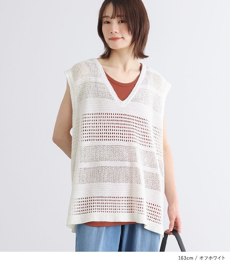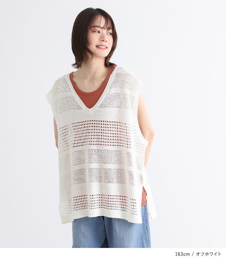 【全品送料無料】『テープヤーン透かし編みニットベスト』[n'OrLABEL ニットベスト レディース トップス サマーニット ノースリーブ 透かし編み Vネック スリット テープヤーン]※メール便可※【10】