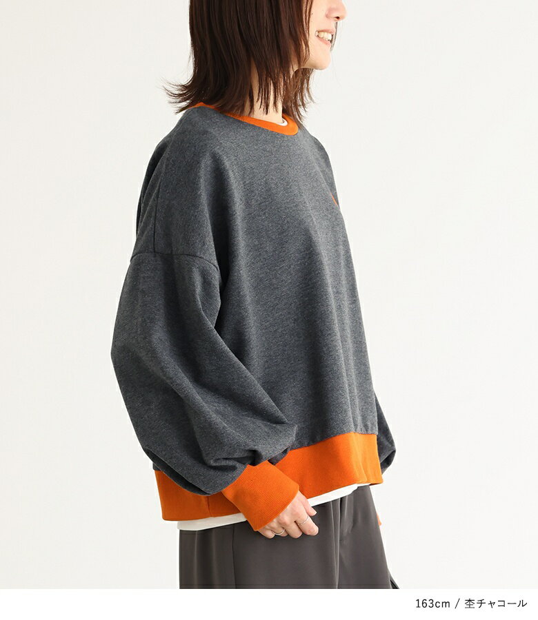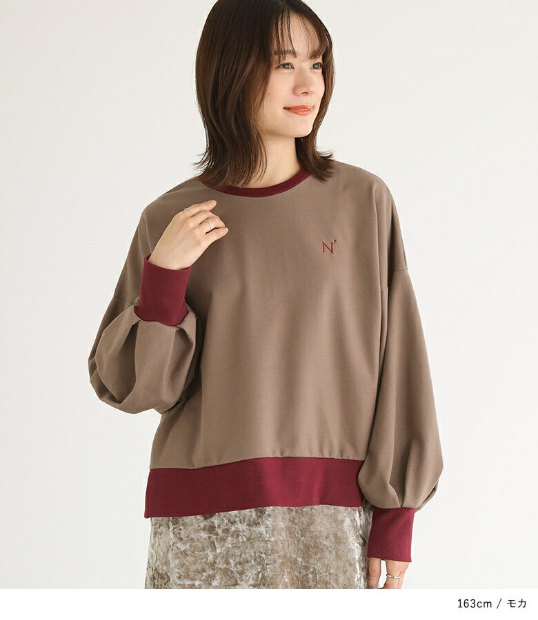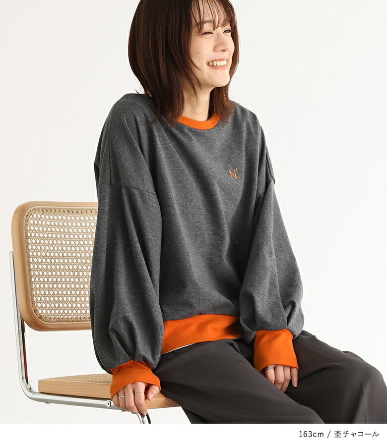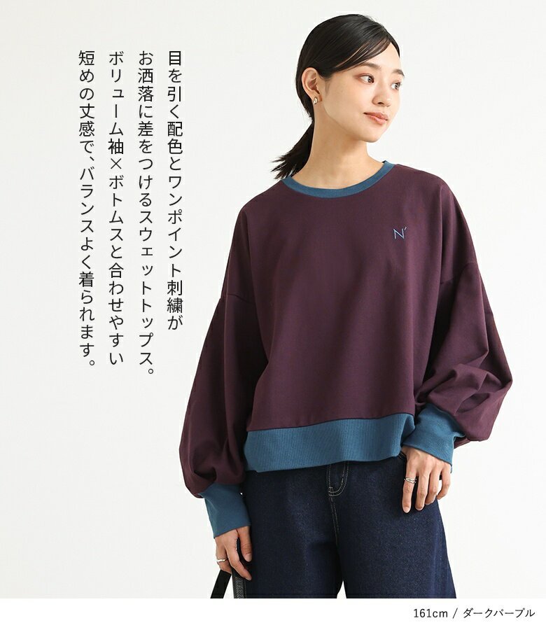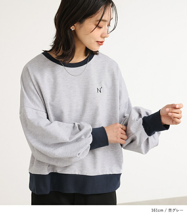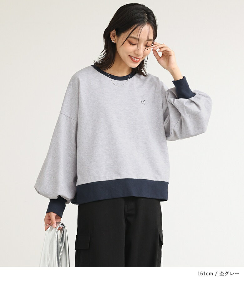 スウェット 長袖 レディース トップス スウェットトップス トレーナー クルーネック バイカラー 配色 ミニ裏毛 ボリューム袖 ショート丈 ワンポイント 刺繍 ロゴ スウェット生地 ゆったり 体型カバー カジュアル シンプル オシャレウォーカー【メール便不可】【20】