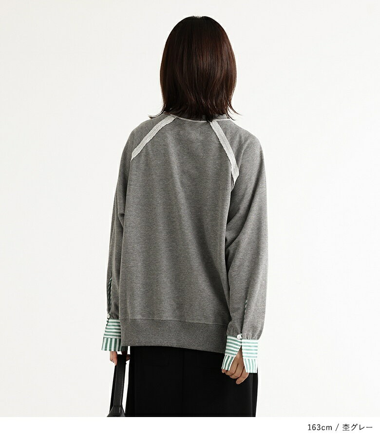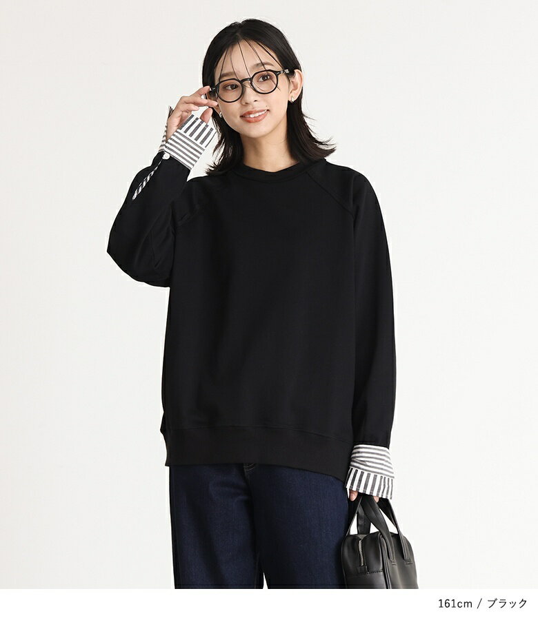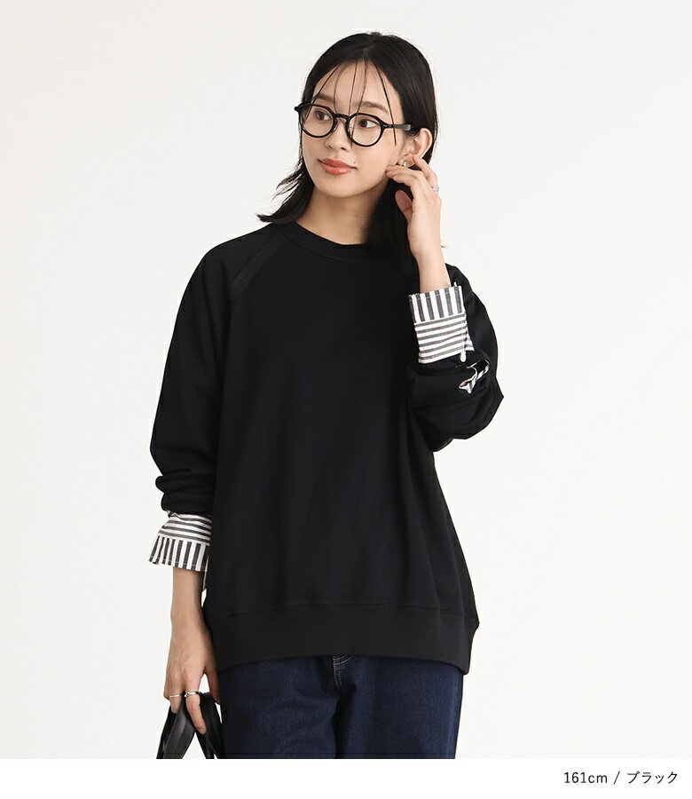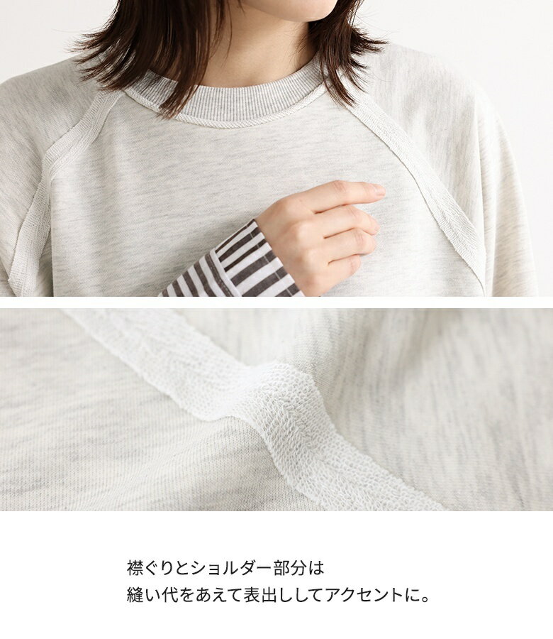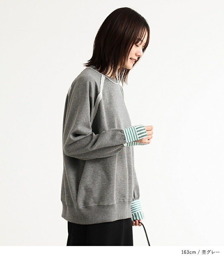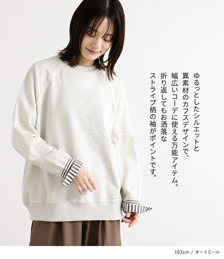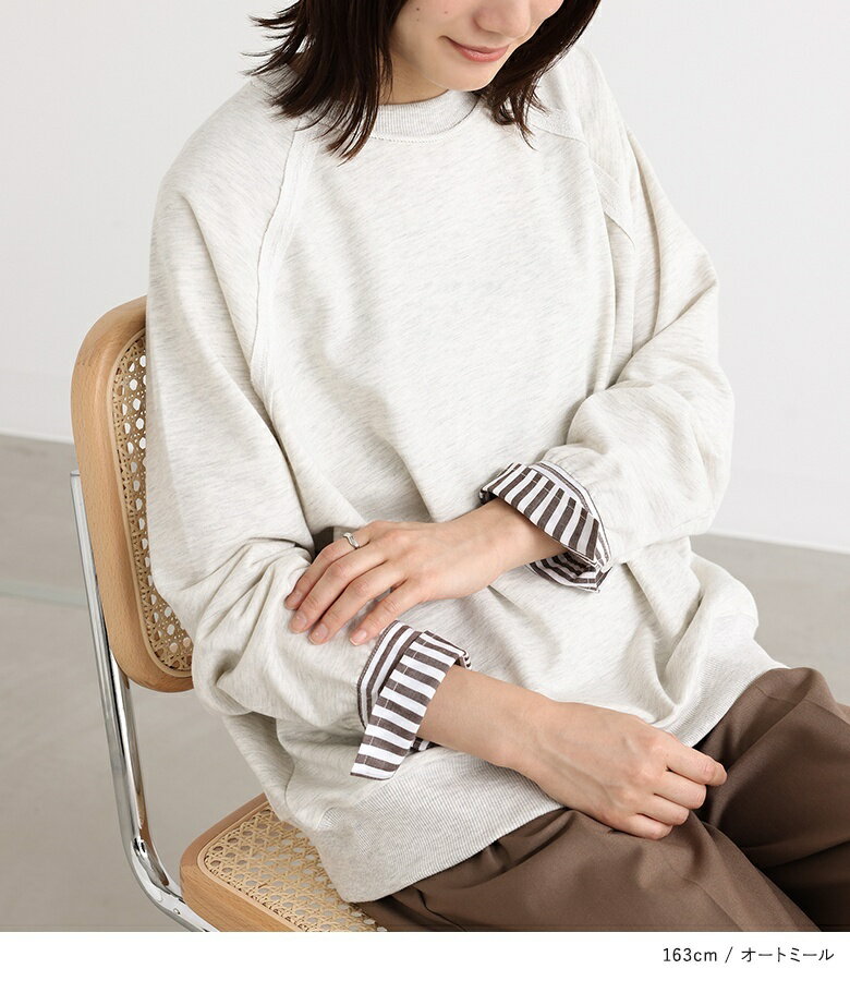 プルオーバー レディース トップス カットソー スウェット クルーネック リブ 切替 異素材 カジュアル ロンT トレーナー スエット 長袖 ストライプ柄 無地 オーバーサイズ 異素材MIX コットン混 レイヤード オシャレウォーカー【メール便不可】【20】
