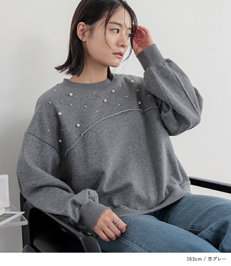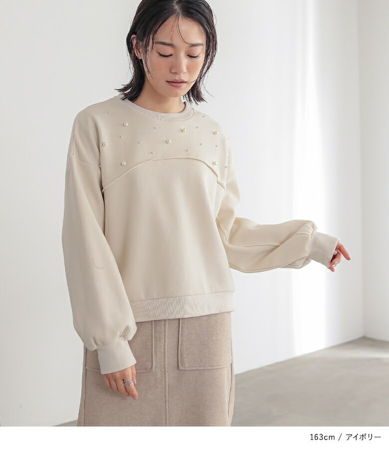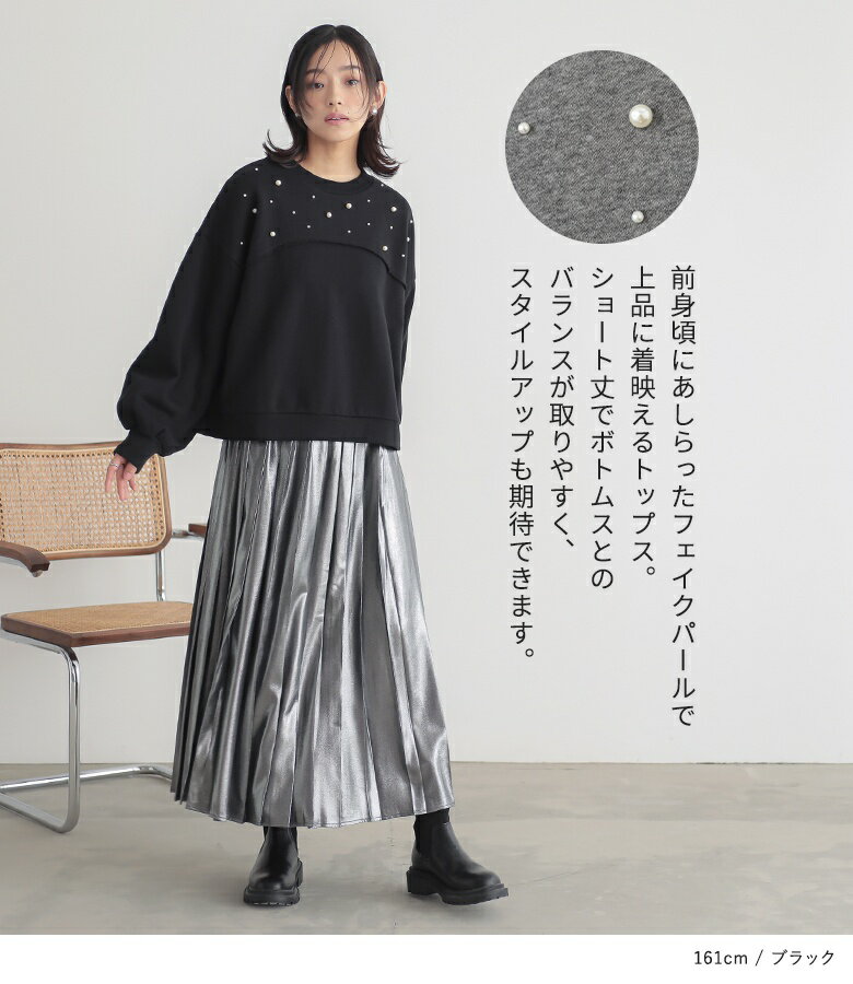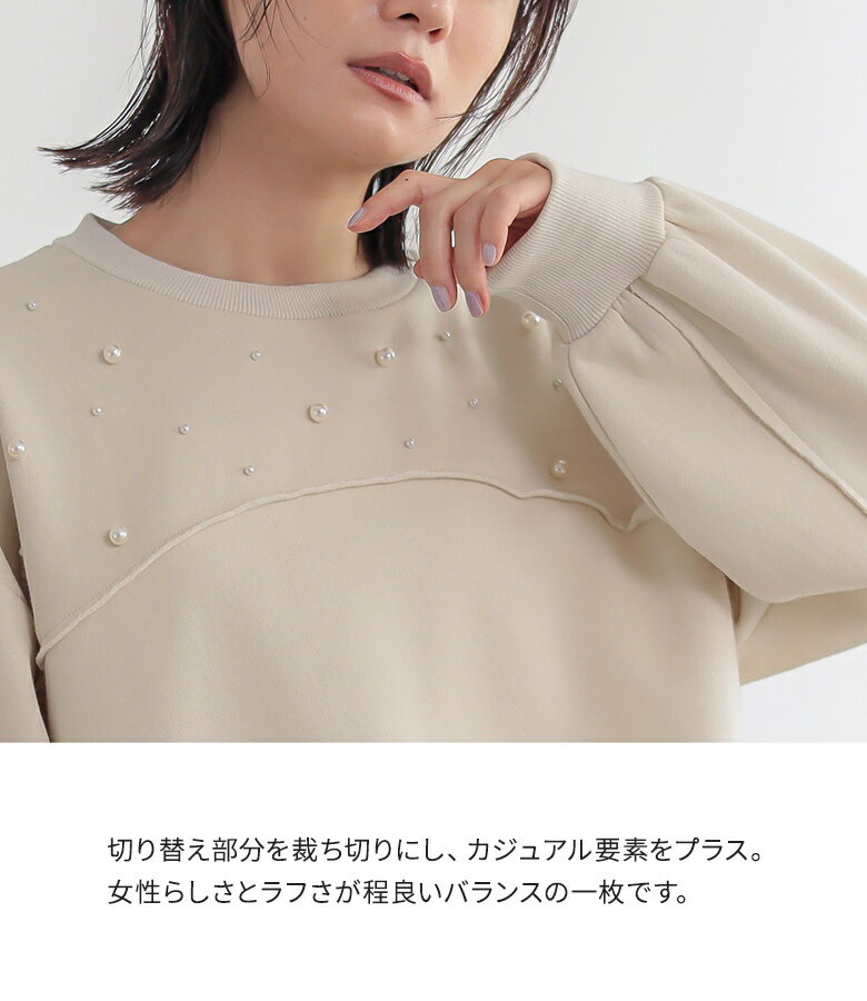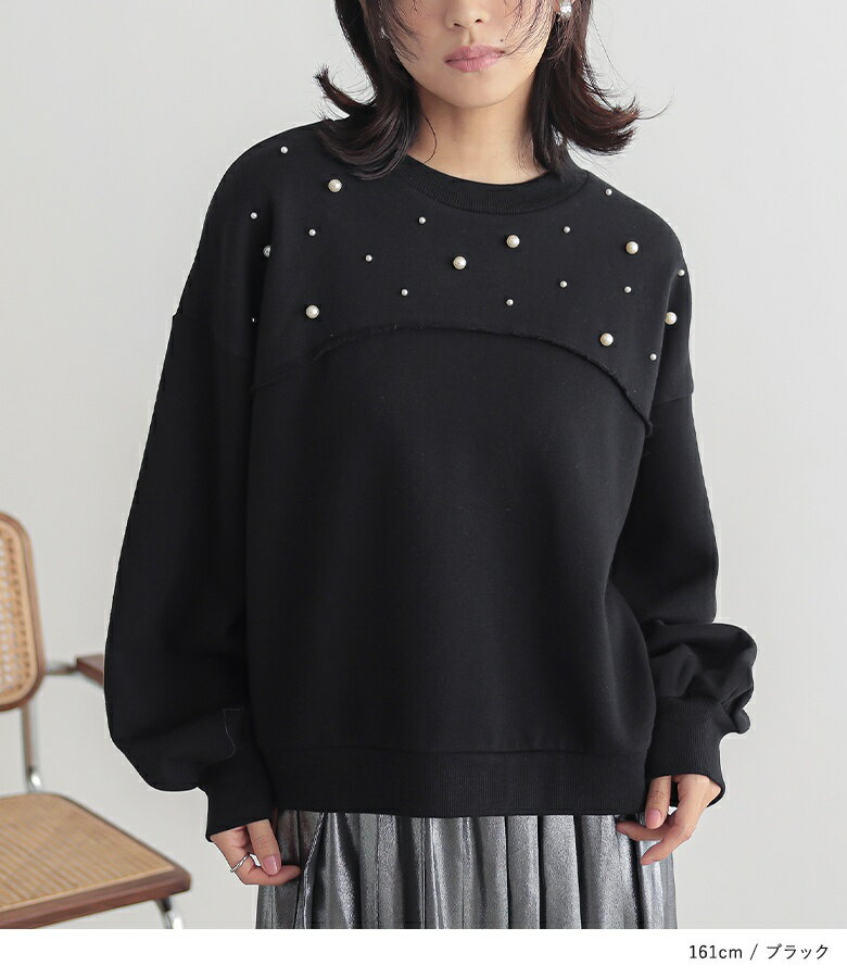【全品送料無料】トップス レディース レディーストップス レディーストレーナー トレーナー スウェット プルオーバー クルーネック フェイクパール 裏起毛 ショート丈 切り替え 体型カバー ゆったり 大人カジュアル 無地 オシャレウォーカー【メール便不可】【30】