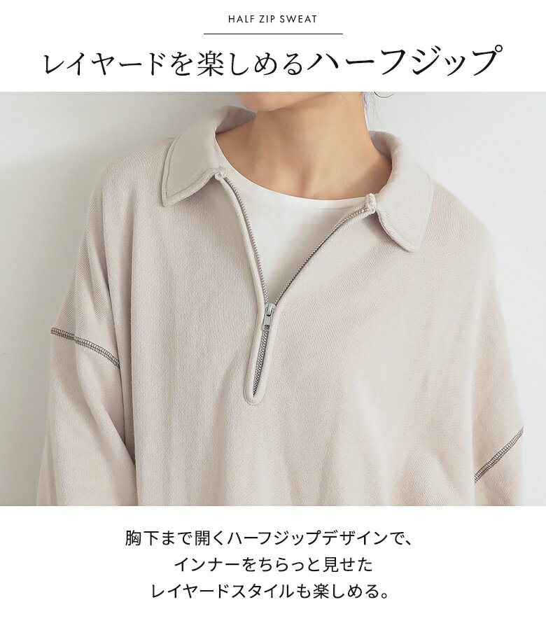 スウェット レディース トップス トレーナー 長袖 ハーフジップ 襟付き ゆったり プルオーバー 配色 ステッチ ショート丈 ドロップショルダー 無地 裏毛 リブ レイヤード ファスナー オシャレウォーカー【メール便不可】【40】