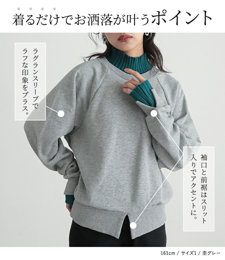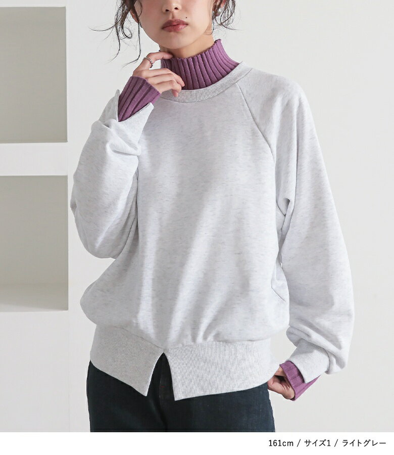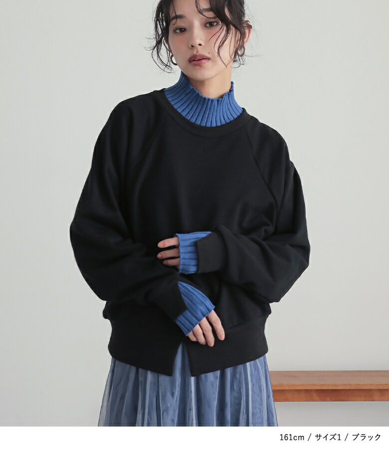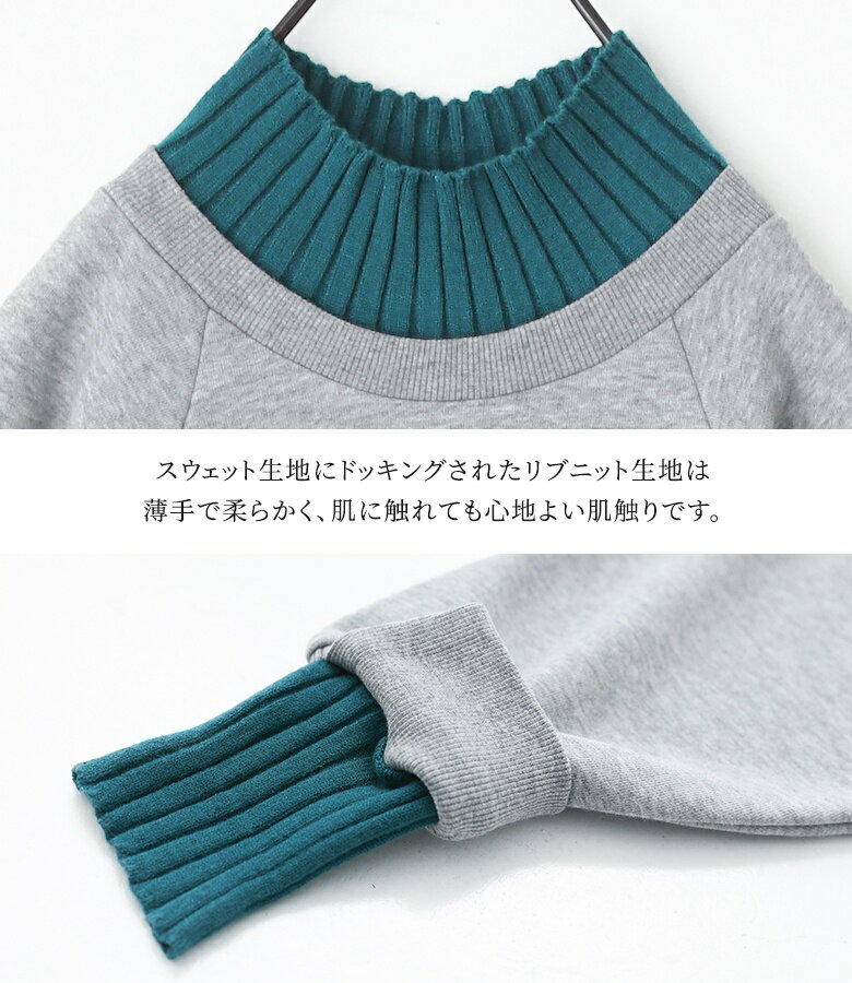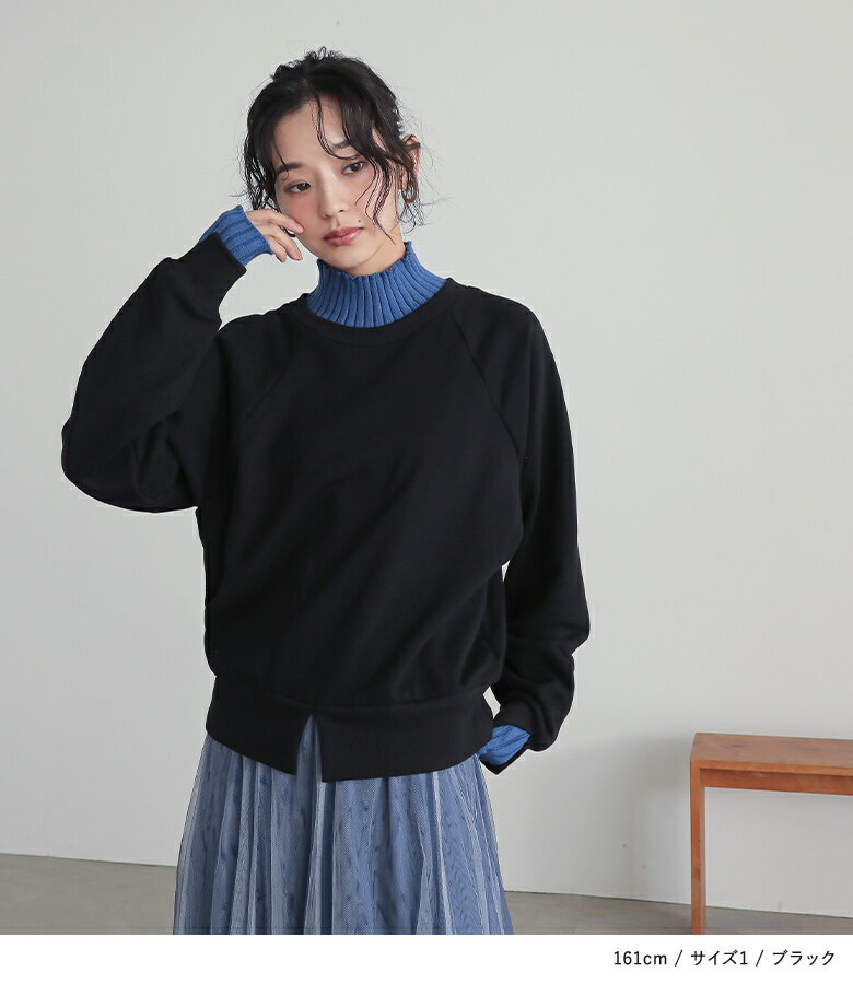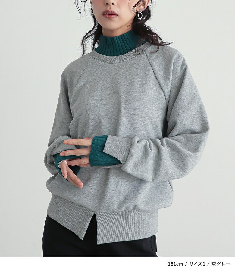 スウェット レディース トップス 長袖 トレーナー スエット プルオーバー ショート丈 ミディ丈 ミドル丈 スリット 綿混 裏毛 配色 無地 ラグランスリーブ リブニット ハイネック タートルネック オシャレウォーカー【メール便不可】【20】