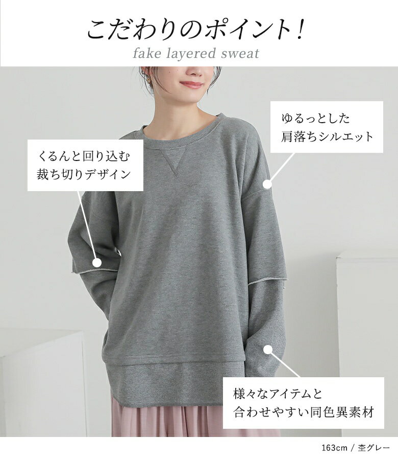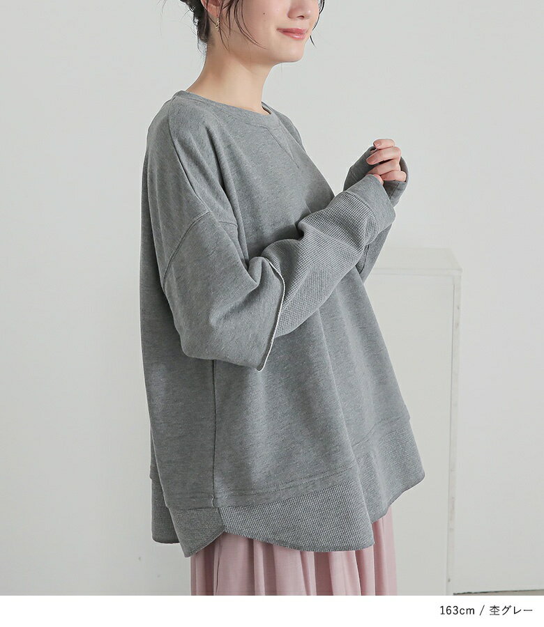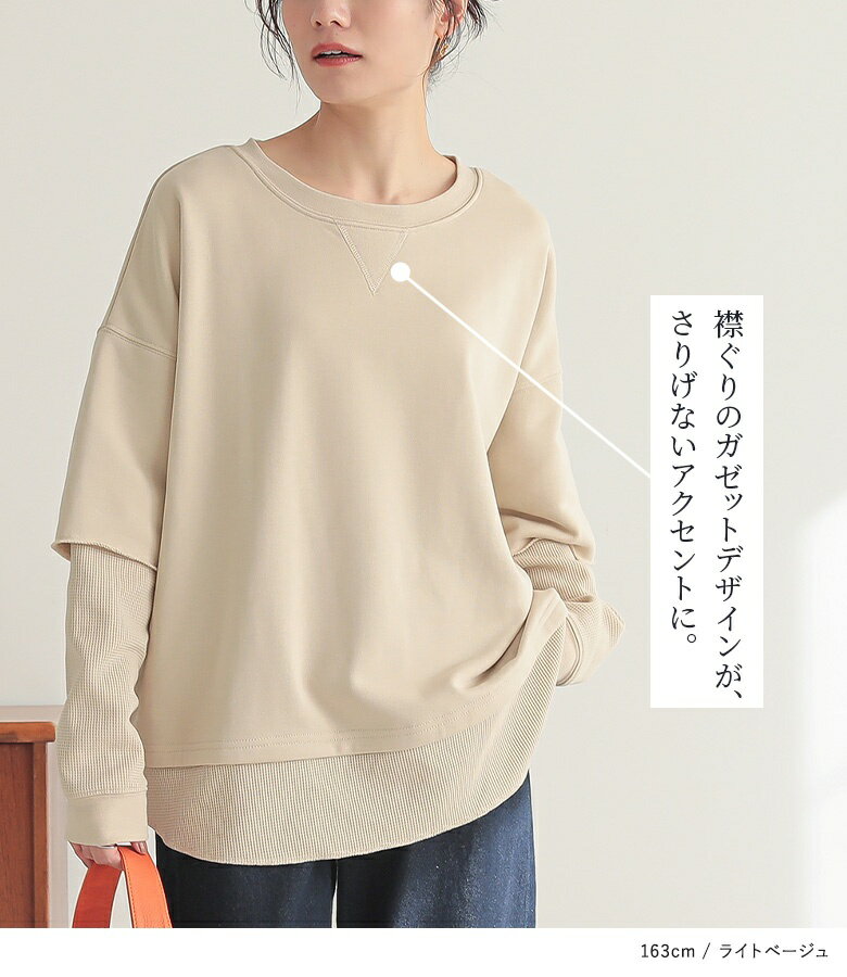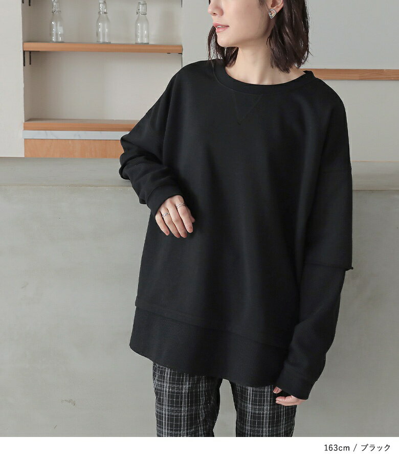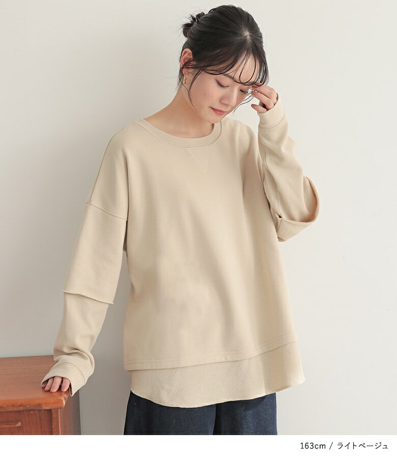 スウェット レディース トップス 長袖 トレーナー フェイクレイヤード 綿混 裏毛 ワッフル生地 プルオーバー ドロップショルダー ガゼット 無地 異素材 ドッキング ミドル丈 お尻が隠れる 春 秋 冬 オシャレウォーカー【メール便不可】【30】