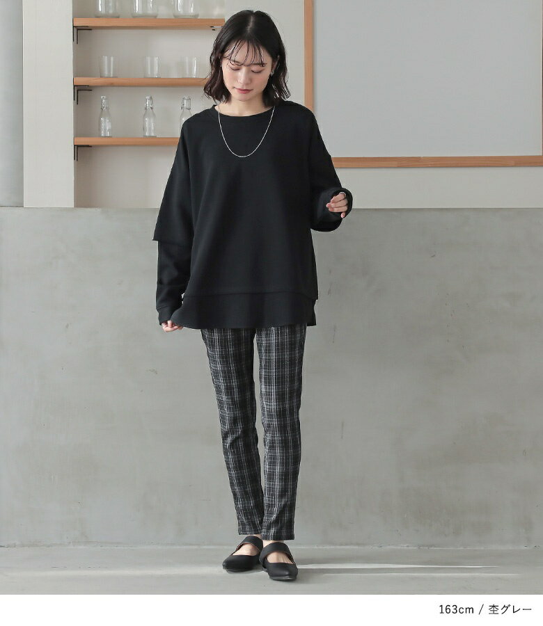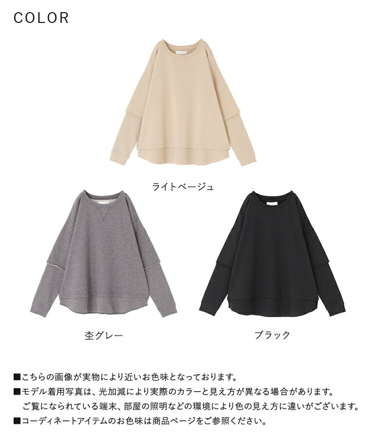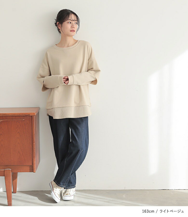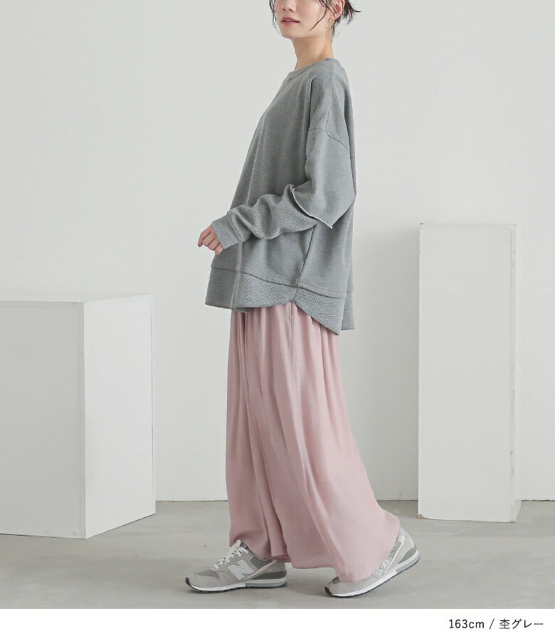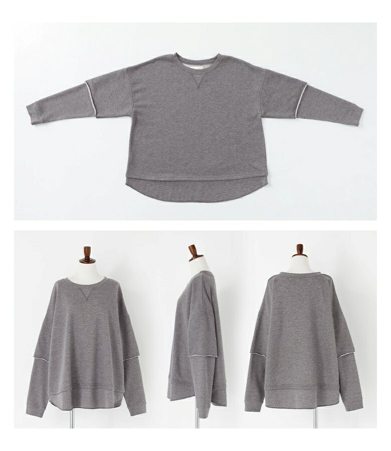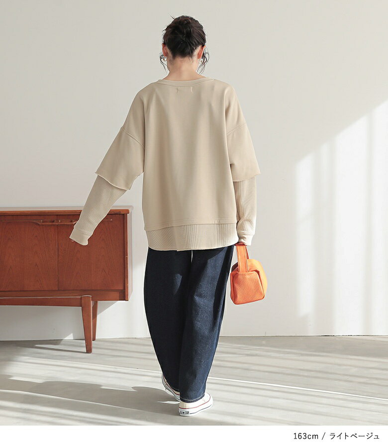 スウェット レディース トップス 長袖 トレーナー フェイクレイヤード 綿混 裏毛 ワッフル生地 プルオーバー ドロップショルダー ガゼット 無地 異素材 ドッキング ミドル丈 お尻が隠れる 春 秋 冬 オシャレウォーカー【メール便不可】【30】