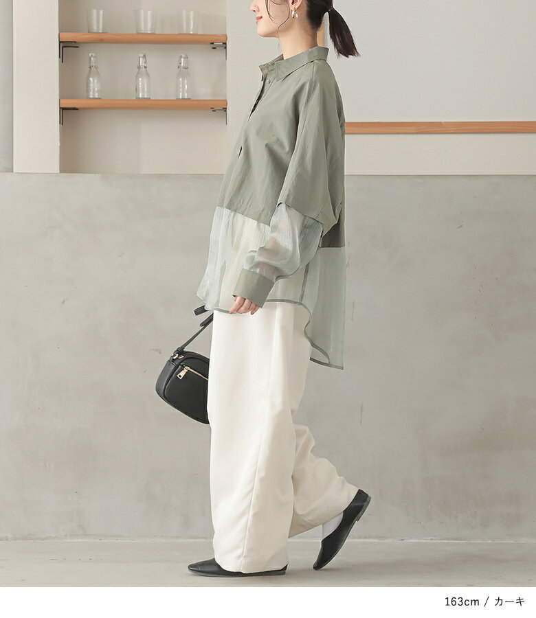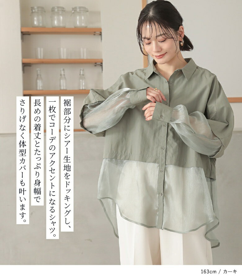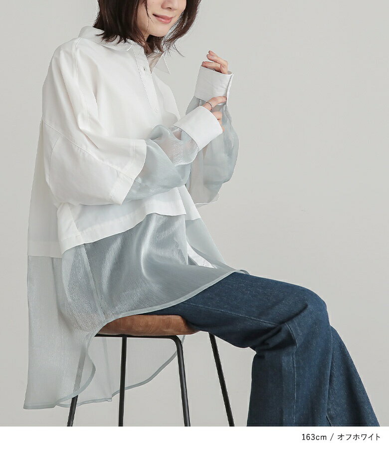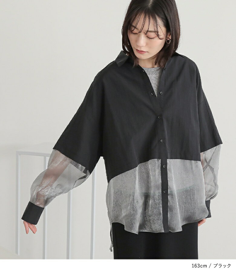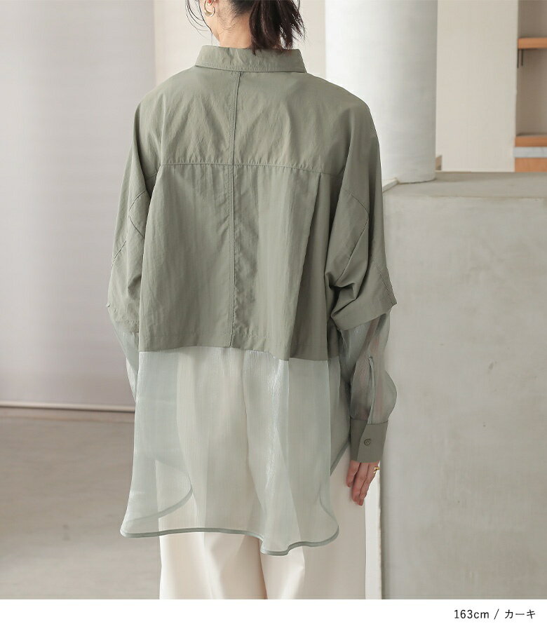 シャツ レディース トップス ブラウス 長袖 ドッキング シアー 体型カバー シャカシャカ 重ね着 レイヤード ゆったり ヨーク 切り替え オシャレウォーカー※メール便可※【10】