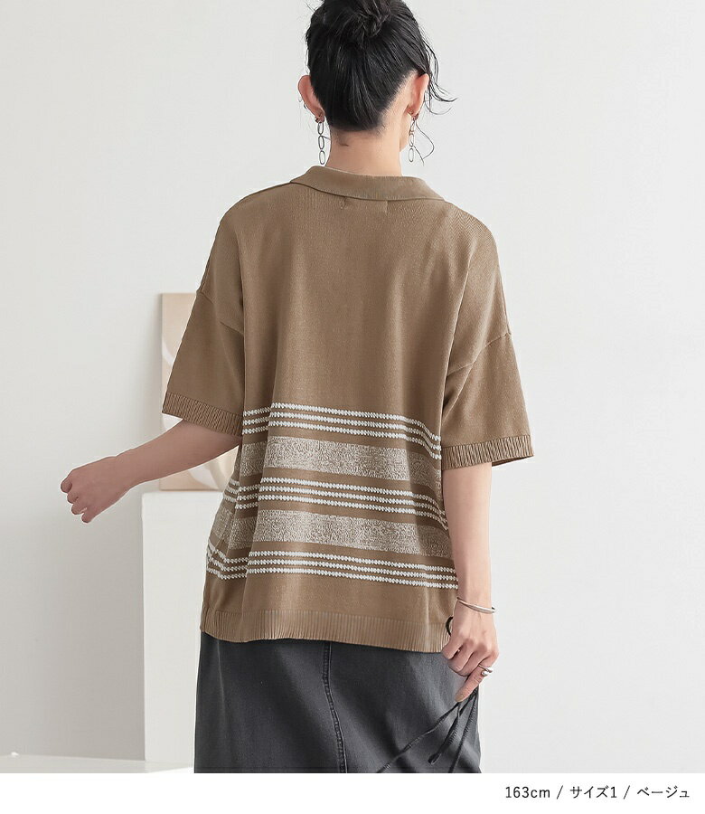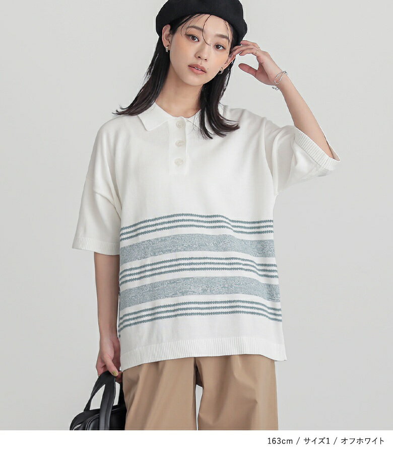 ニット レディース トップス 半袖 五分袖 ポロシャツ ボーダー柄 コットン100% 体型カバー きれいめ ラフ セーター サマーニット プルオーバー レギュラーカラー ドロップショルダー 春 夏 オシャレウォーカー【メール便不可】【20】