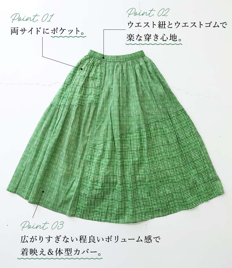 【300円OFFクーポン有】 スカート レディース ボトムス 春 夏 秋 ロング丈 ロングスカート チェック柄 ギャザー 切り替え コットンボイル生地 ウエストゴム 調節可能 ポケット 体型カバー Noia ノイア OUKA オウカ【メール便不可】【30】