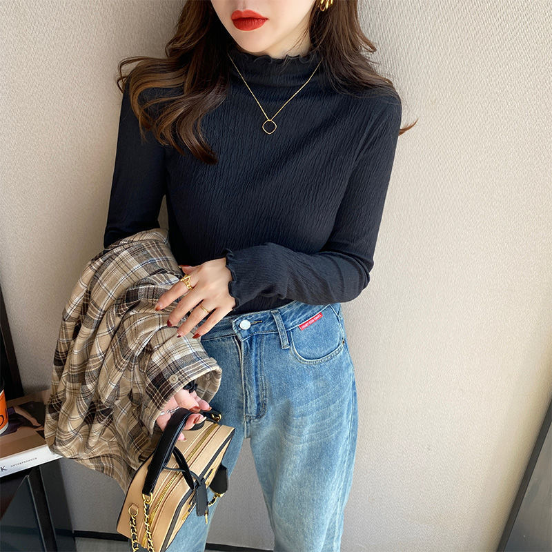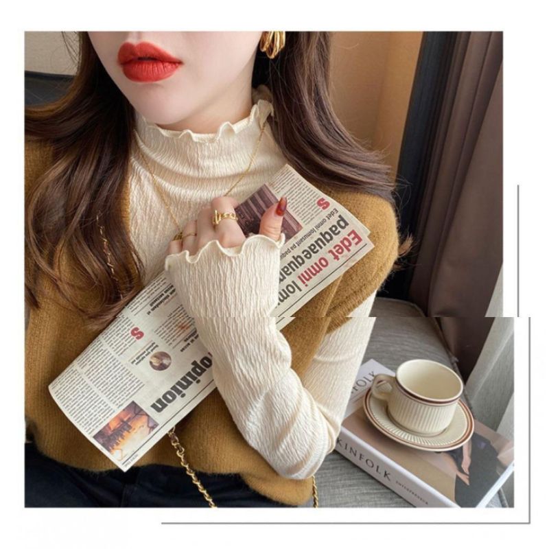 【10%OFFクーポン配布中★29日1:59まで】長袖 ハイネック レディース カットソー 薄手 裏起毛 トップス フリル袖 フリルネック きれいめ シンプル おしゃれ 可愛い かわいい 大人 韓国ファッション ブラック ホワイト アプリコット 黒 白 M L 秋 冬 韓国ファション[J](T)