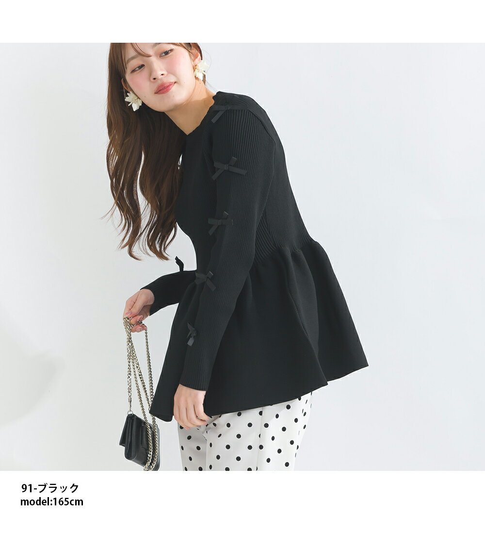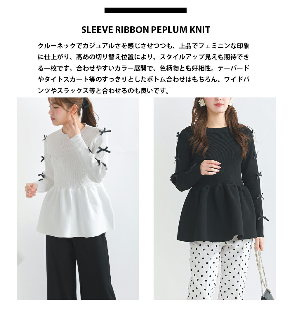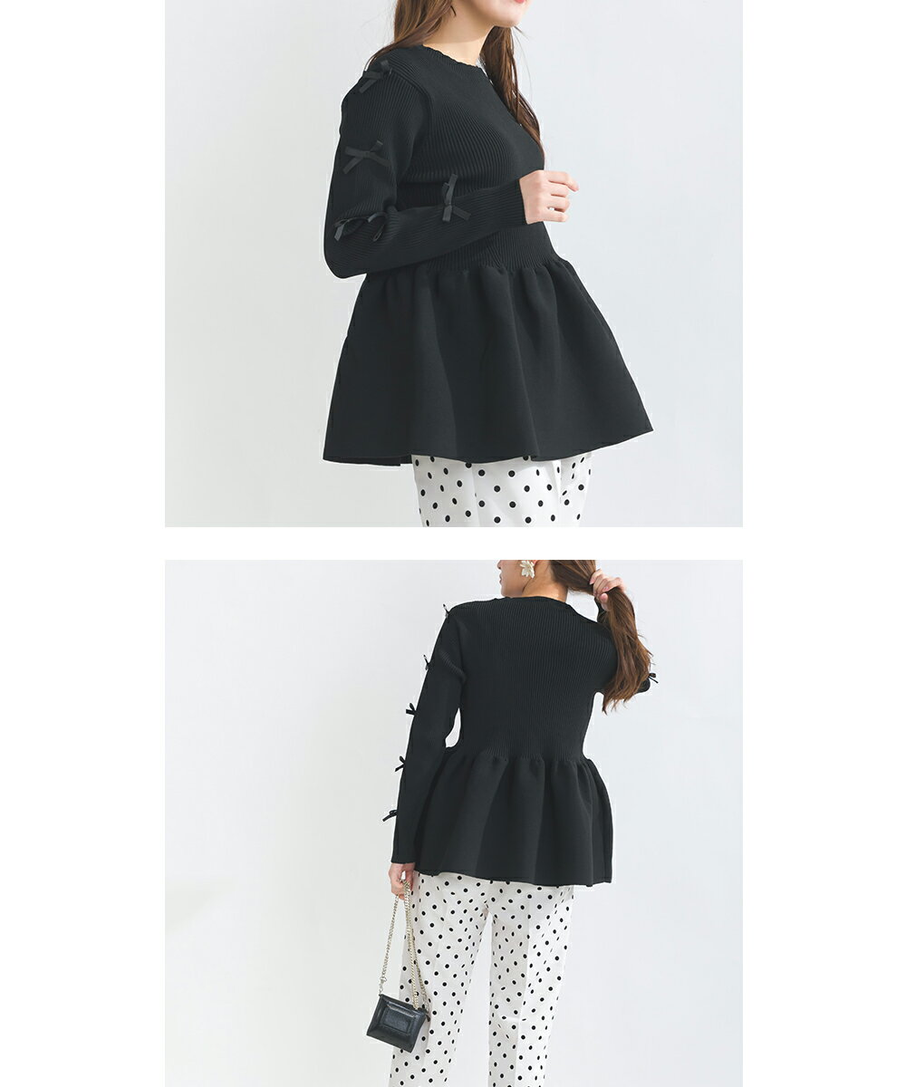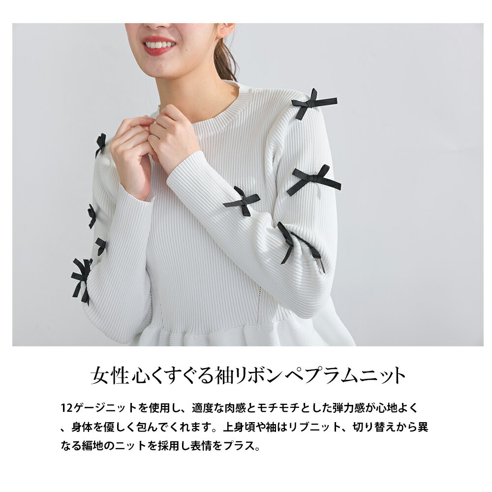 PICCIN PERLA 袖リボンペプラムニット 12ゲージ レディース トップス ニット ペプラム リボン オフホワイト ブラック