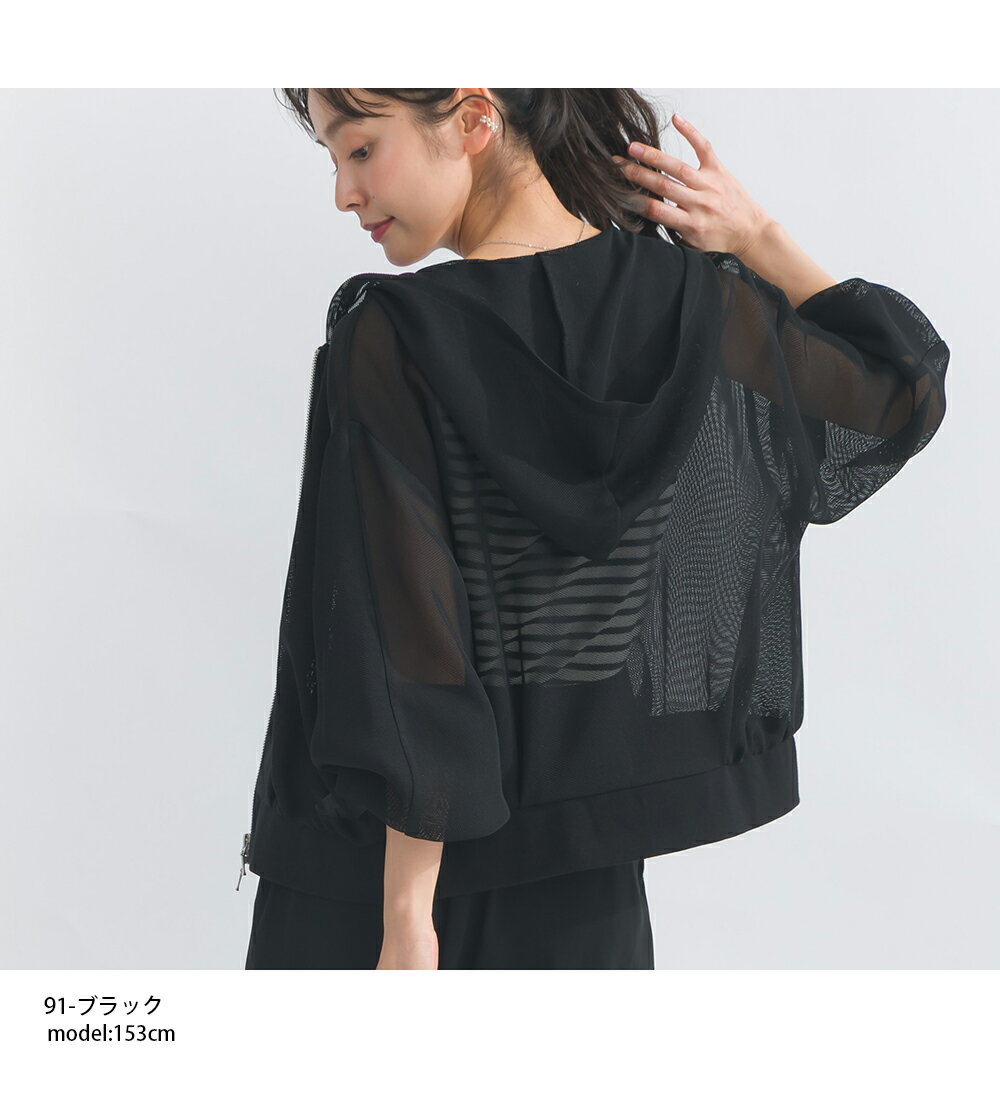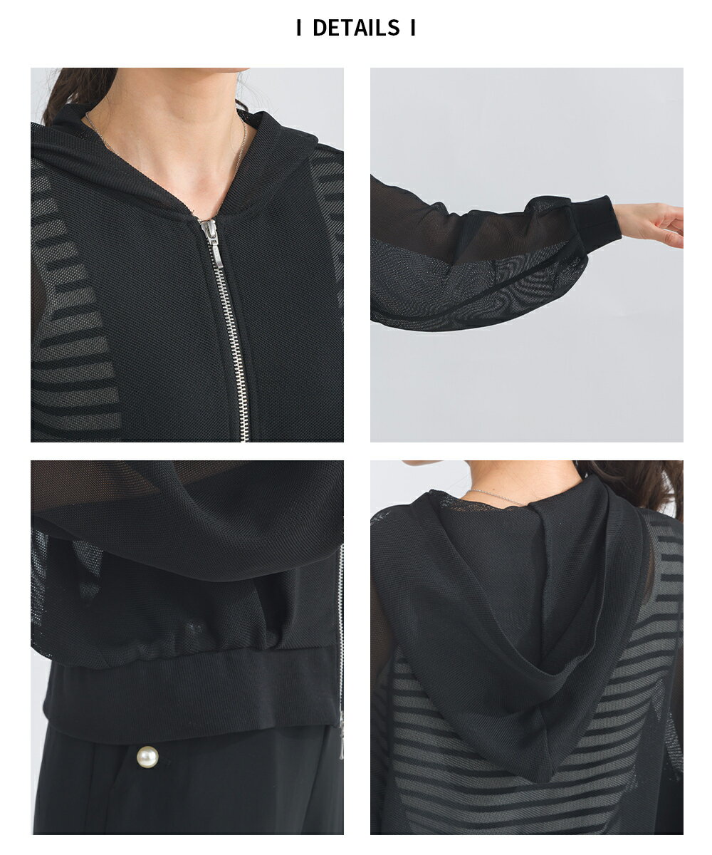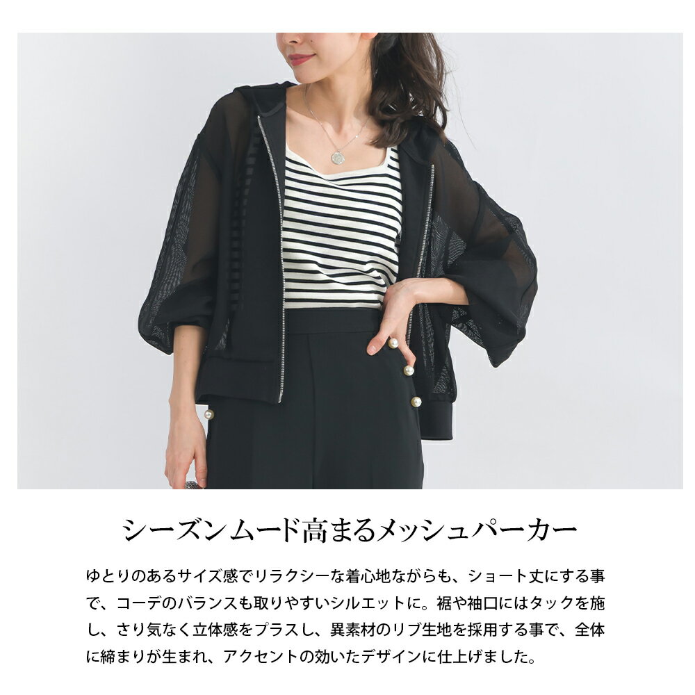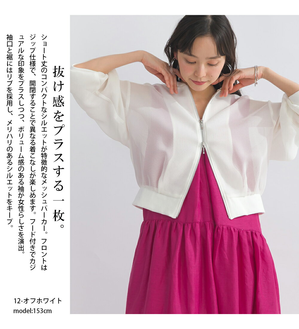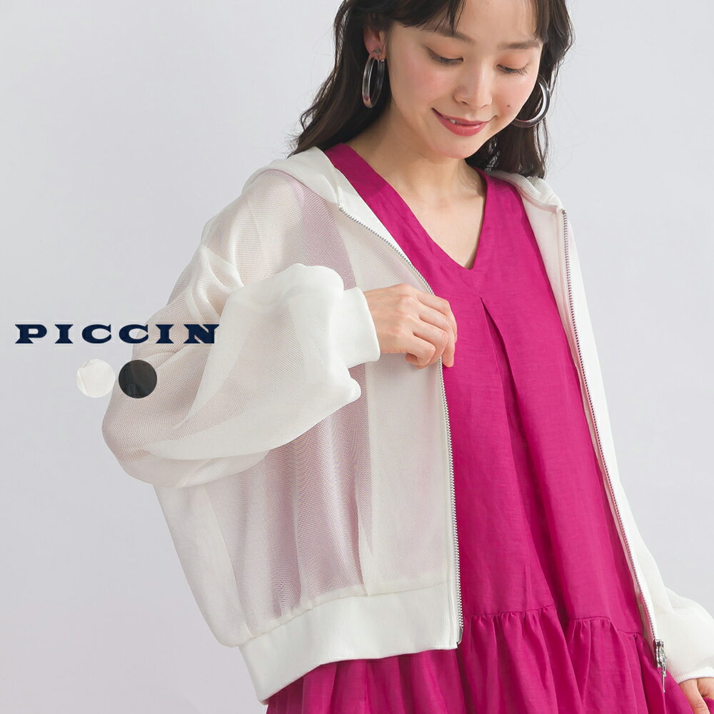 PICCIN メッシュパーカー レディース トップス パーカー メッシュ ショート丈 袖口リブ ダブルファスナー オフホワイト ブラック
