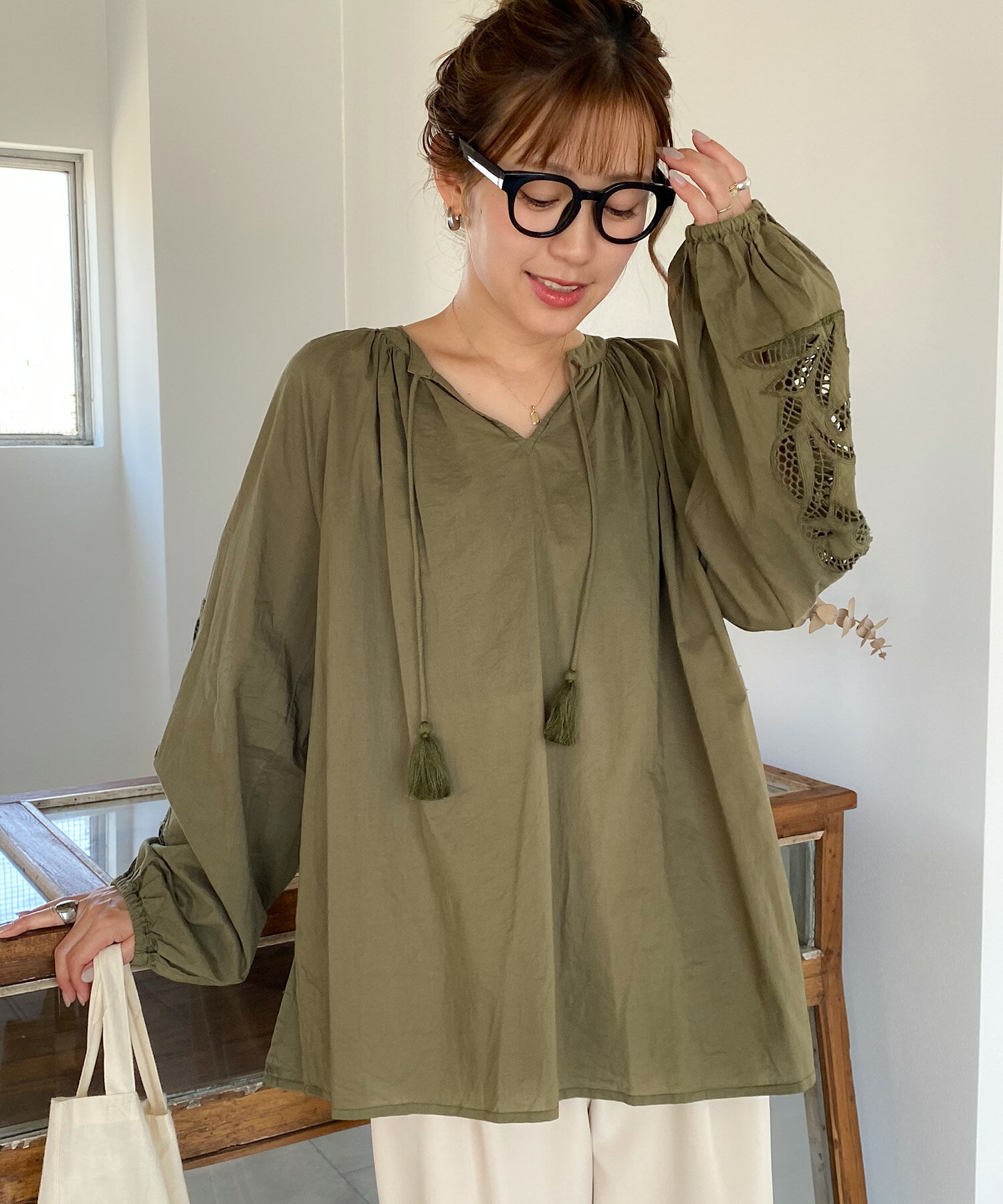 コットン刺繍ブラウス 刺繍 カットワークブラウス シフリーデザイン タッセル コットン インドコットン スタンドカラー Vネック 長袖 ブラウス チュニック 大人 カジュアル レディース PICHI ピイチ セレクト 6980 9.1