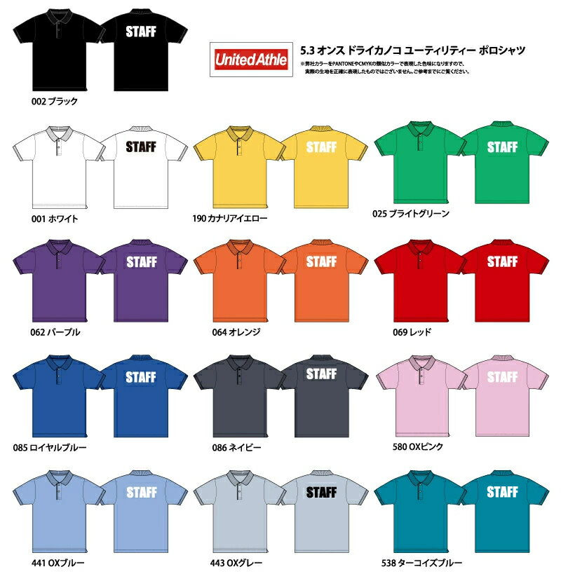5.3オンス ドライカノコ ユーティリティー スタッフポロシャツ(バックプリント)5050-01 STAFF ハイクオリティー イベント ユニフォーム 制服 余興 出し物 お揃い 衣装 ユナイテッドアスレ UnitedAthle シルクプリント オリジナルプリント