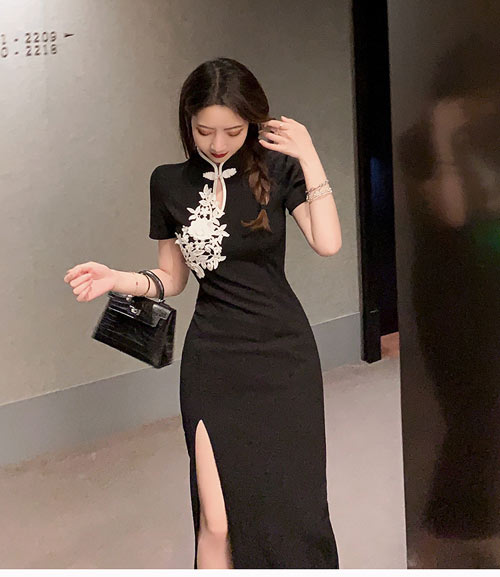 [M&Lサイズ」ドレス キャバドレス ワンピース セクシー ナイトドレス ワンピース キャバクラ ホステス 水商売 クラブ ワンピース ホステス 水商売 チャイナドレス 【刺繍配色パイピングチャイナロングセクシードレス 】
