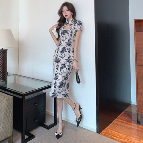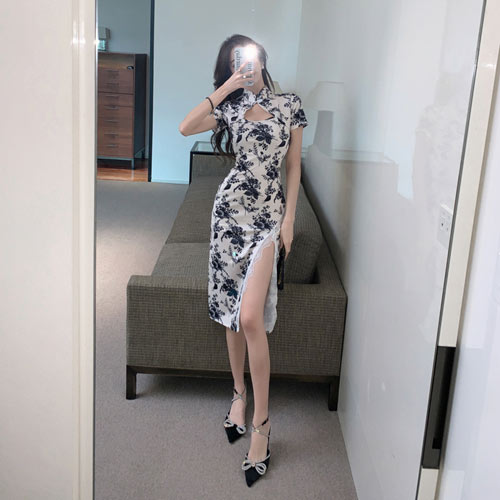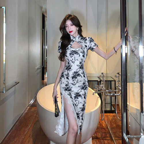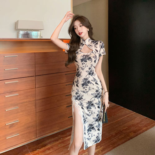 コスプレ「M&Lサイズ チャイナセクシーパイピング&プリント白レース装飾ミディアムドレス」 チャイナドレス ナイトドレス 高級 刺繍 おいらん キャバ 花魁 コスプレ パーティ セクシー 撮影会 グラビア 衣装