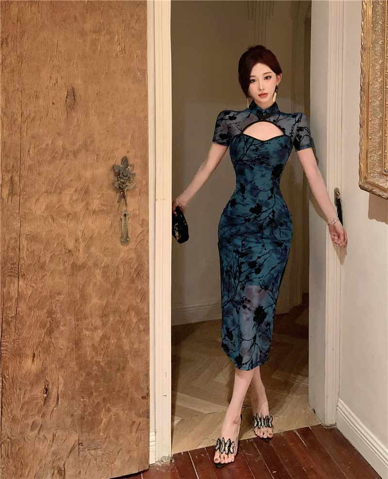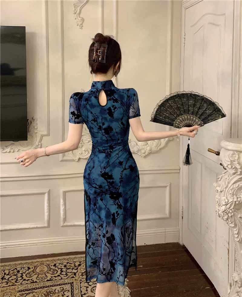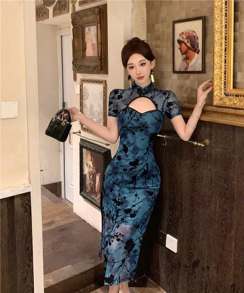 M&Lサイズ「フロッキー装飾黒パイピング高級素材半袖セクシーロングドレス」送料無料「沖縄、離島の方は除外」ドレス チャイナドレス キャバドレス ワンピース セクシー ナイトドレス ワンピース ホステス 水商売 結婚式 パーティーきれいめ 【smtb-k】【w4】