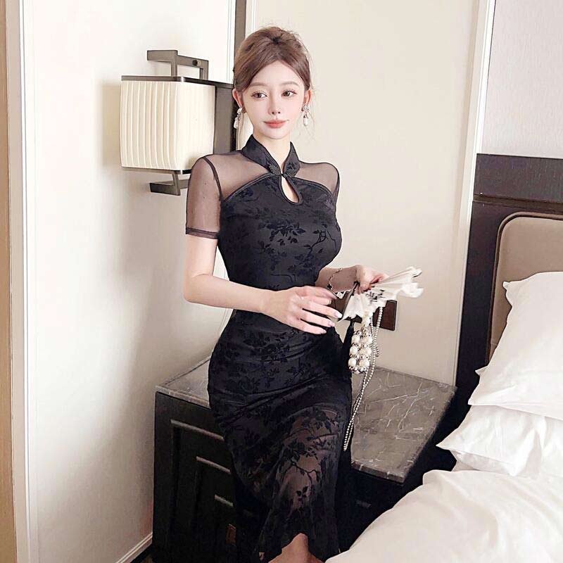 送料無料「沖縄、離島の方は除外」 【smtb-k】【w4】「黒フロッキーレース装飾高級素材半袖セクシードレス」ドレス チャイナドレス キャバドレス ワンピース セクシー ナイトドレス ワンピース ホステス 卒業式 謝恩会 パーティー 動画付です