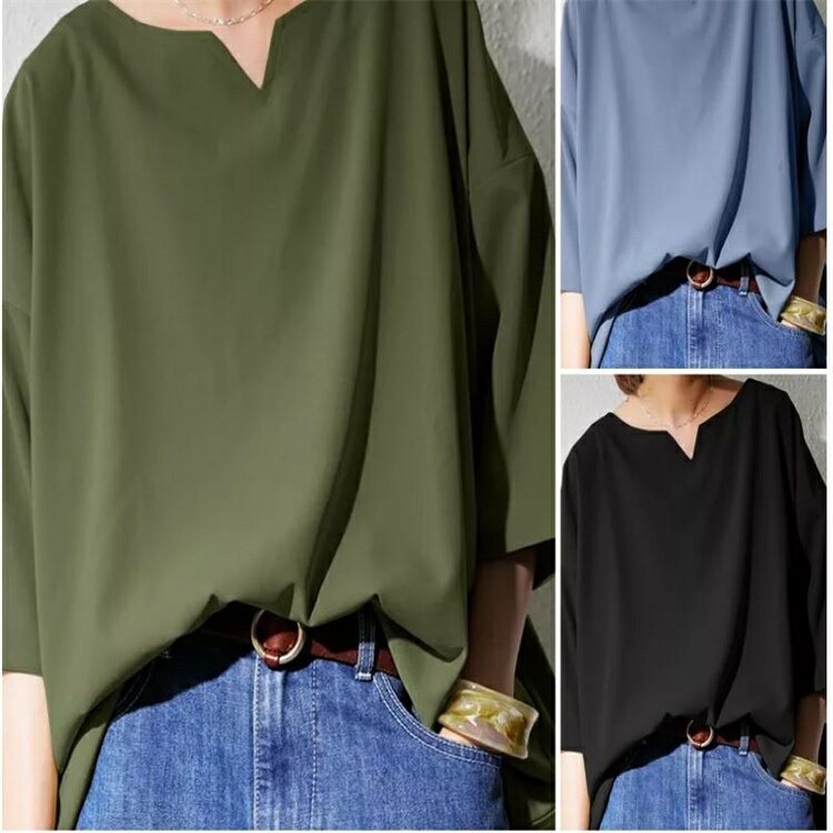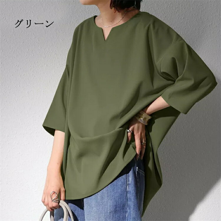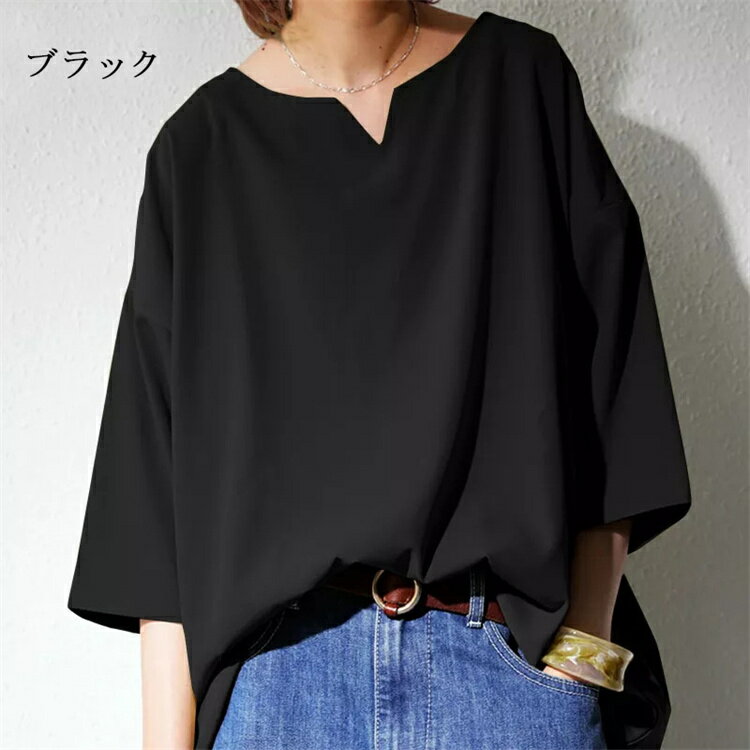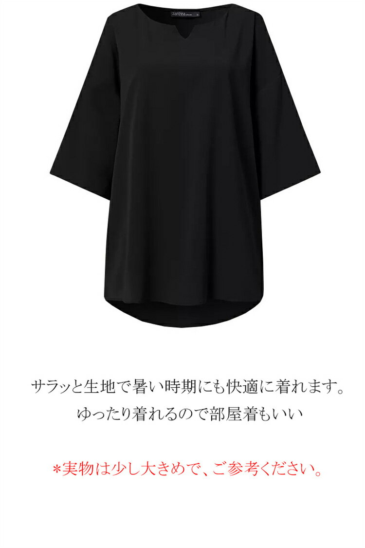 ★6・15限定全品P5倍★シャツ レディース チュニック ブラウス シャツブラウス Tシャツ vネック スキッパーカラー 無地 7分袖 半袖プルオーバー ゆったり 大きいサイズ 不規則裾 アシンメトリー 前後差 ゆるっと トップス 春 夏 レディース ブラック
