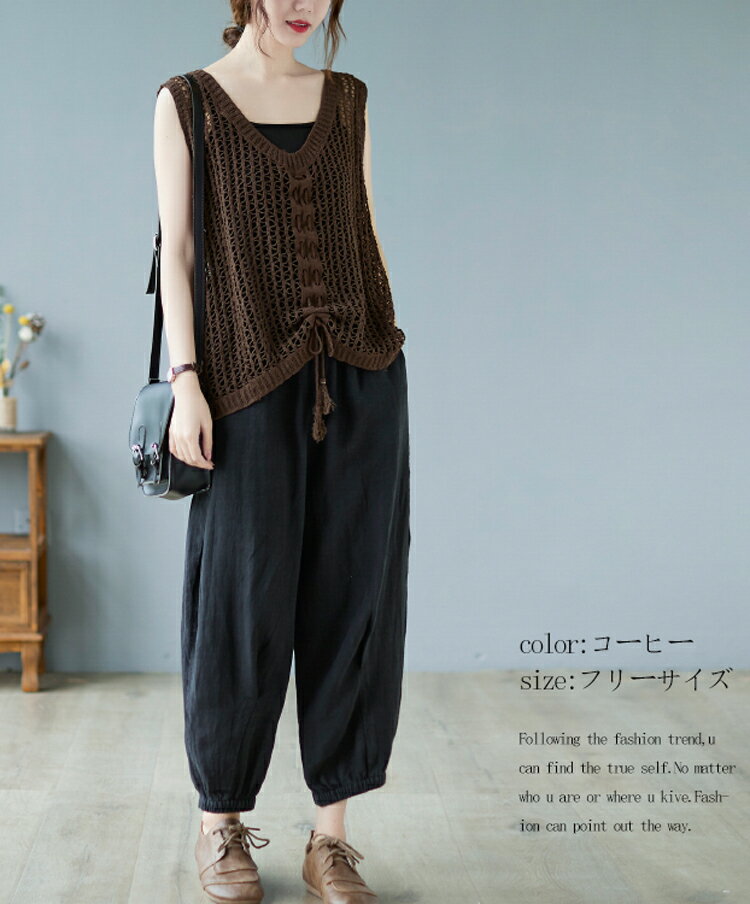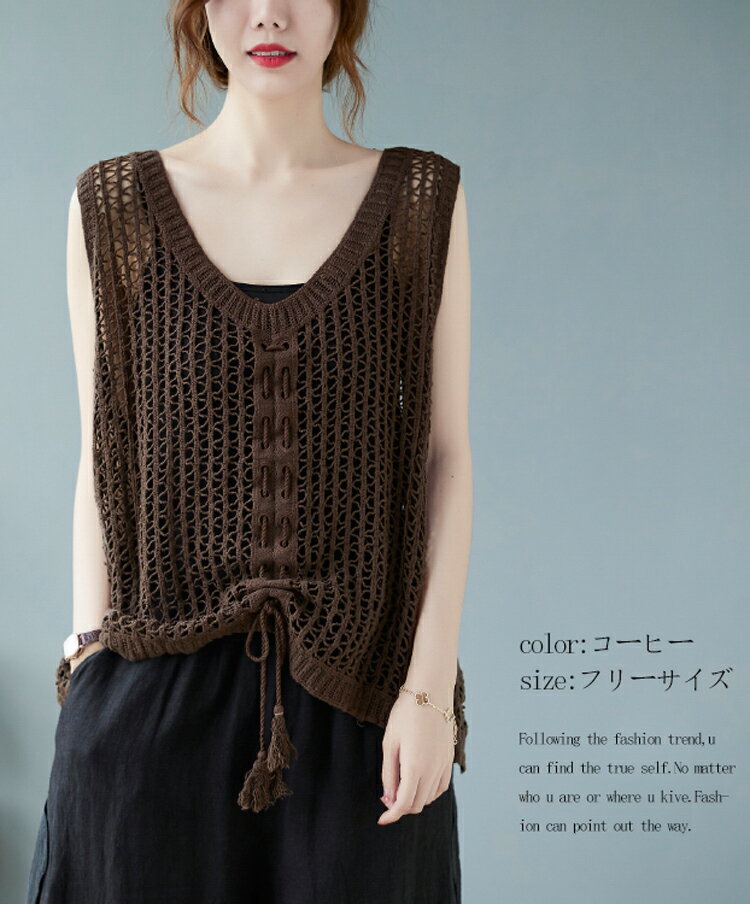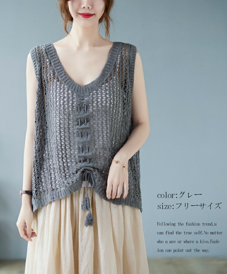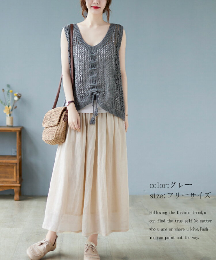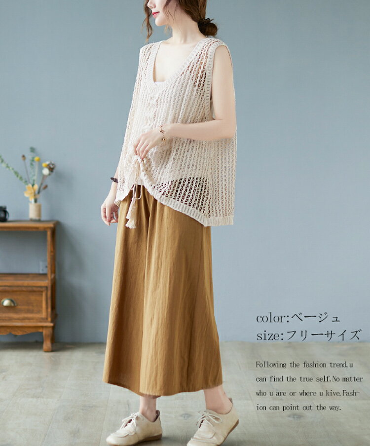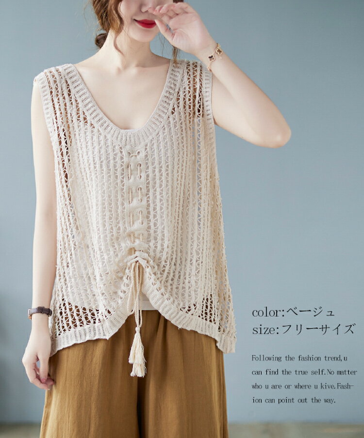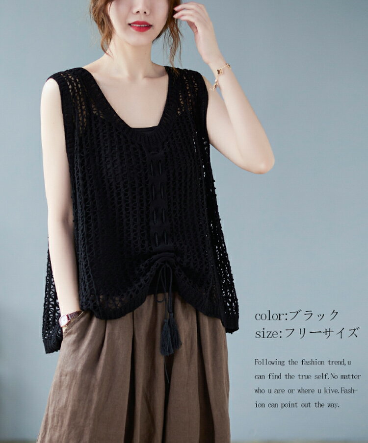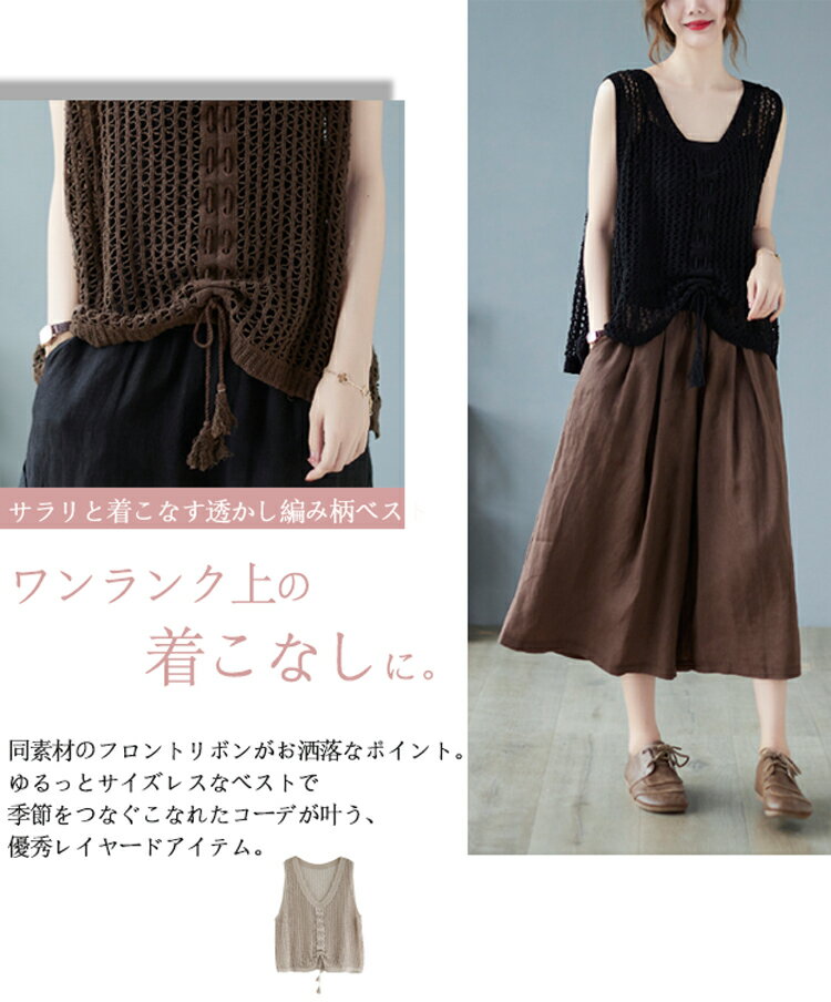 透かし編み ニット ベスト レディース 綿 大きめ 透ける ニットベスト 夏 リボン 重ね着 サマーニット ノースリーブ vネック ゆったり 夏ベスト 薄手 vネックベスト お洒落 きれいめ ストレッチ コットン 綿ベスト 通気性 編地 切り替え