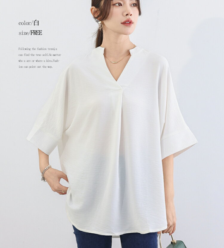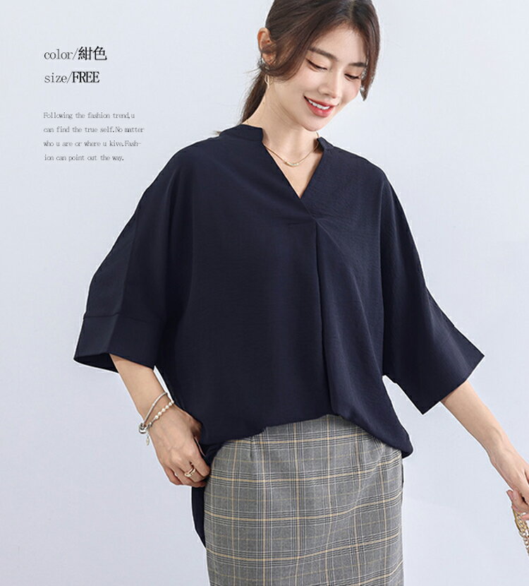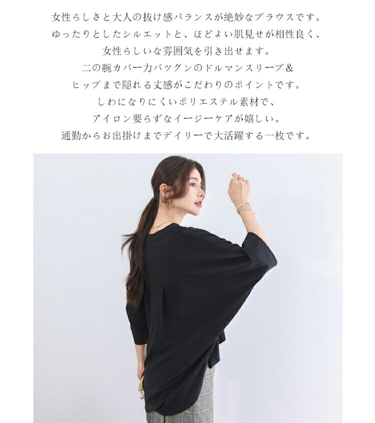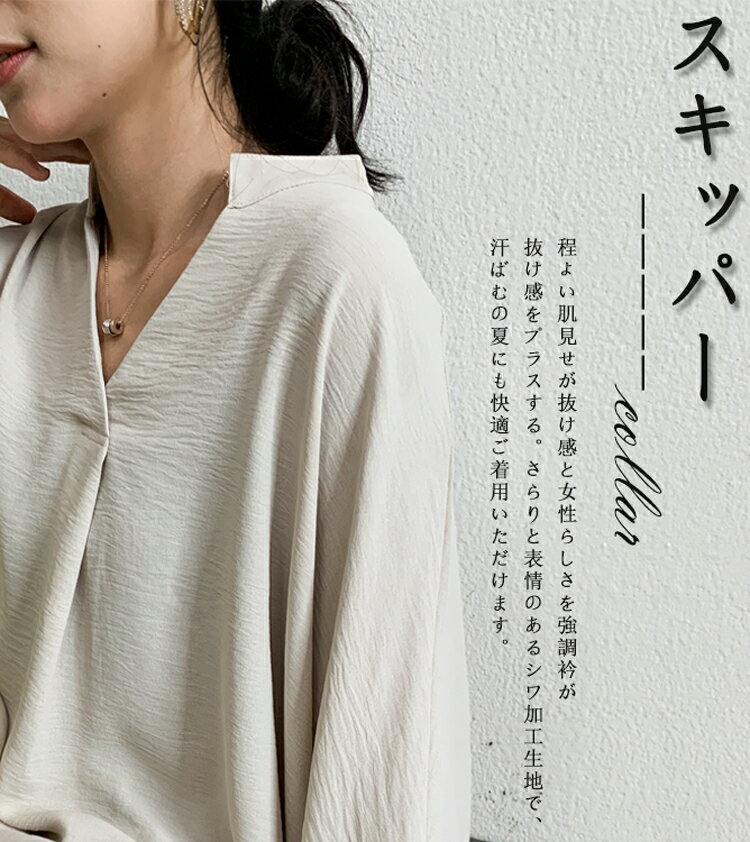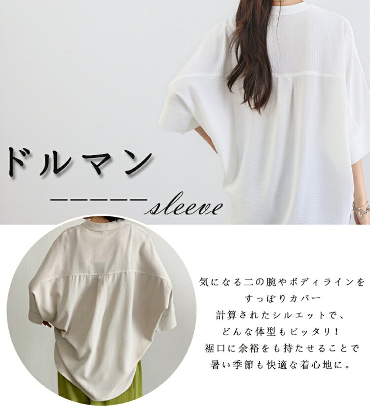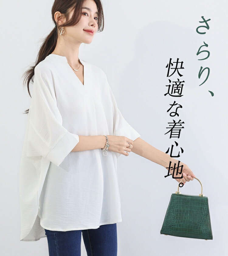 チュニック 夏 レディース ゆったり ブラウス オフィス 7分袖 スキッパーシャツ 大きいサイズ バンドカラー シャツ シワになりにくい さらりと ボリューム スキッパーブラウス 女性 vネック ドルマンブラウス 体型カバー 着痩せ