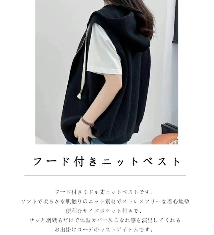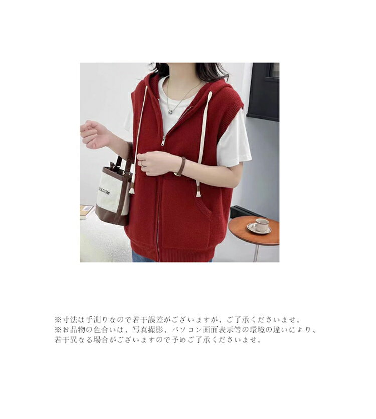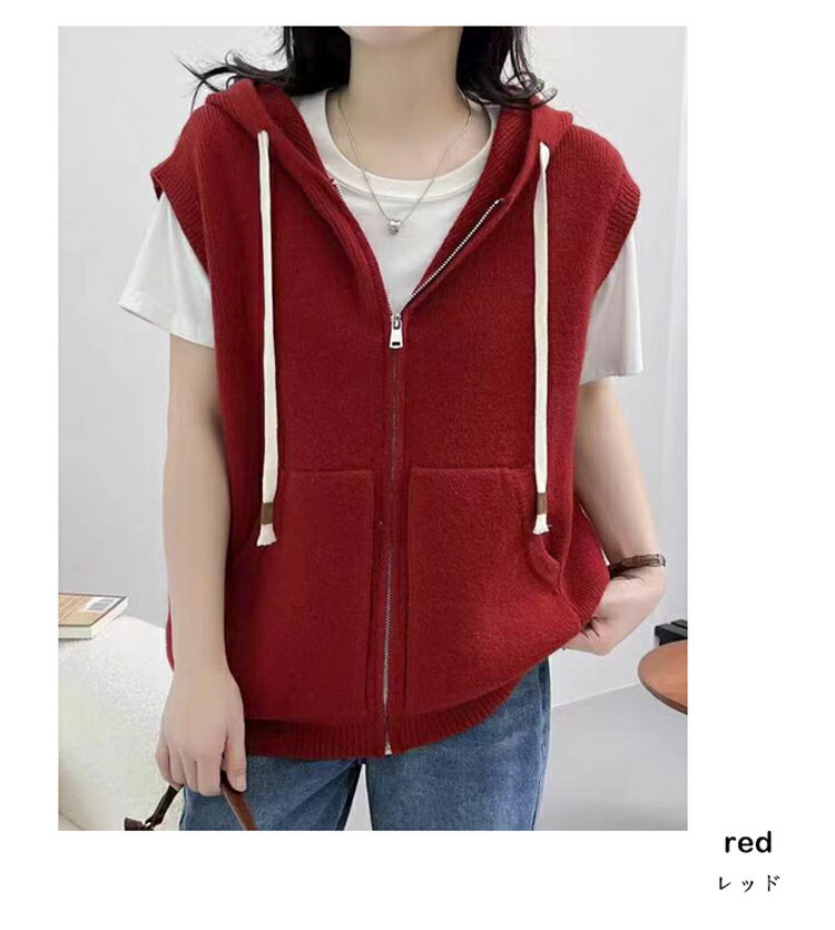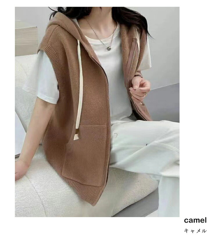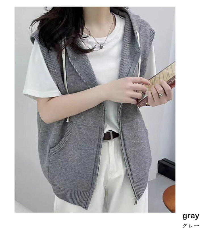 フード付き ベスト レディース 春夏 ニットベスト 前開き ファスナー フード ニット ノースリーブ 重ね着 コーデ ニットトップス リブ レイヤード カーディガン ミドル丈 ジップアップ ニットカーディガン 韓国ファション 通学 日常 カーデ 袖なし お洒落