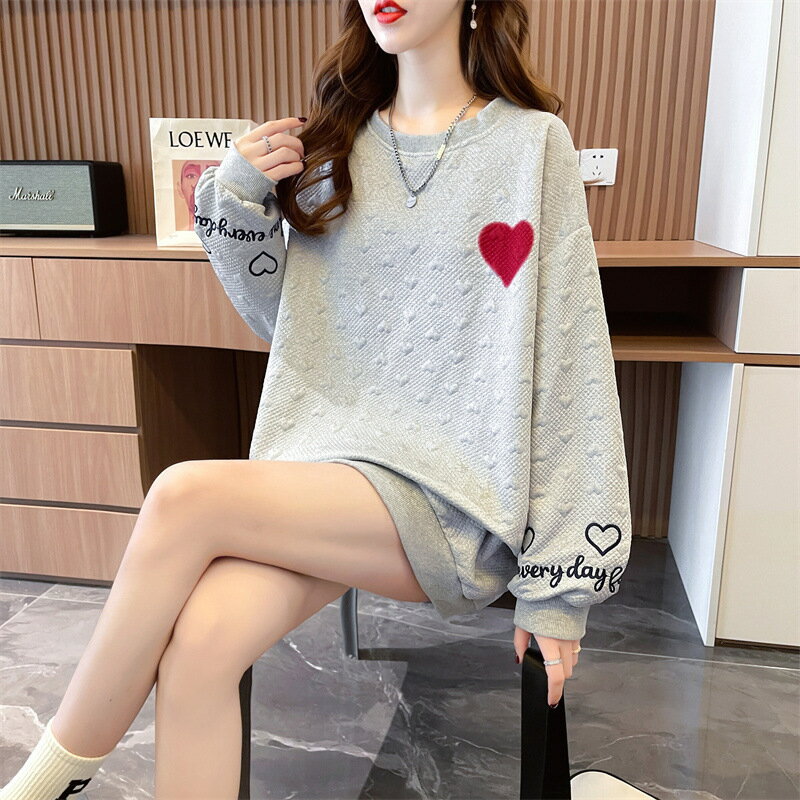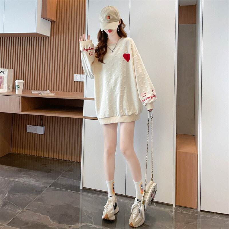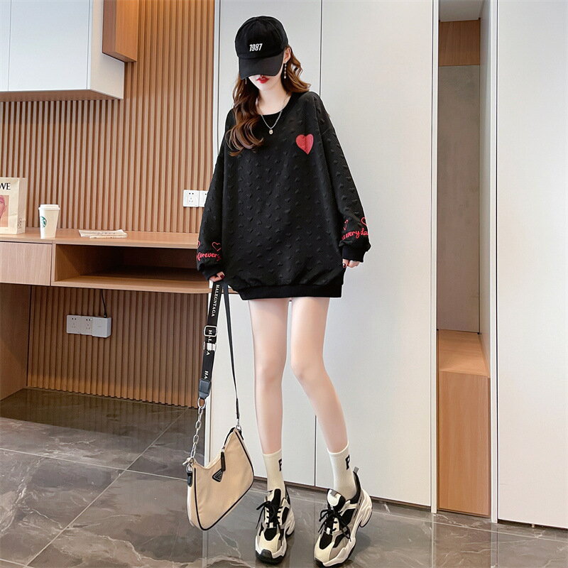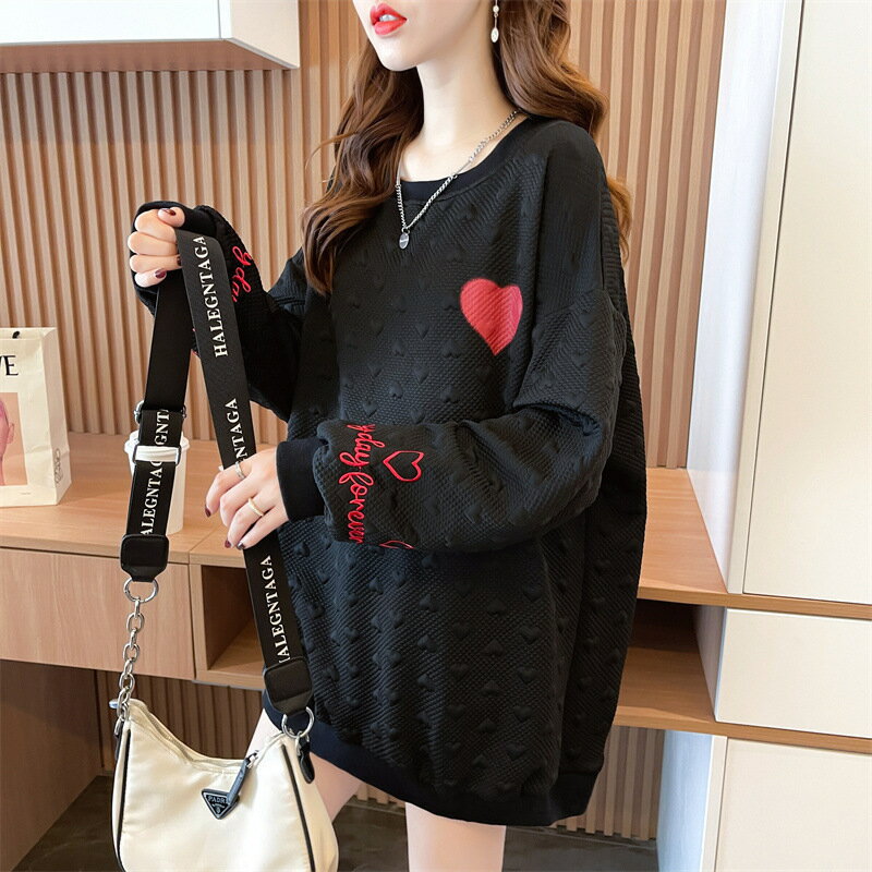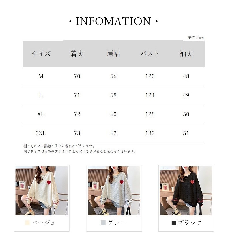 送料無料 トレーナー チュニック レディース 女性 トップス 長袖 丸首 ラウンドネック クルーネック 袖リブ 裾リブ ドロップショルダー 総柄 ハート ロゴ ベージュ ブラック かわいい キュート カジュアル ポップ おしゃれ ゆったり 大きめ 秋 冬