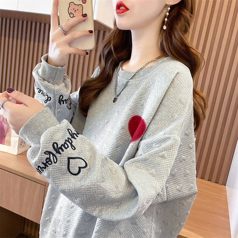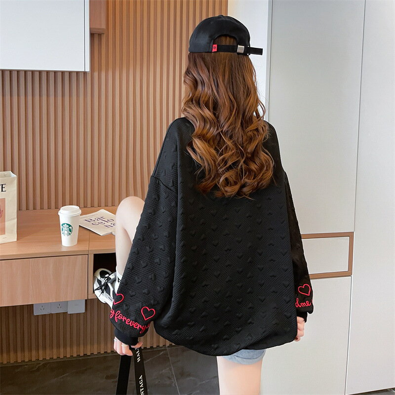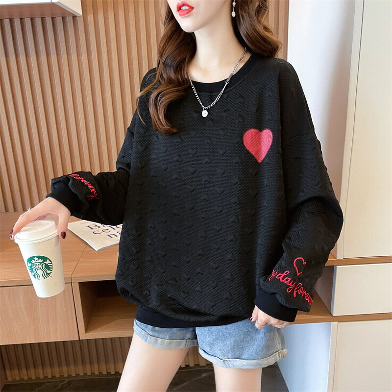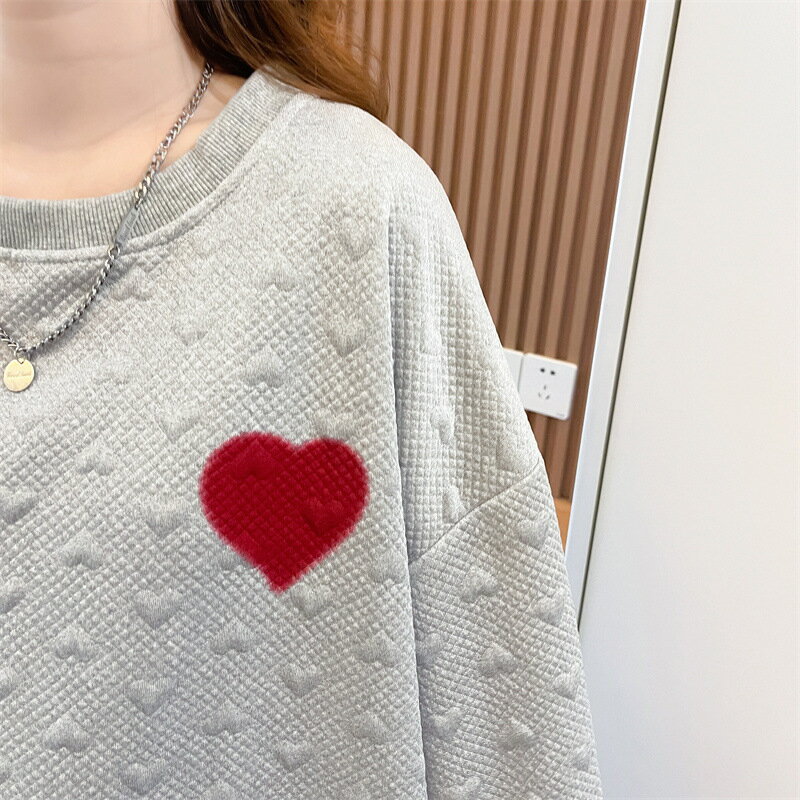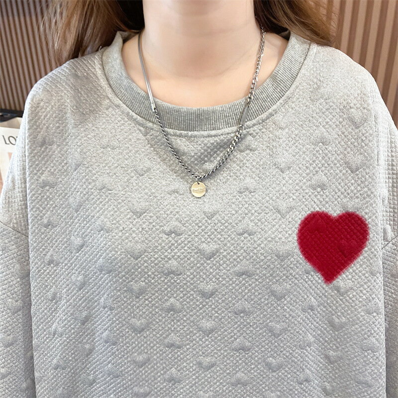 送料無料 トレーナー チュニック レディース 女性 トップス 長袖 丸首 ラウンドネック クルーネック 袖リブ 裾リブ ドロップショルダー 総柄 ハート ロゴ ベージュ ブラック かわいい キュート カジュアル ポップ おしゃれ ゆったり 大きめ 秋 冬