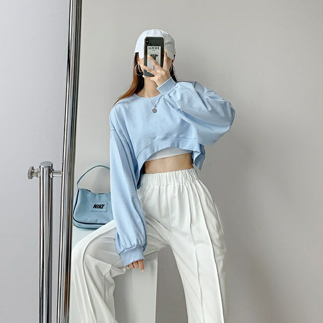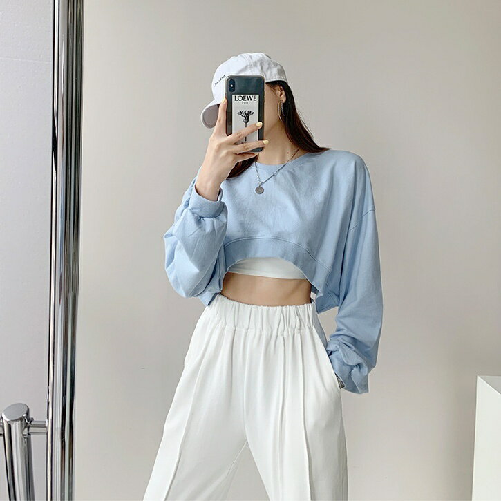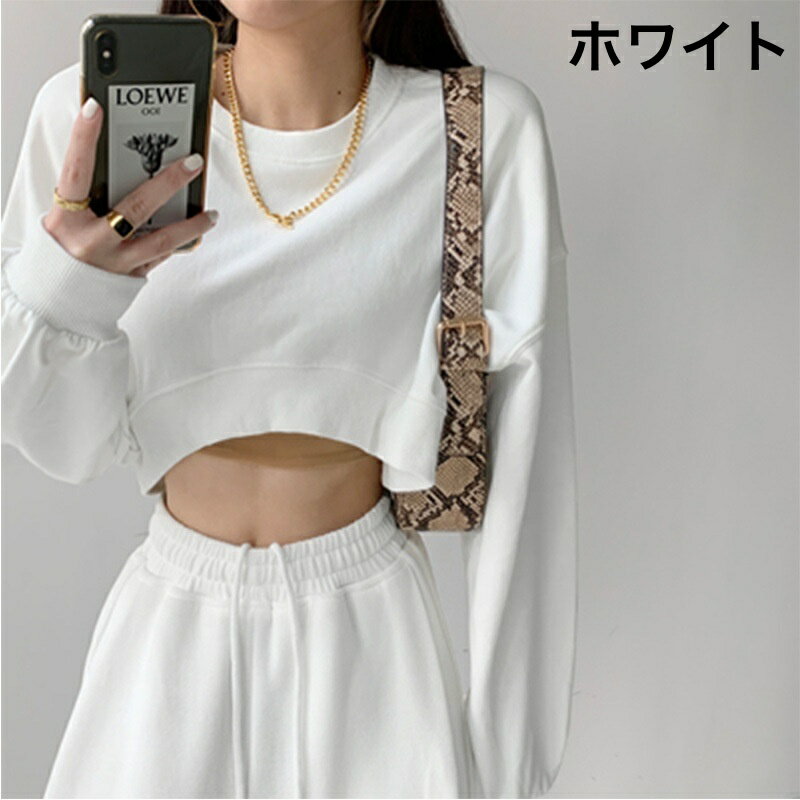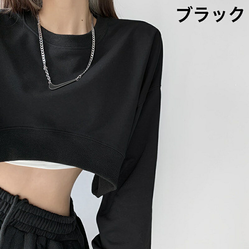 送料無料 トレーナー 長袖 クロップド丈 ショート丈 レディース 女性 トップス ラウンドネック ヘソ出し 肌見せ 無地 カジュアル 可愛い おしゃれ ゆったり お出かけ 部屋着 外出 旅行 婦人用