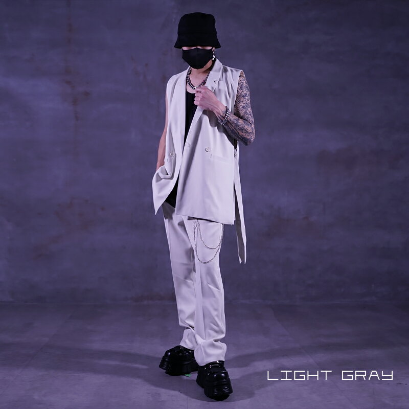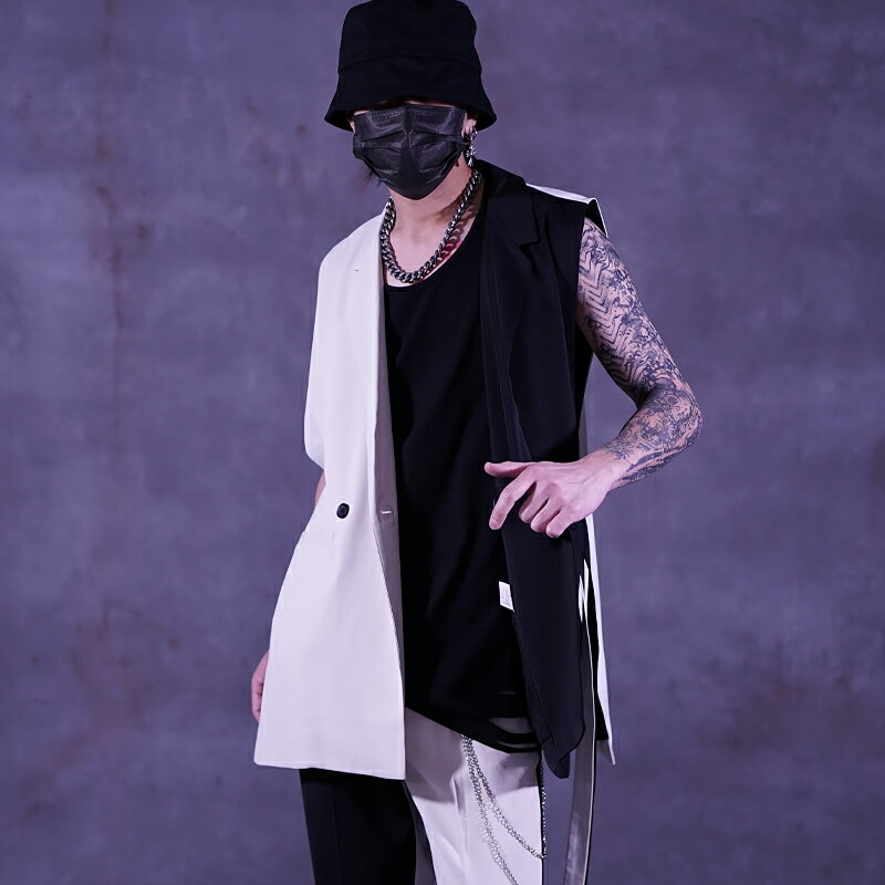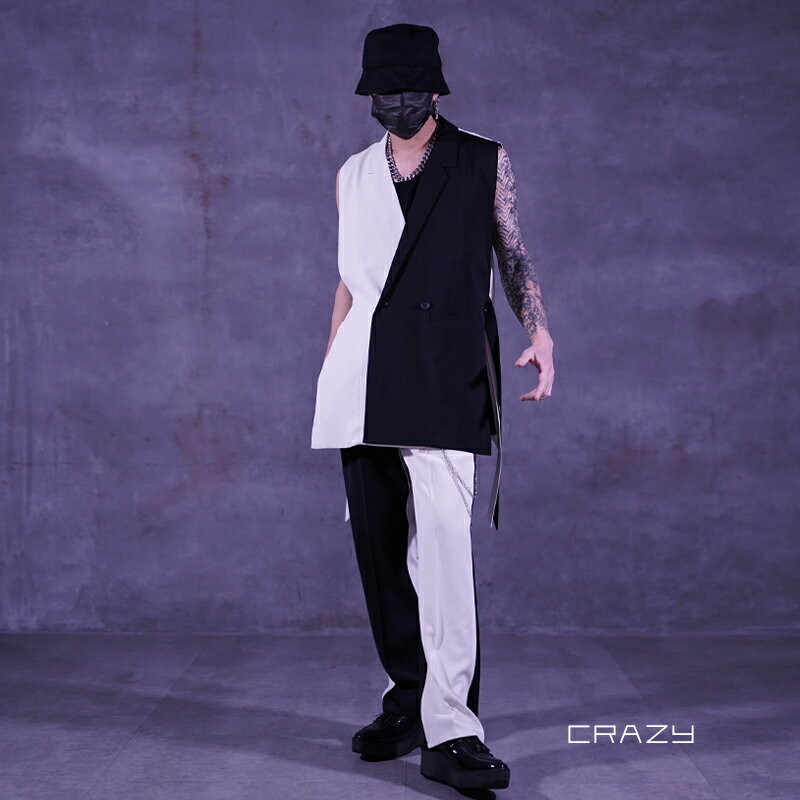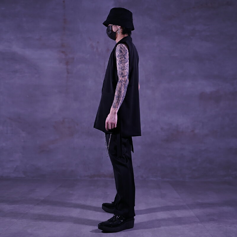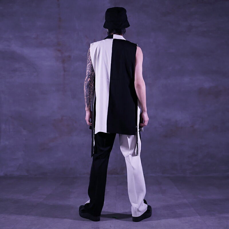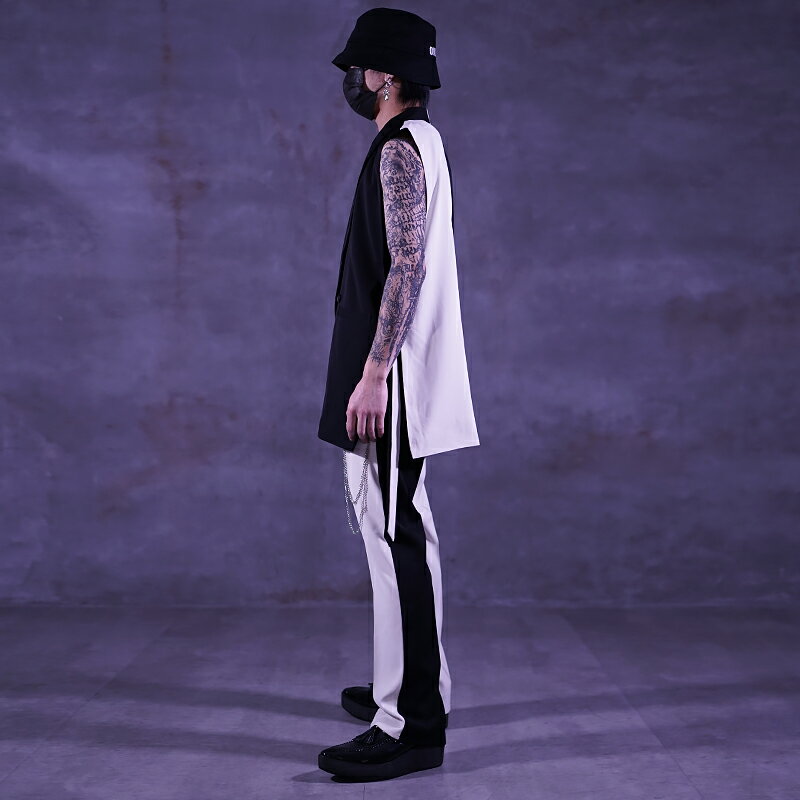 セットアップ メンズ 上下セット 2点セット ジレ ベスト ロング丈 ロングジレ ベスト ホスト V系 ヴィジュアル系 ファッション オーバーサイズ 黒 ブラック ブラックコーデ モード系 白 ホワイト スラックス スーツ フレアパンツ パンク ロック オシャレ 原宿系 オズ Oz