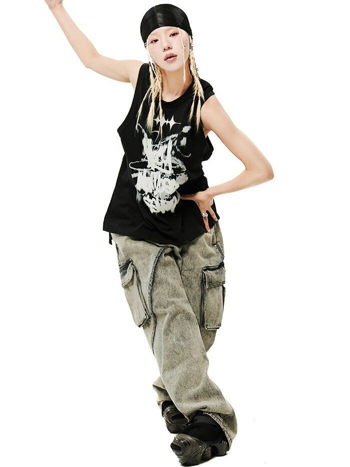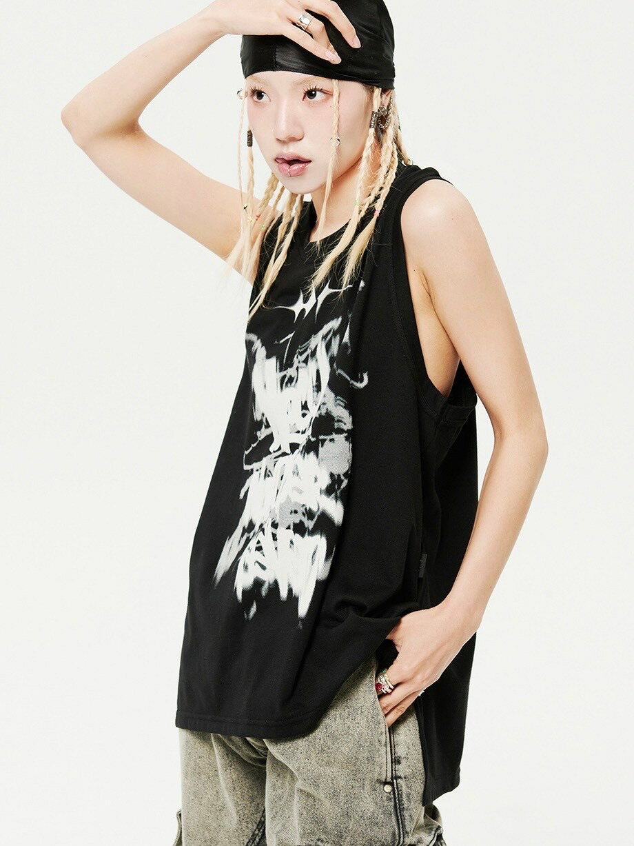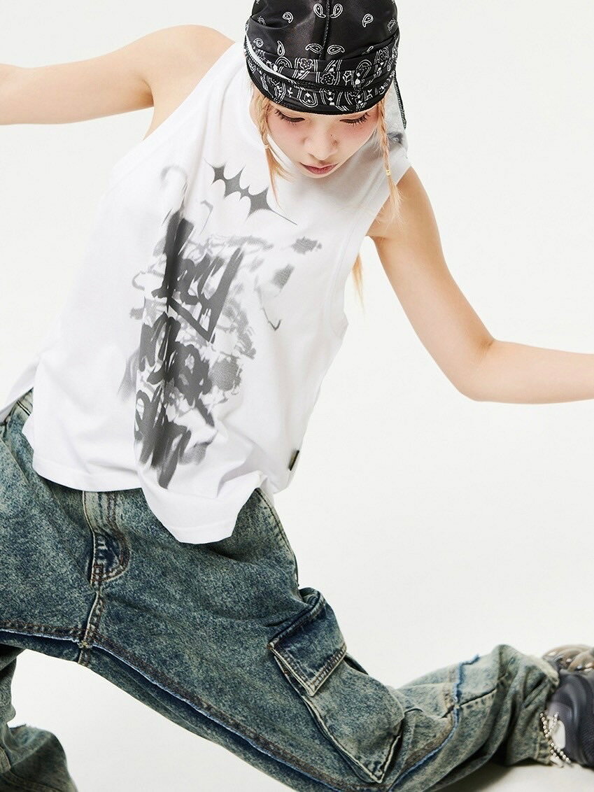 正規品【HOLY NUMBER 7 Oversized Hip Hop Dance Studio Vintage Sleeveless T-shirt】ノースリーブ 半袖トップス オーバーサイズ ユニセックス タンクトップ ストリートファッション
