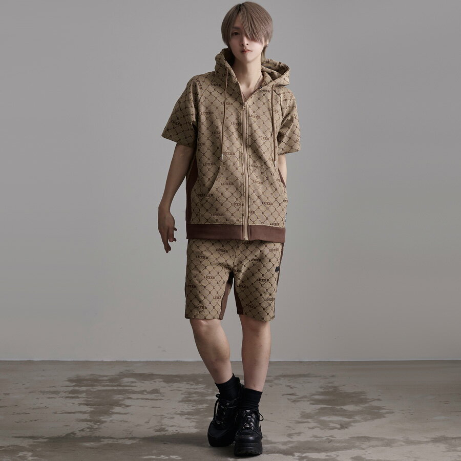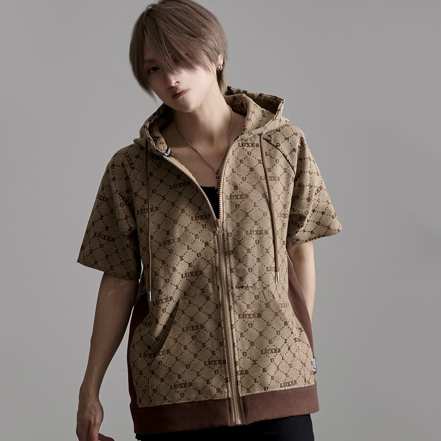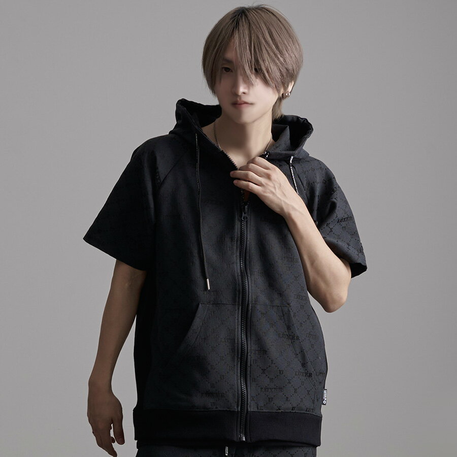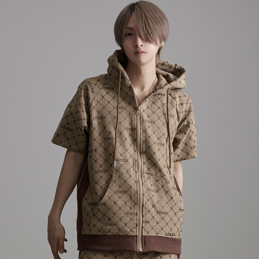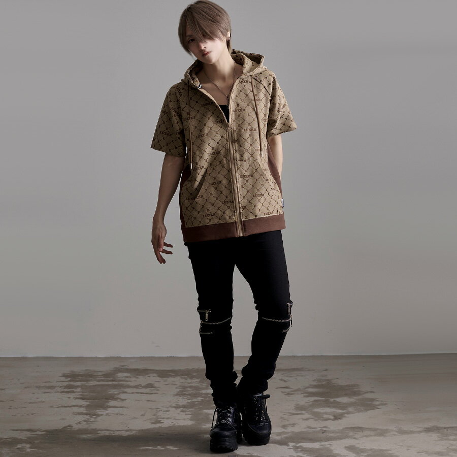 "CV Select【シーブイセレクト】ジャガードロゴ総柄半袖ジップパーカー/全2色"パーカー セットアップ可能 ホスト系 ジップアップ ジップパーカー 地雷系 ジャガード Y2K きれいめ 大人 V系 メンズ 黒 ブラック ベージュ 総柄 ファッション 服 半袖 ストリート系