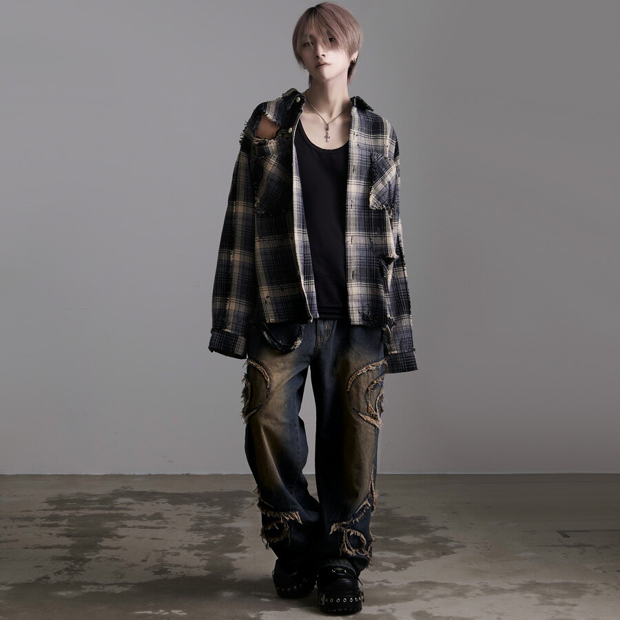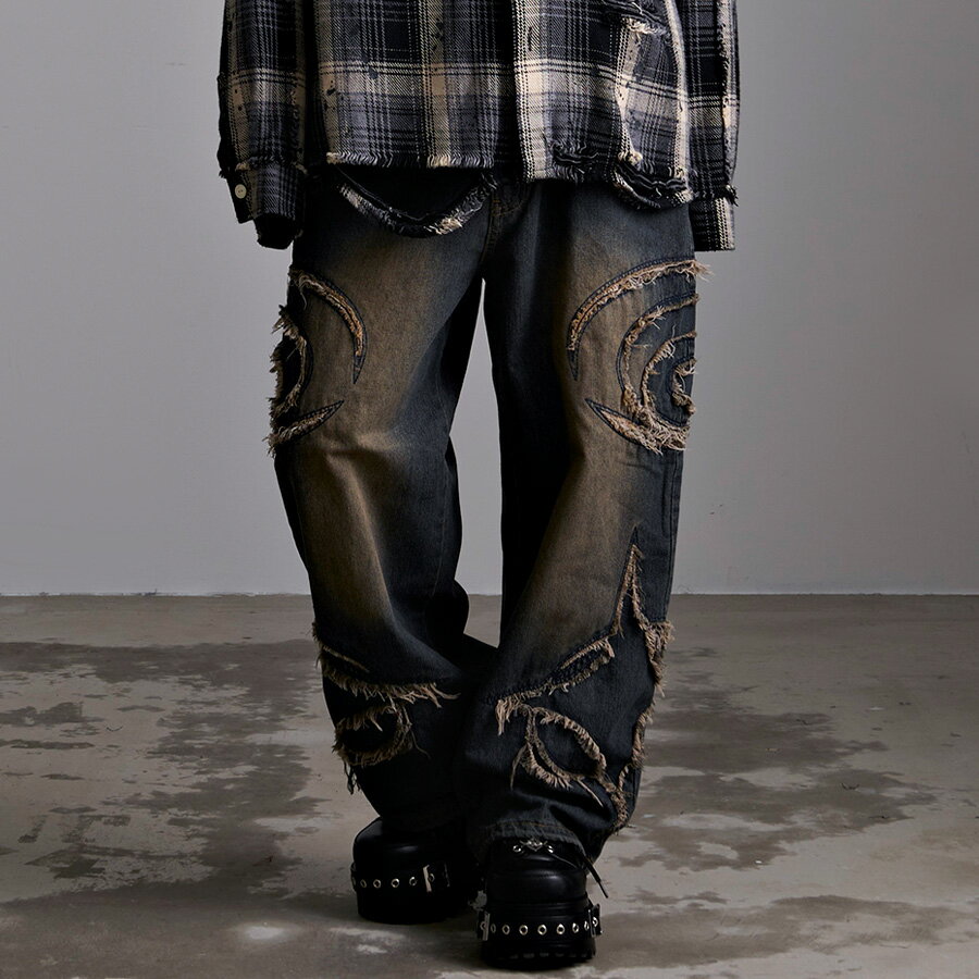 "CV Select【シーブイセレクト】トライバルフリンジバギーデニムパンツ/全2色"デニムパンツ メンズ ジーンズ ジーパン Gパン 大きいサイズ ワイドパンツ ワイドデニム 太め ゆったり ブラック ブルー 黒 青 インディゴ M L V系 ヴィジュアル系 地雷系 サブカル系 韓国系