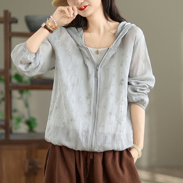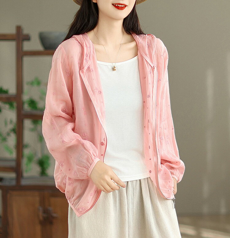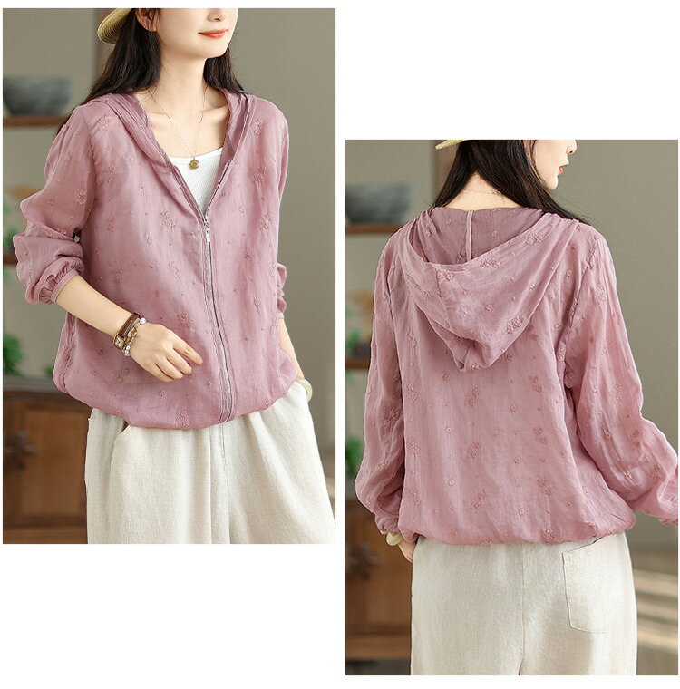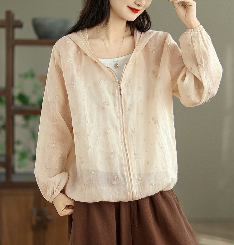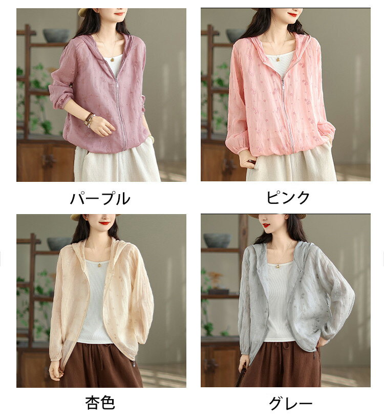パーカー UVカット レディース 夏 フード付き リネン混 刺繍 リネンアウター ラッシュガード 春 長袖 薄手 ゆったり 長袖パーカー 透け感 カーディガン ライトアウター 日焼け防止 冷房対策 羽織り ショート丈 通気性 UV対策 トップス 夏用 涼しい ブルゾン 旅行 夏物 夏服
