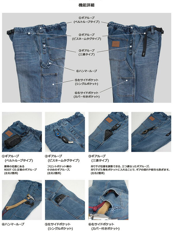 ROOT CO ルートコー パンツ ギアパンツ メンズ レディース アウトドア キャンプ ユニセックス デニム Stretch Denim Pants ストレッチ デニムパンツ ワークパンツ ペインター タウンユース 11オンス ギアループ バーベキュー 釣り ブルー ブラック PSDP-4319