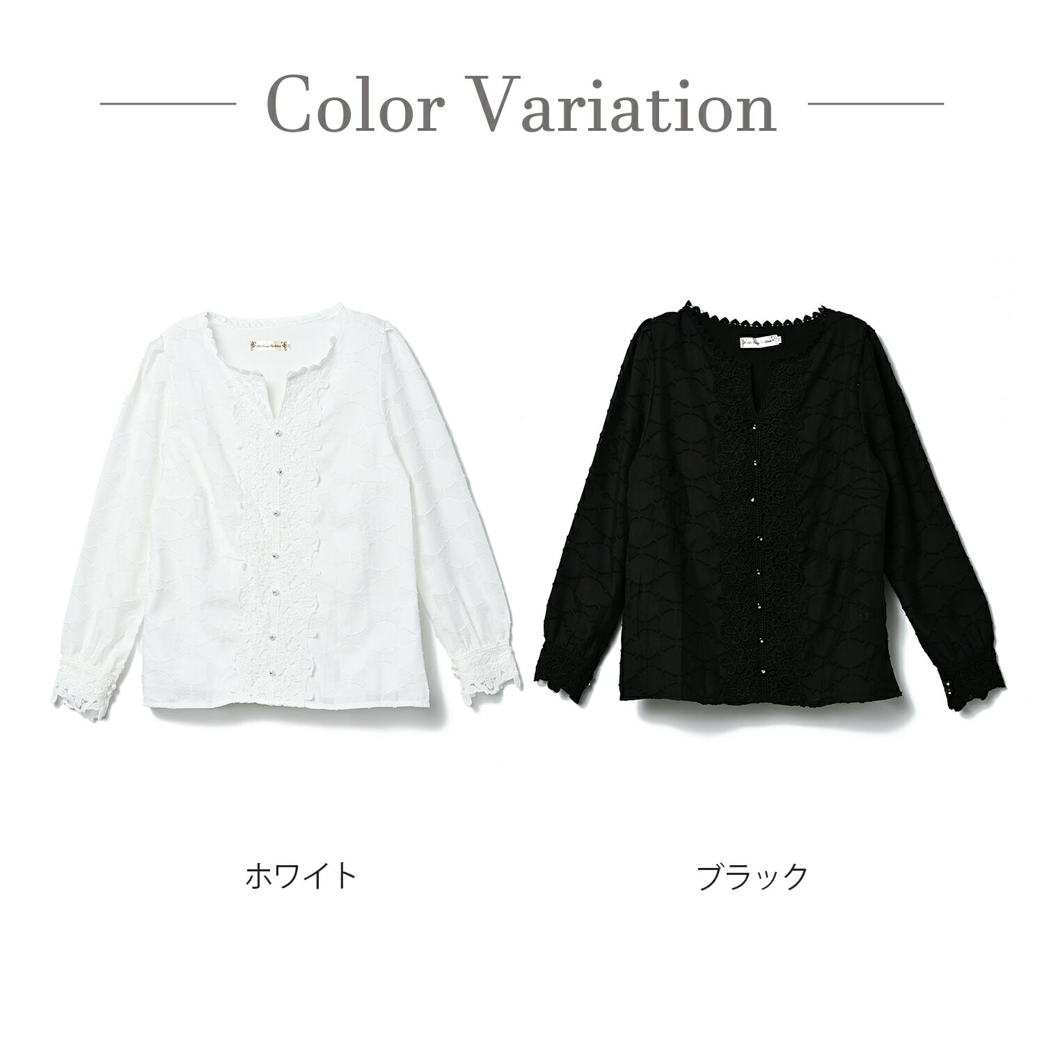 楽天1位・クーポンでお得!! ドット レース 刺繍 ブラウス 上品 長袖 スキッパー ノーカラー 白 黒 / レディース きれいめ トップス レースブラウス 白シャツ 白ブラウス フォーマル オフィス カジュアル オフィスカジュアル 大きいサイズ 韓国 春 夏 秋 冬 ホワイト ブラック