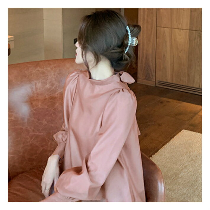 クーポン&P2倍!! バック リボン パフスリーブ チュニック ブラウス 長袖 フレア 上品 清楚 ハイネック / レディース トップス 無地 ゆったり シースルー パフ袖 シフォン ふんわり チュニックブラウス 背中 リボン フリル 結婚式 ボリューム袖 春夏 秋冬 白 ピンク ホワイト