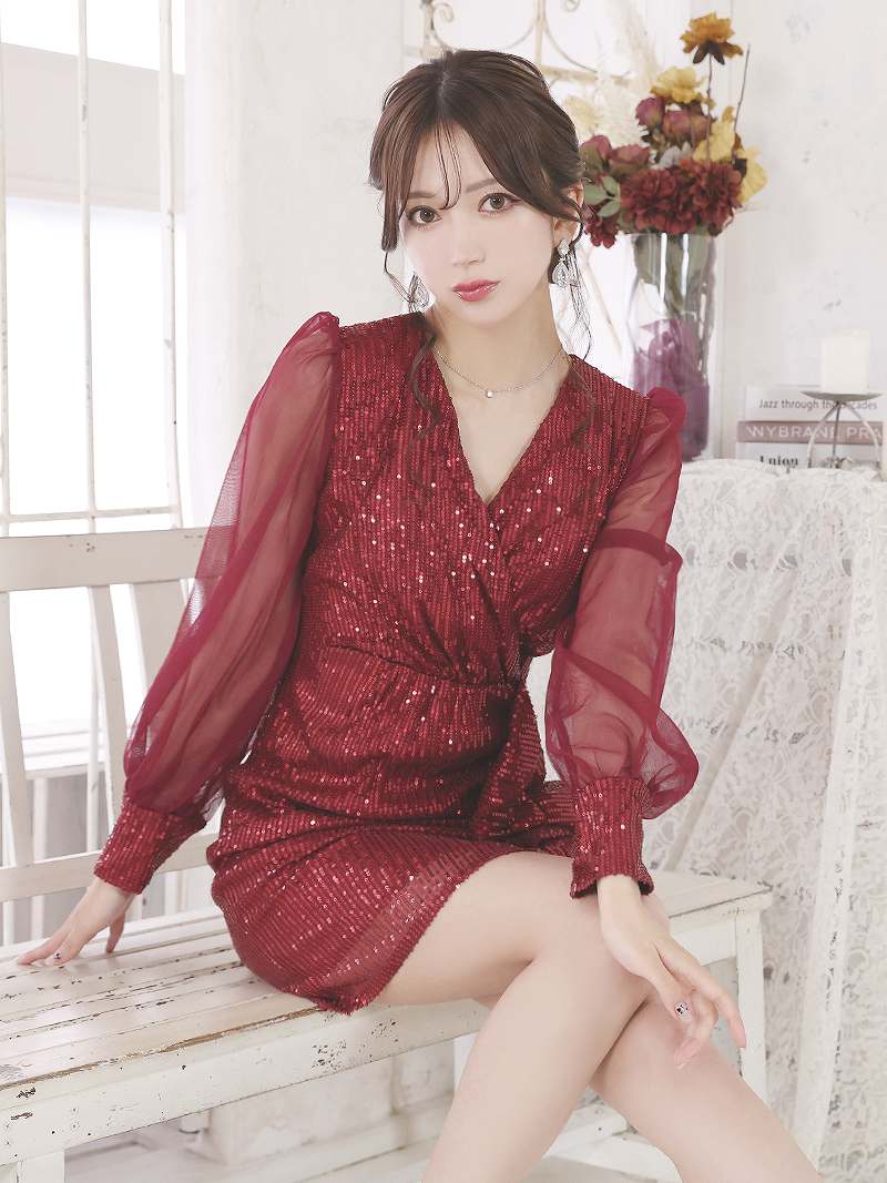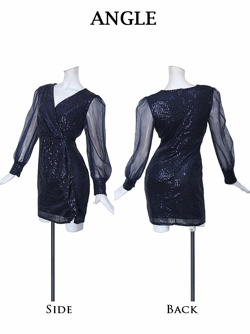 キャバ ドレス キャバドレス ミニドレス ミニ キャバクラドレス キャバクラ パーティードレス セクシー 韓国ドレス 韓国 スパンコール 胸下切り替え プチプラ 体型カバー 袖付き シフォン袖 肌透け 長袖でも軽い 美デコルテ カシュクール RyuyuChick あす楽 送料無料