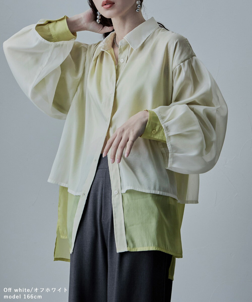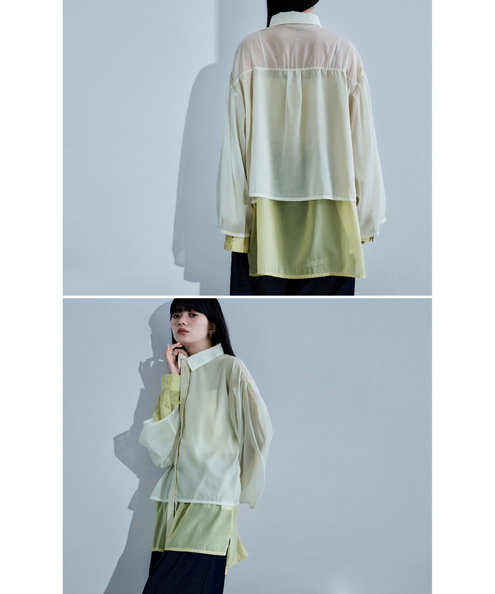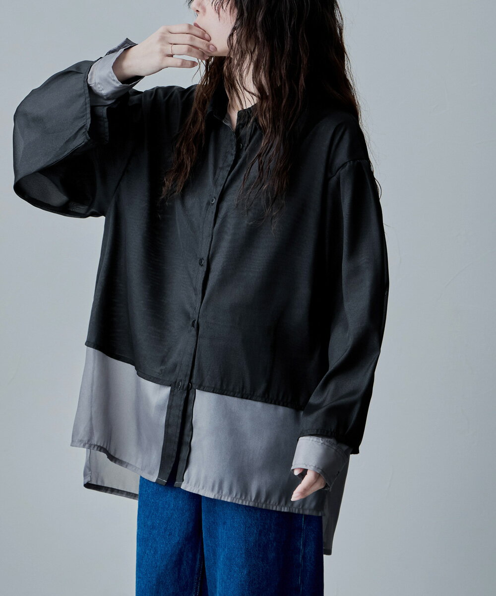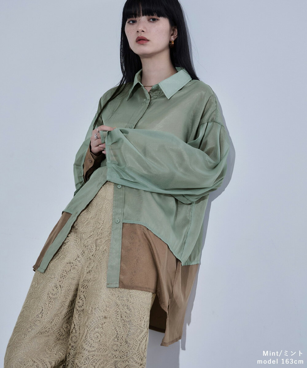 【全品8%オフクーポン!】ラメシアーレイヤードバイカラーシャツ トップス シャツ ブラウス シアーシャツ 長袖 バイカラー カラーシャツ ビッグシルエット ドッキングシャツ 重ね着風 レイヤード 無地