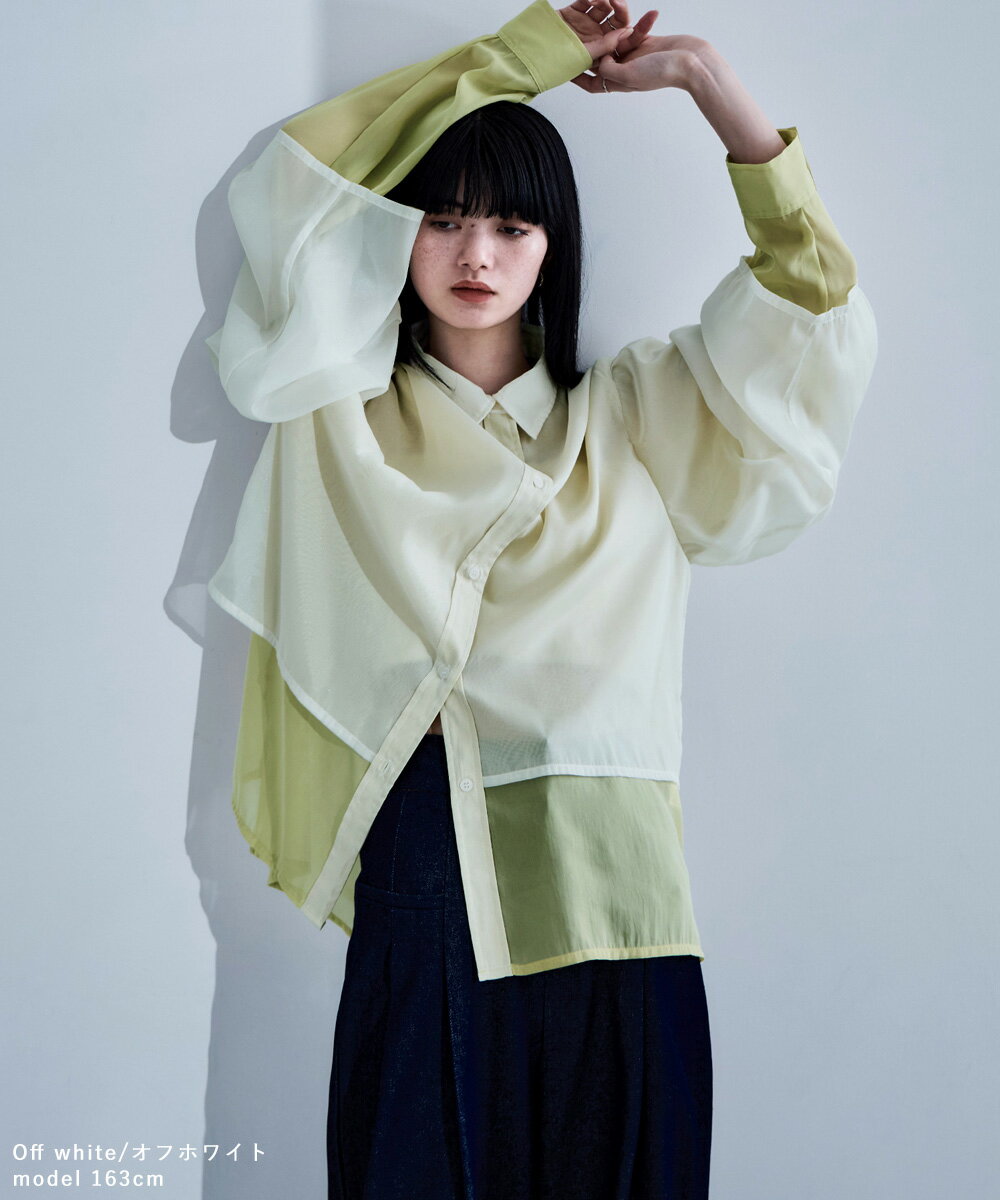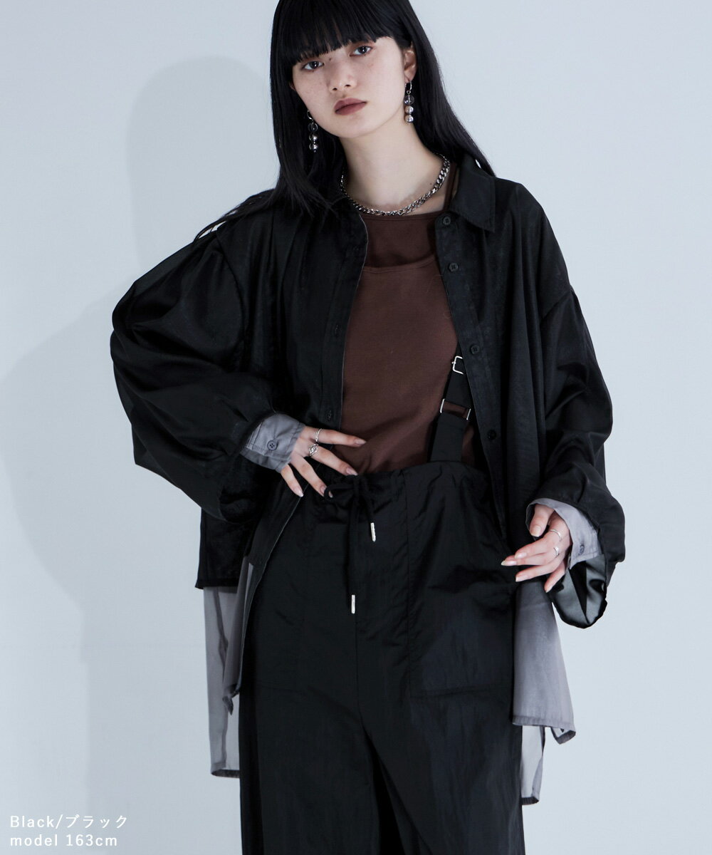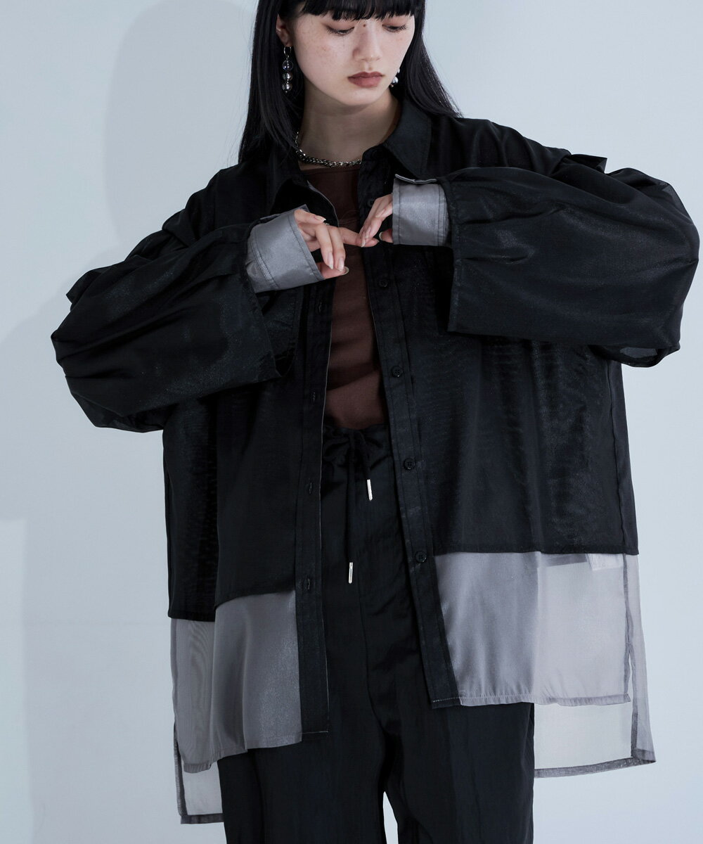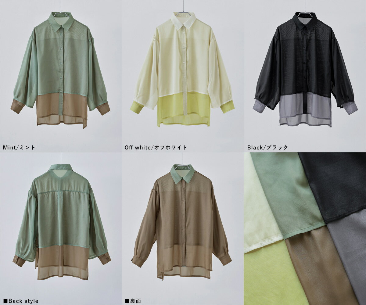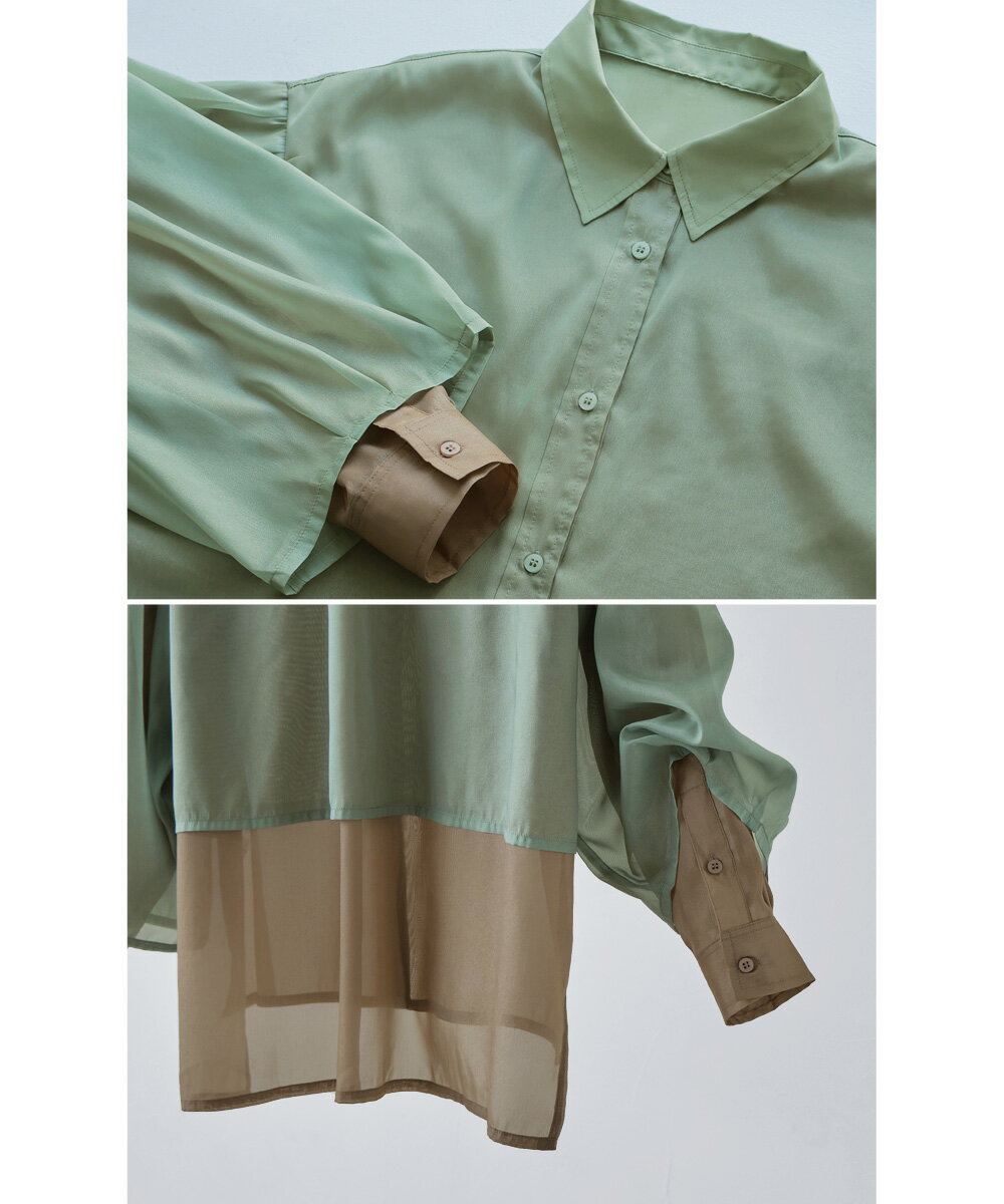 【全品8%オフクーポン!】ラメシアーレイヤードバイカラーシャツ トップス シャツ ブラウス シアーシャツ 長袖 バイカラー カラーシャツ ビッグシルエット ドッキングシャツ 重ね着風 レイヤード 無地