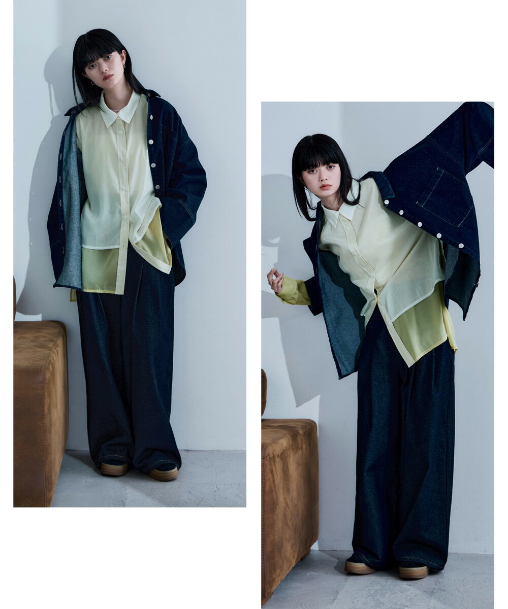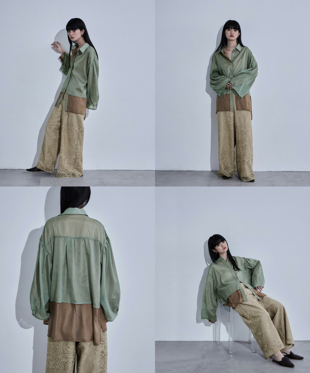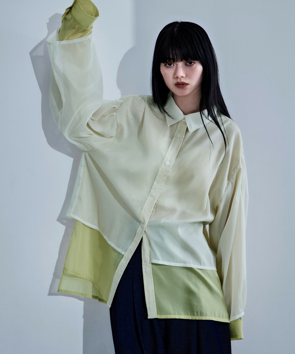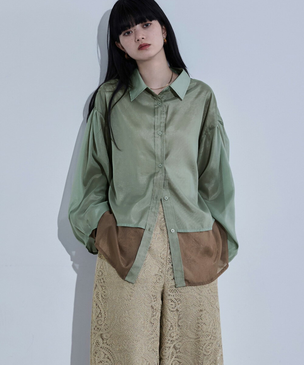 【全品8%オフクーポン!】ラメシアーレイヤードバイカラーシャツ トップス シャツ ブラウス シアーシャツ 長袖 バイカラー カラーシャツ ビッグシルエット ドッキングシャツ 重ね着風 レイヤード 無地