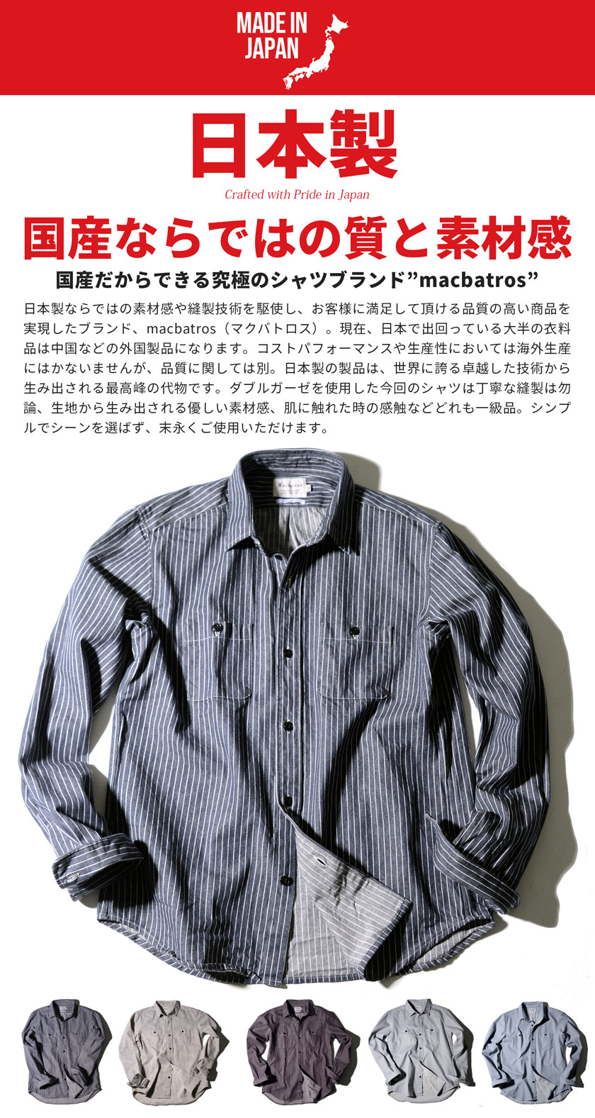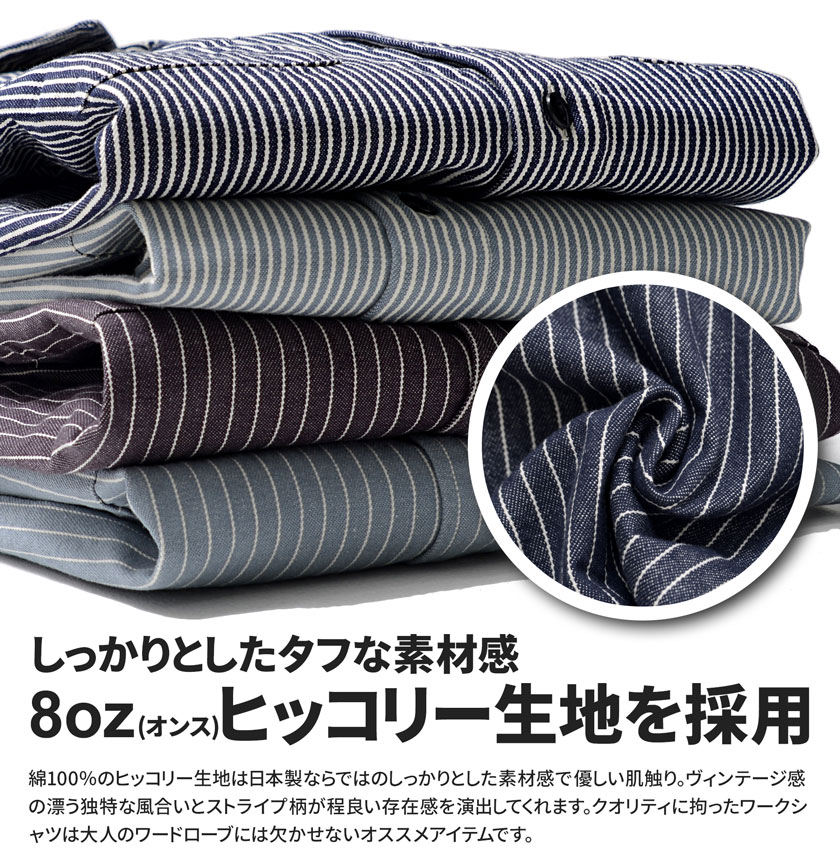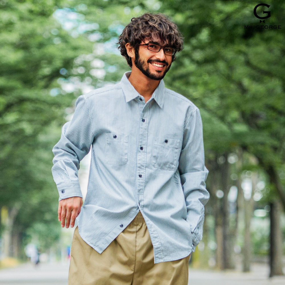ミスタージョージ【日本製】ヒッコリーシャツ メンズ ブランド オシャレ 長袖 国産 国内生産 ワークシャツ ストライプ柄 スリム 細身 綿100% ネイビー ホワイト 紺 白 おしゃれ 40代 大人 イケオジ ちょいワル 50代 60代